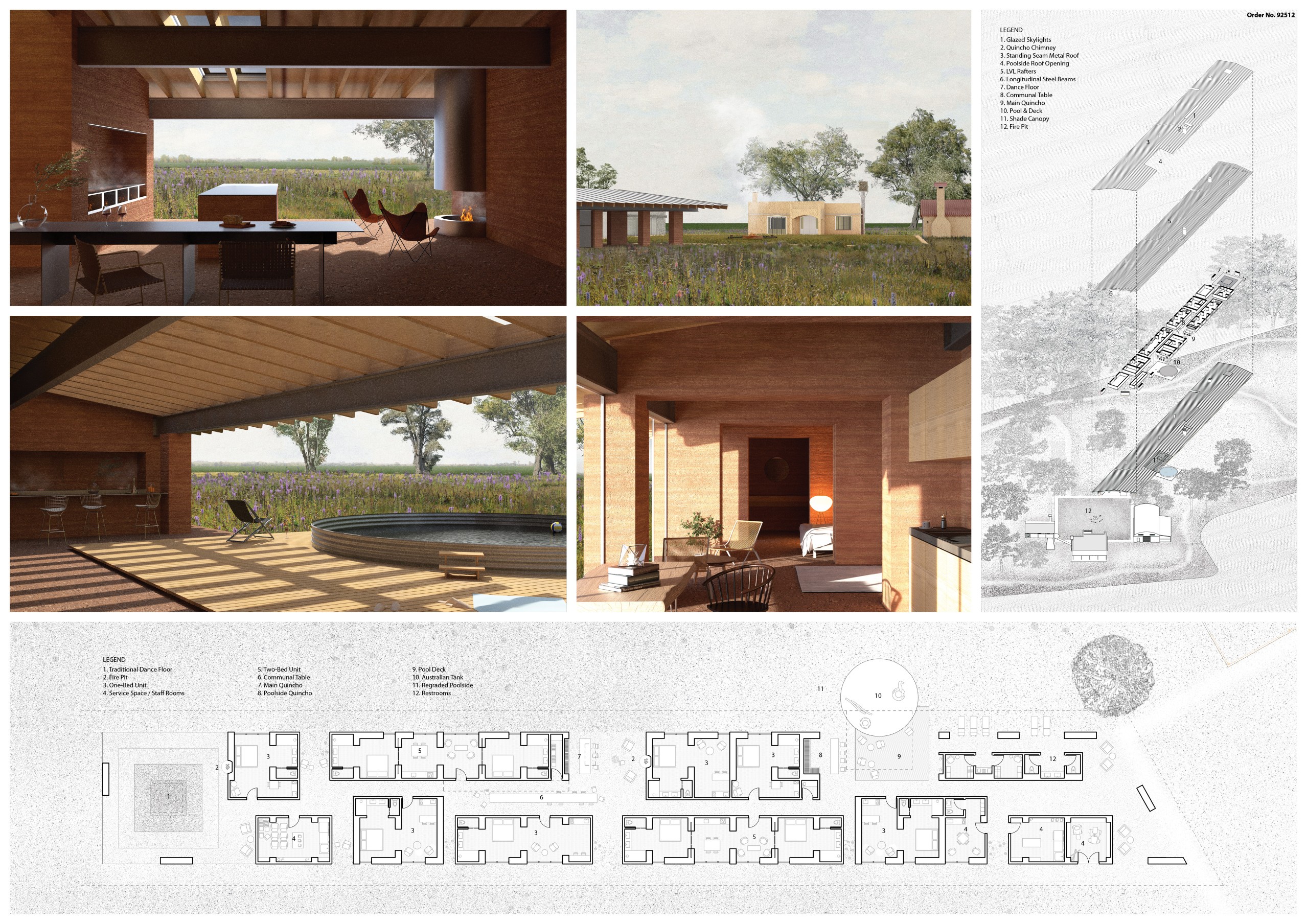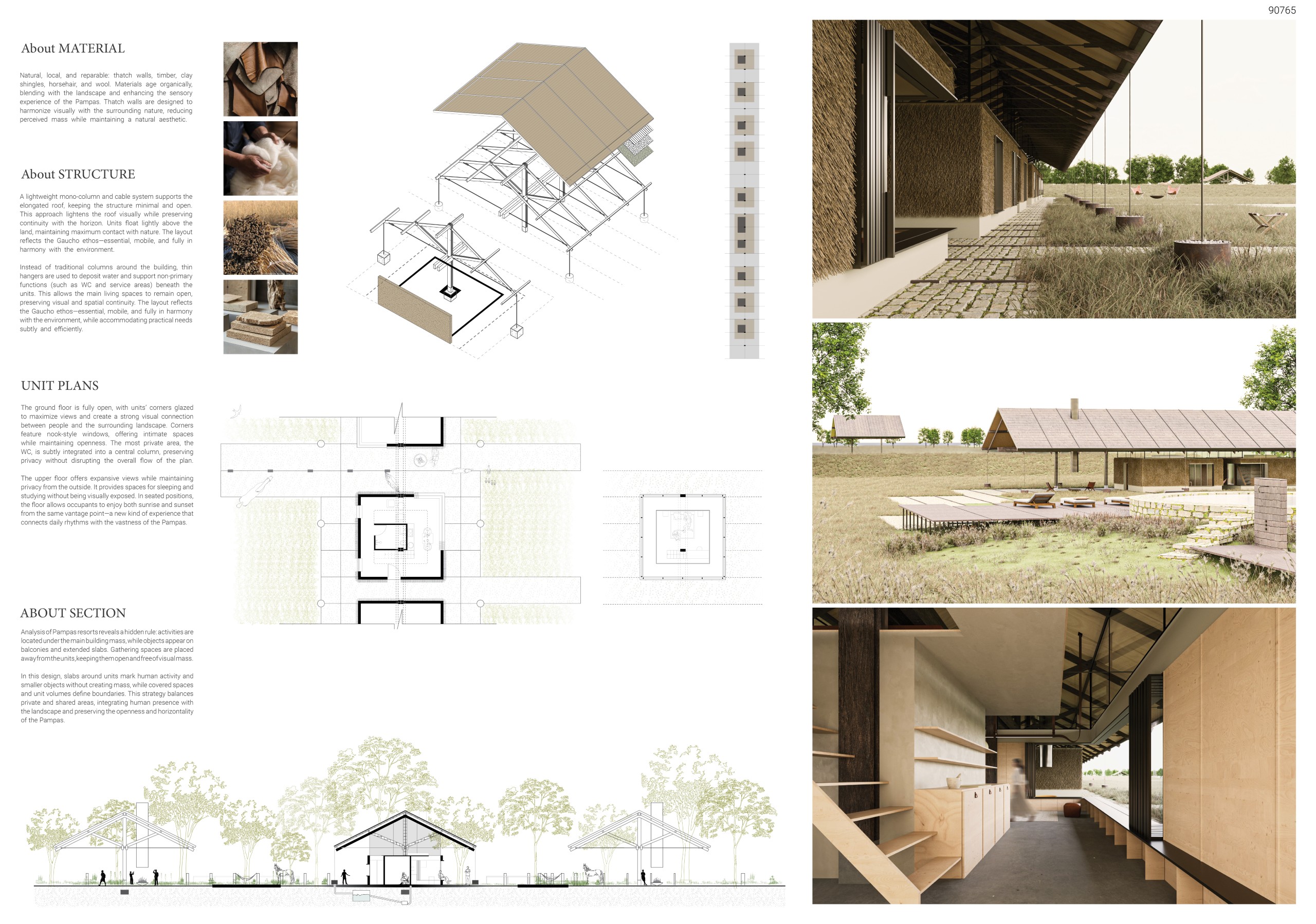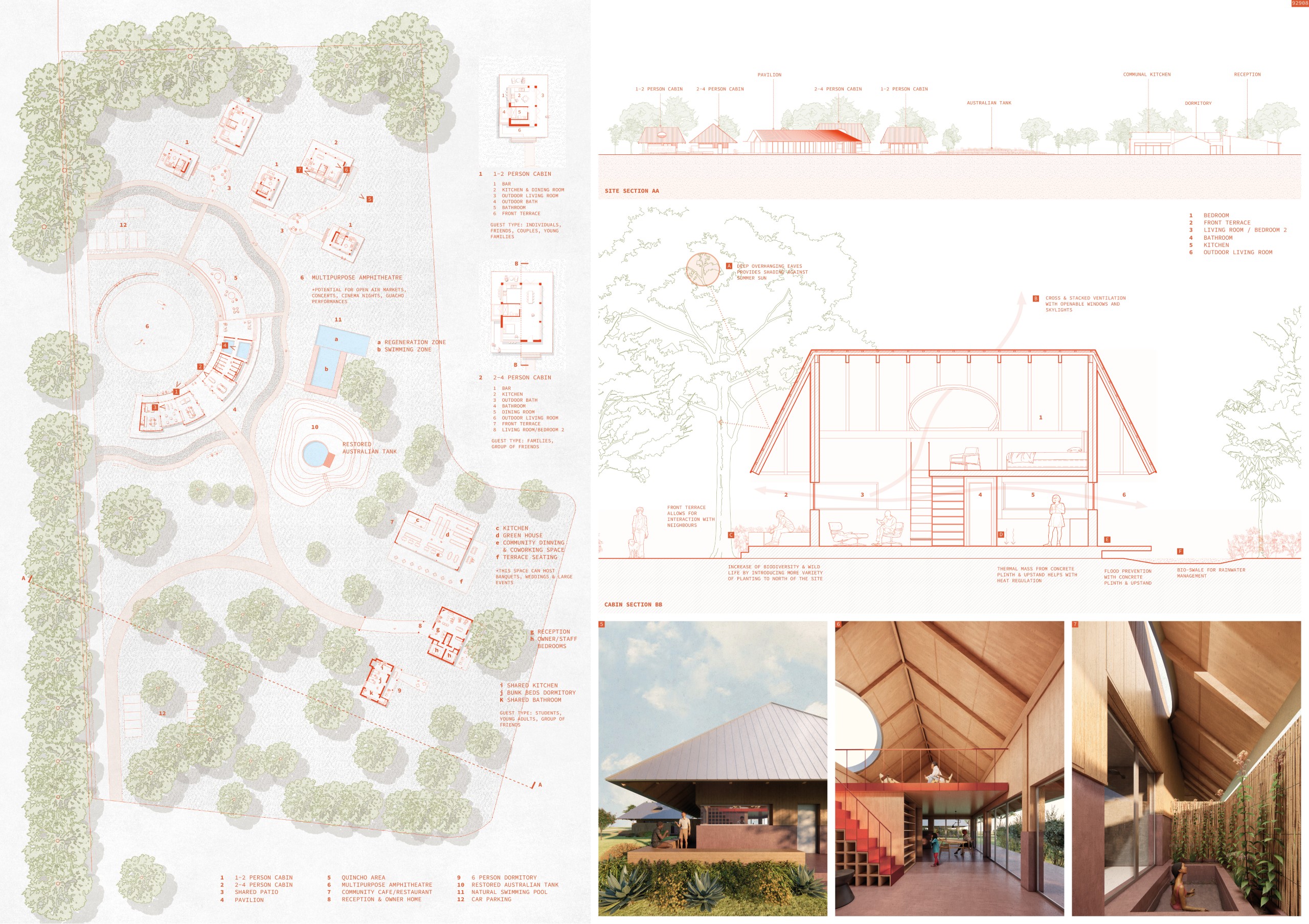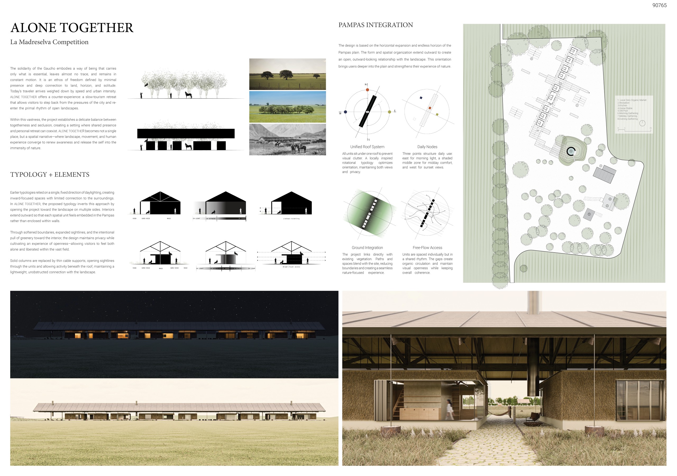 Breaking from traditional resort typologies that favor inward-focused spaces and singular daylighting, ALONE TOGETHER opens onto the landscape from multiple sides. Interiors extend outward, embedding each unit within the Pampas rather than isolating it within walls. Through softened boundaries, expansive sightlines, and the intentional integration of greenery, the design maintains privacy while cultivating openness, allowing guests to feel simultaneously alone and connected. Solid columns are replaced by slender cable supports, preserving visual continuity and enabling unobstructed activity beneath the roof, while reinforcing the lightweight, essential quality of the architecture.