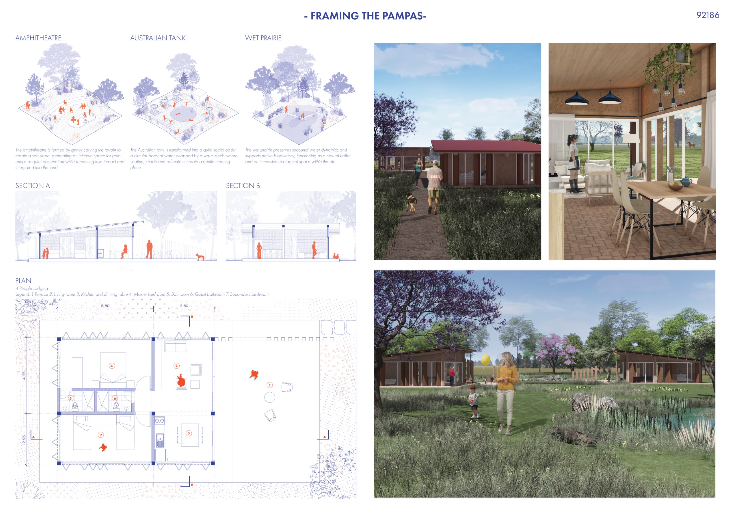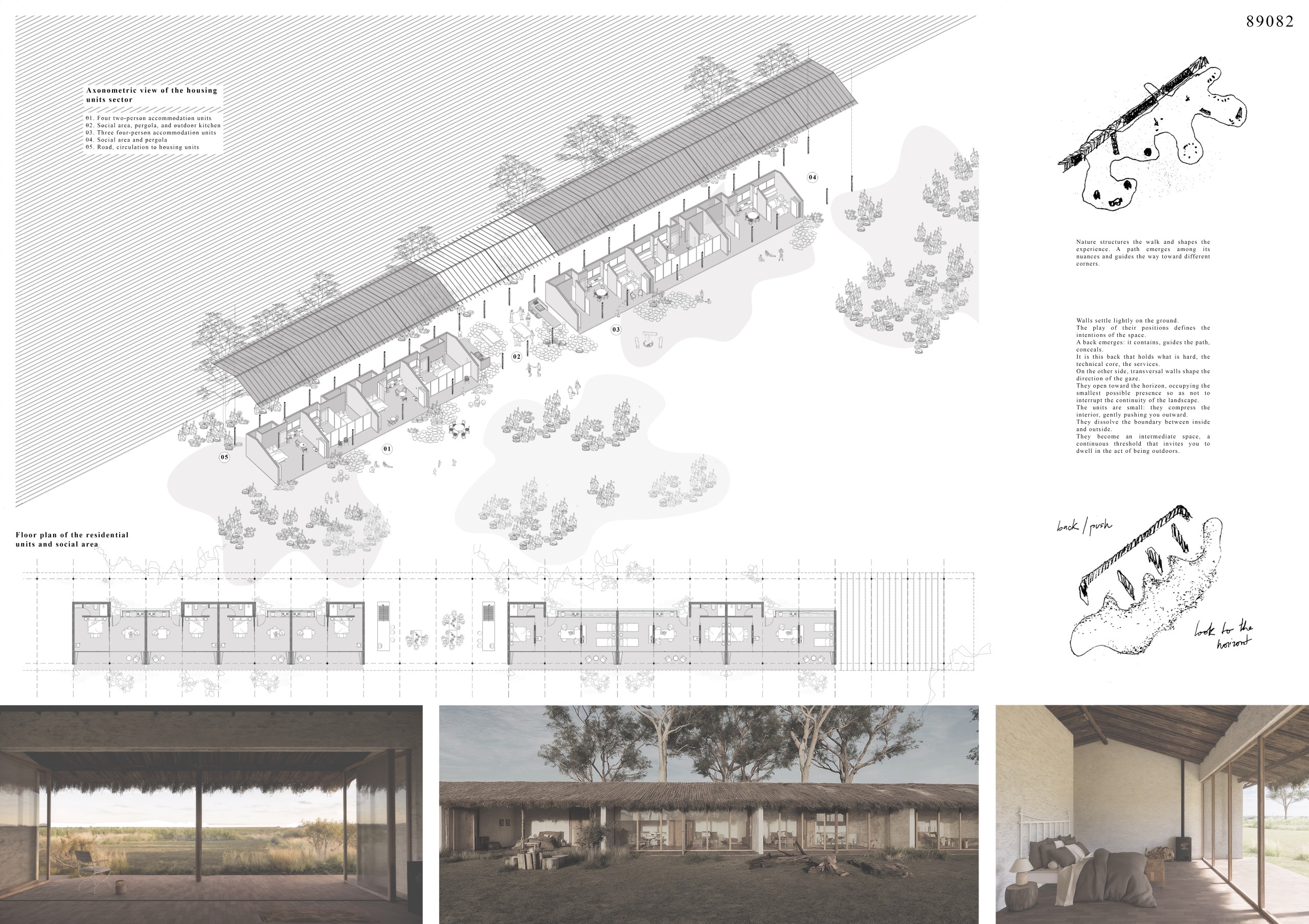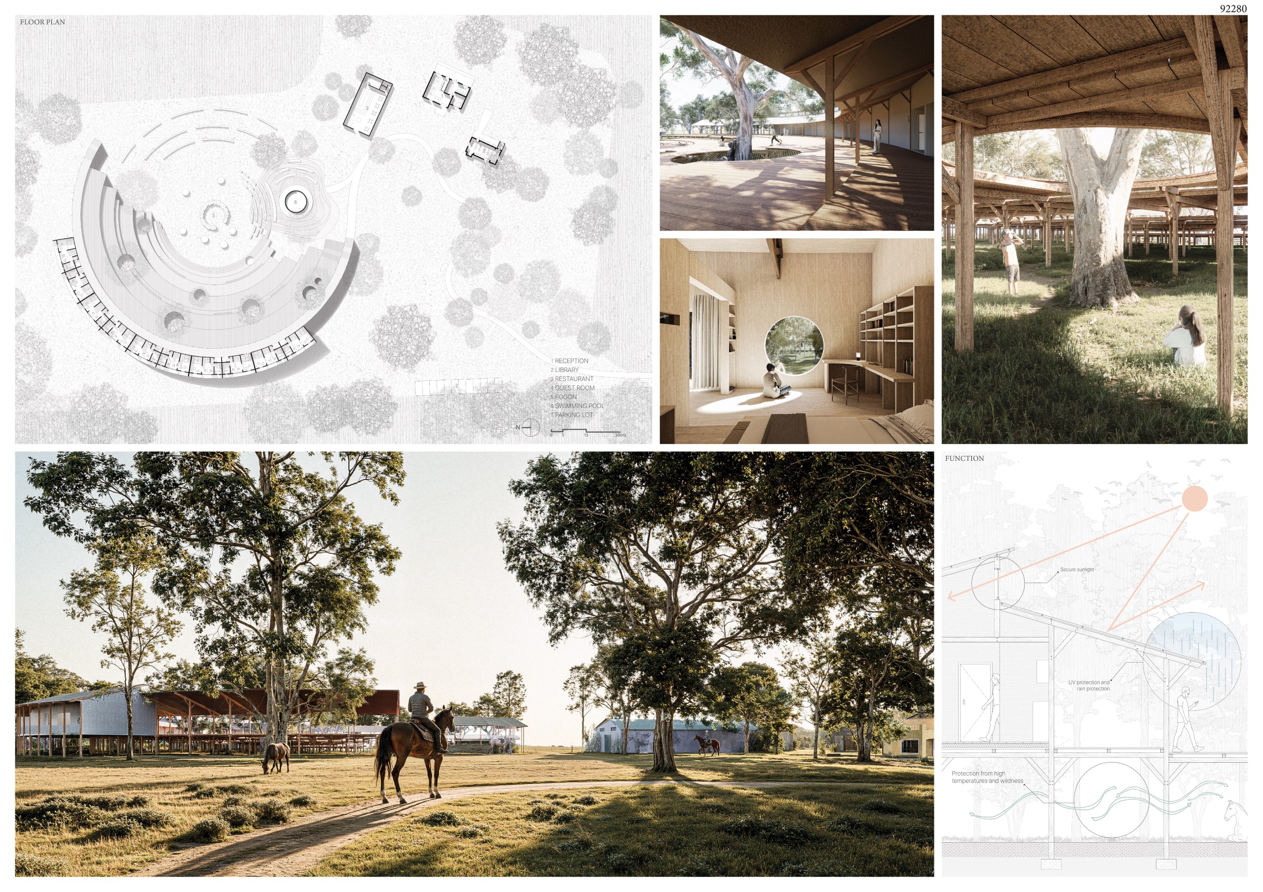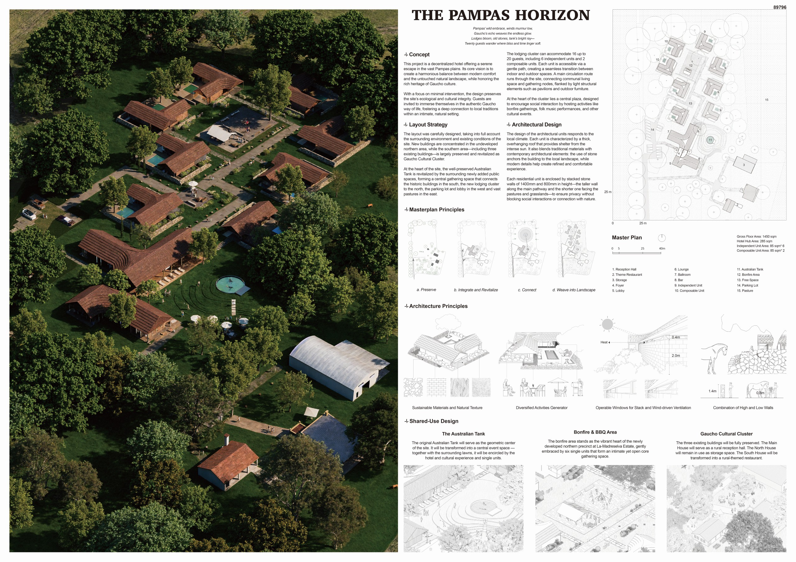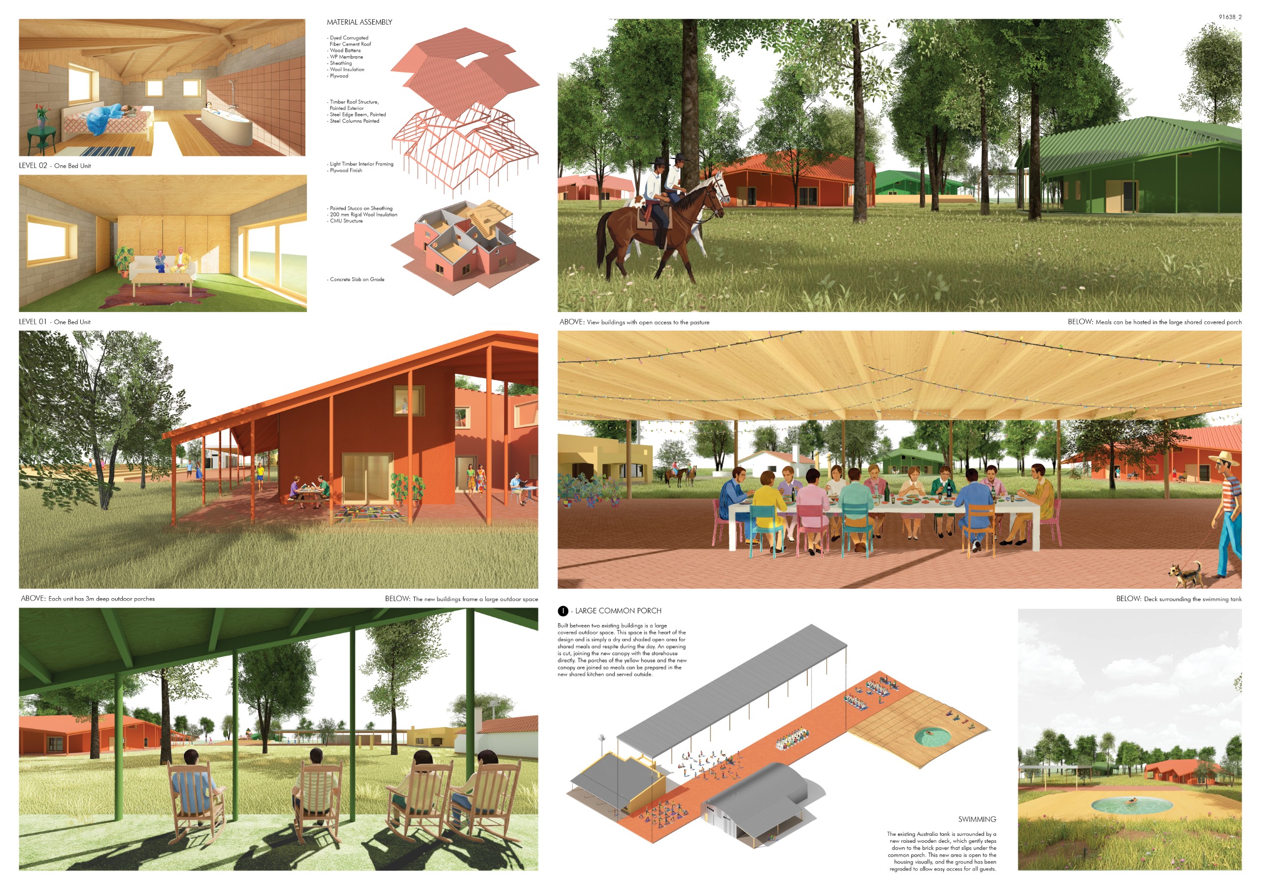 Breaking from traditional resort typologies that favor inward-focused spaces and singular daylighting, ALONE TOGETHER opens onto the landscape from multiple sides. Interiors extend outward, embedding each unit within the Pampas rather than isolating it within walls. Through softened boundaries, expansive sightlines, and the intentional integration of greenery, the design maintains privacy while cultivating openness, allowing guests to feel simultaneously alone and connected. Solid columns are replaced by slender cable supports, preserving visual continuity and enabling unobstructed activity beneath the roof, while reinforcing the lightweight, essential quality of the architecture.