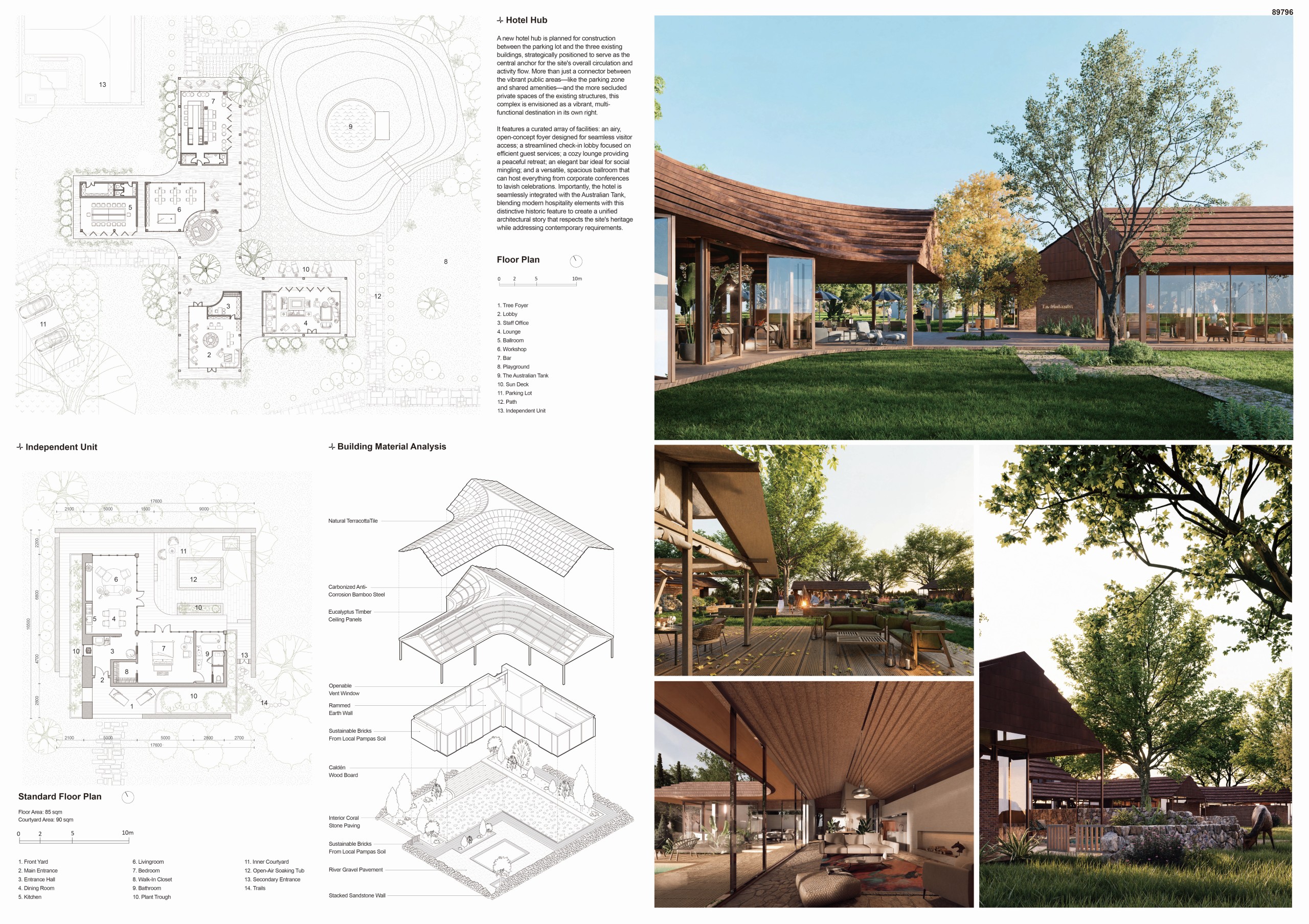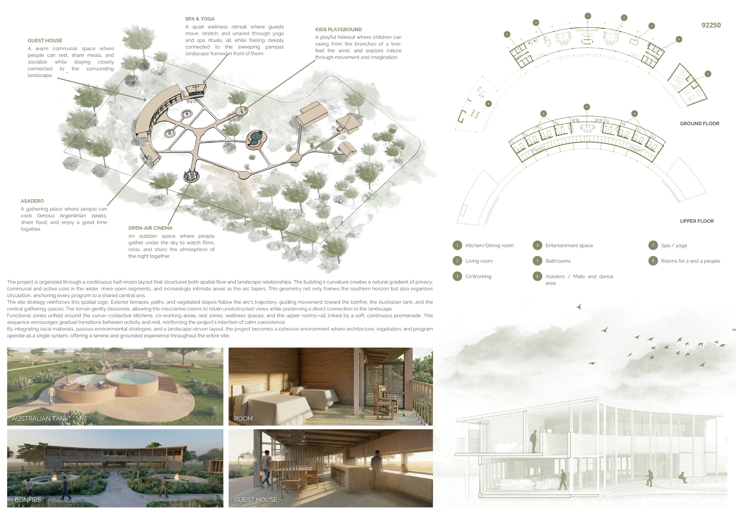 Contrastingly, the new Social Pavilion emerges as the vibrant center of collective life. Organized around a great central hearth, it celebrates fire as the eternal soul of the living tradition. Extending outwards, a new North-facing Solarium embraces the existing Australian tank, respecting its original topography. This sunny platform functions as a vital connector—a “planned space for unplanned interactions” where locals and travelers converge naturally.