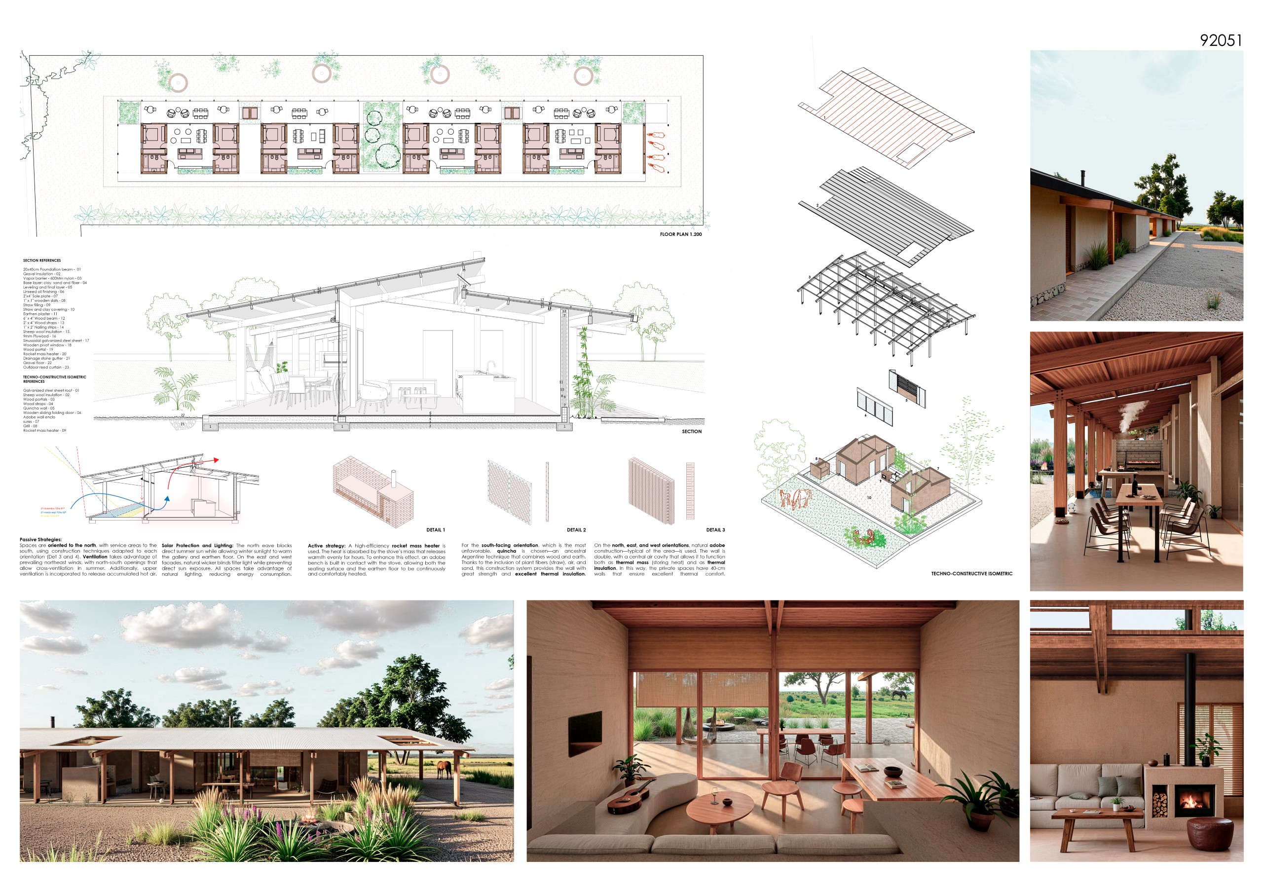 Around the timber core, a thick clay envelope is constructed using a timber-frame system with rammed-earth infill and clay columns, forming walls 400 mm thick. Local and sustainable, this material breathes, stabilizes temperature, buffers sound, and connects the buildings directly to the soil of the Pampas.