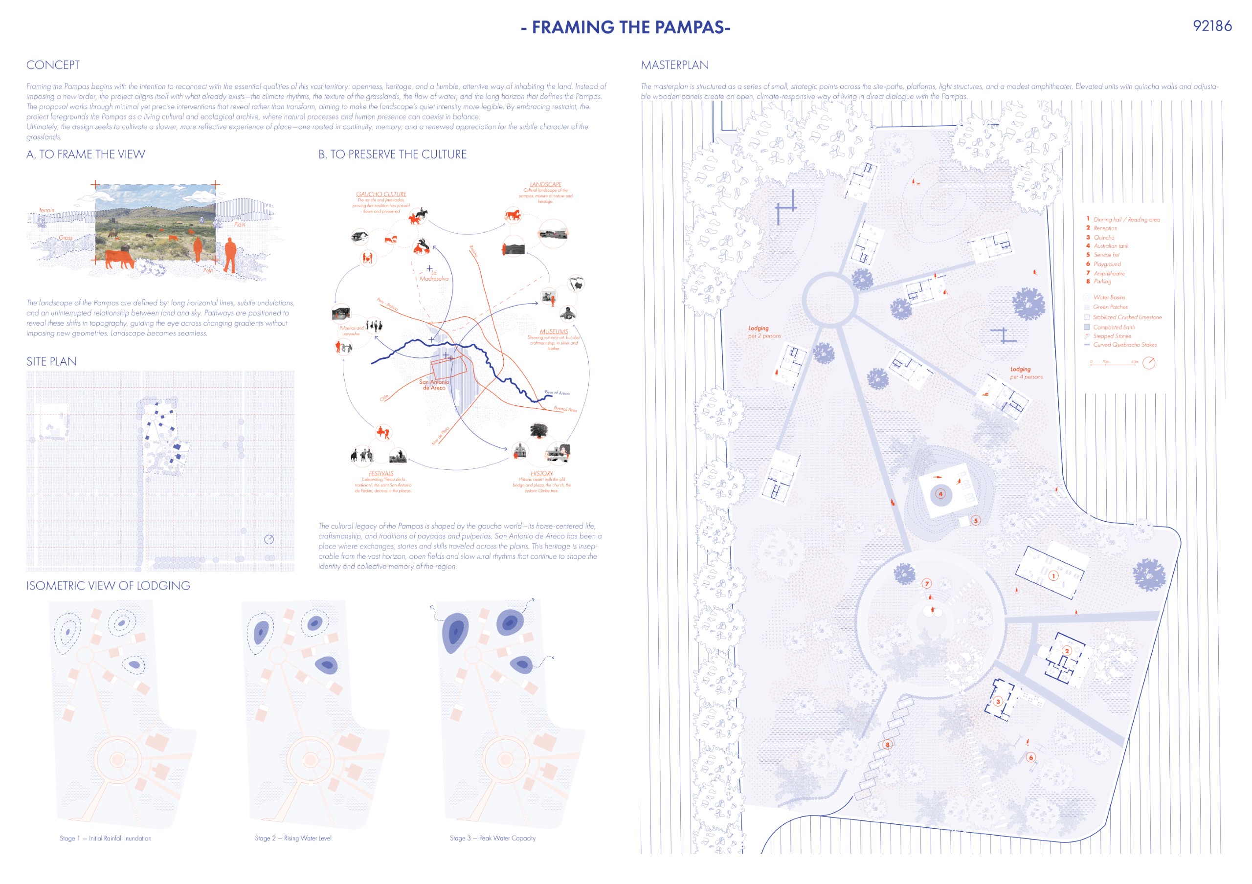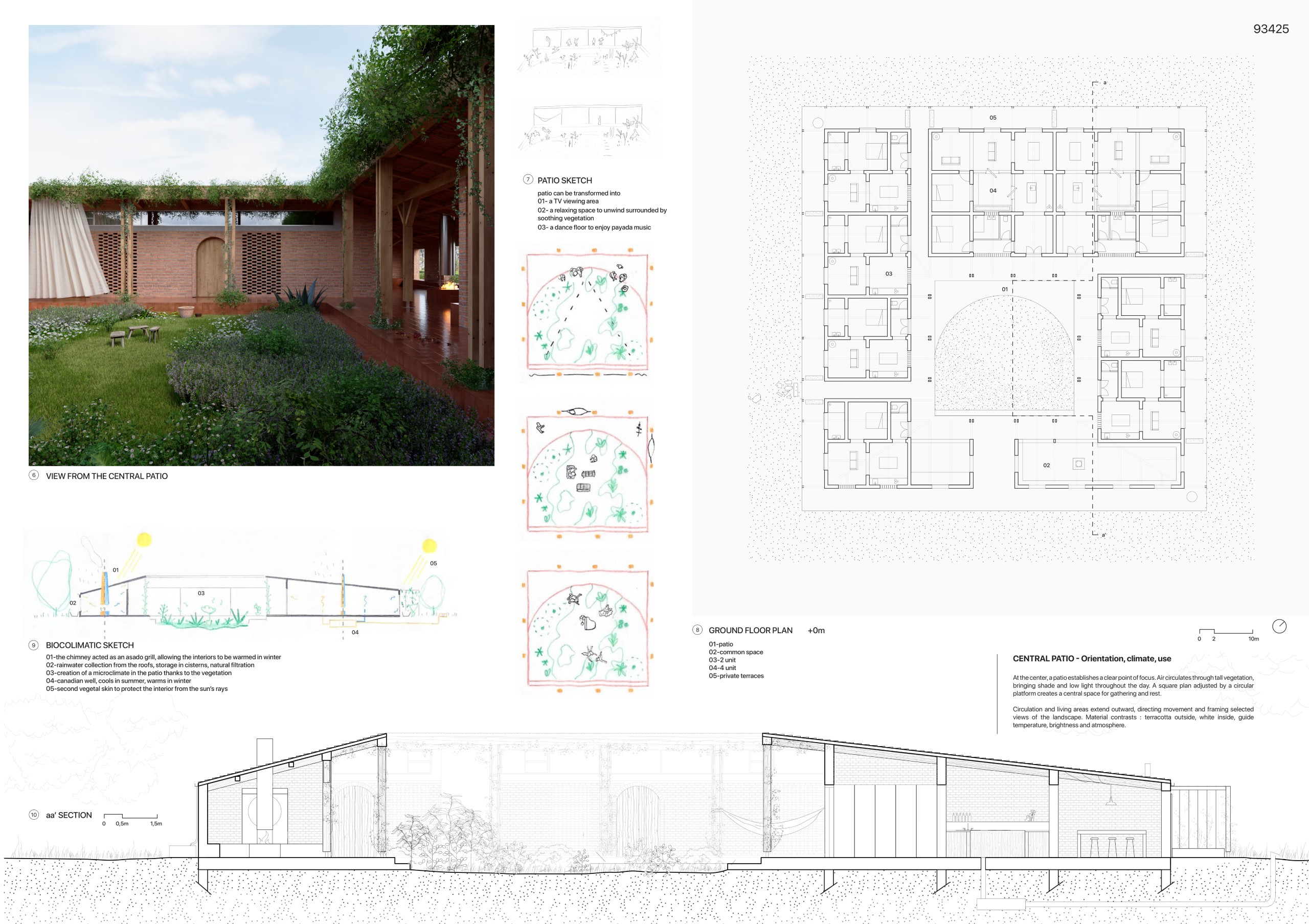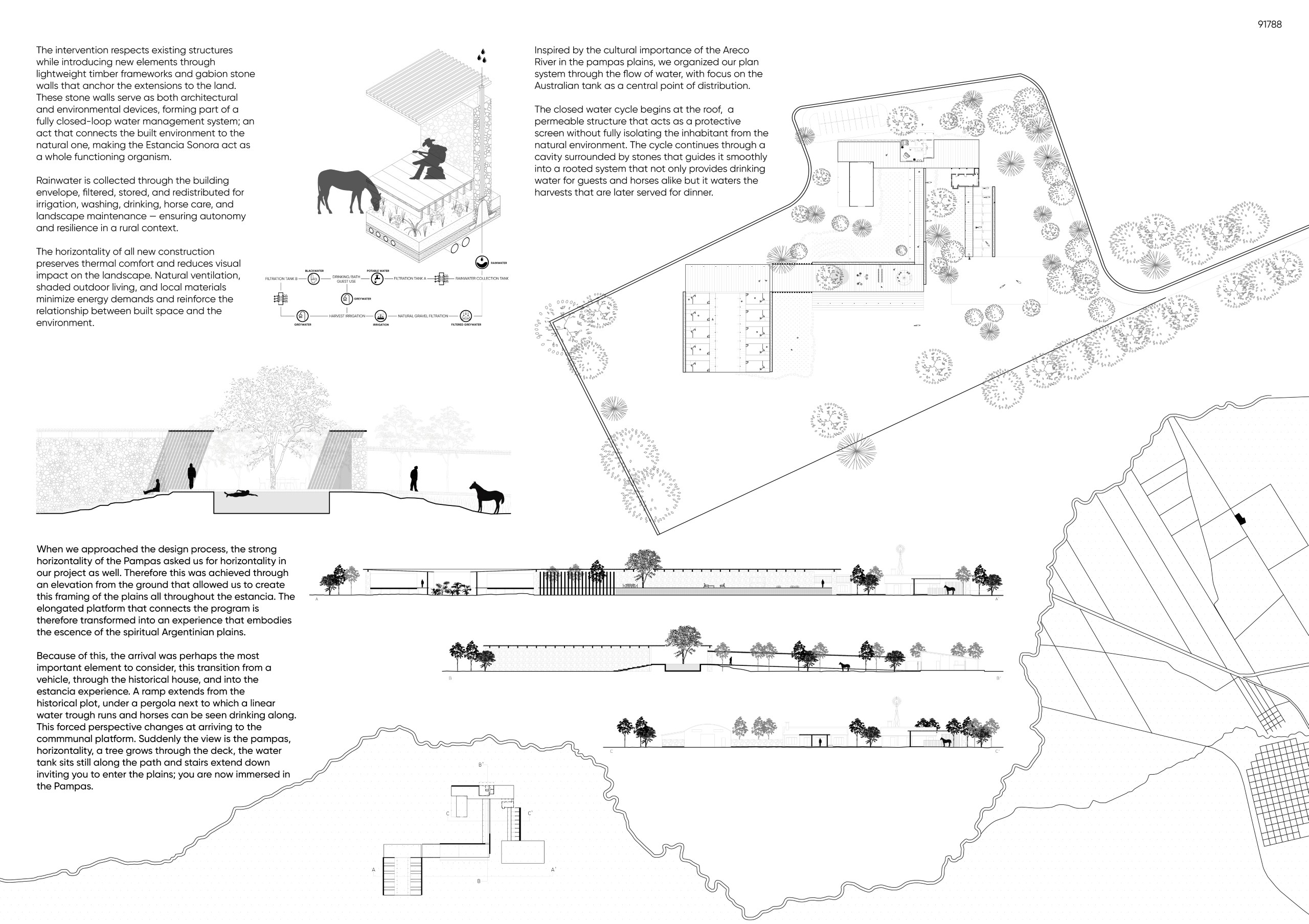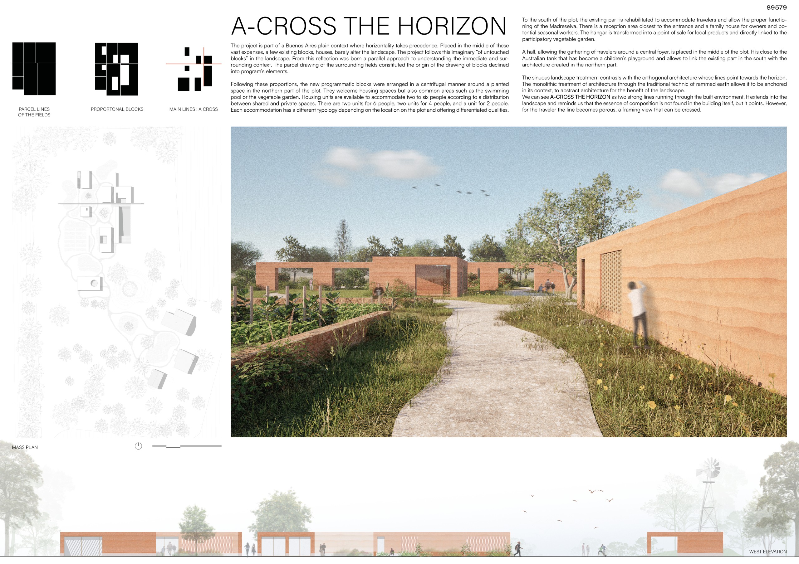 Our proposal acts as an anti-city. It transforms the typical hierarchy and inverts the urban block, turning the vast pampas into an intimate private landscape and shifting collective activity into an inward-facing courtyard.
