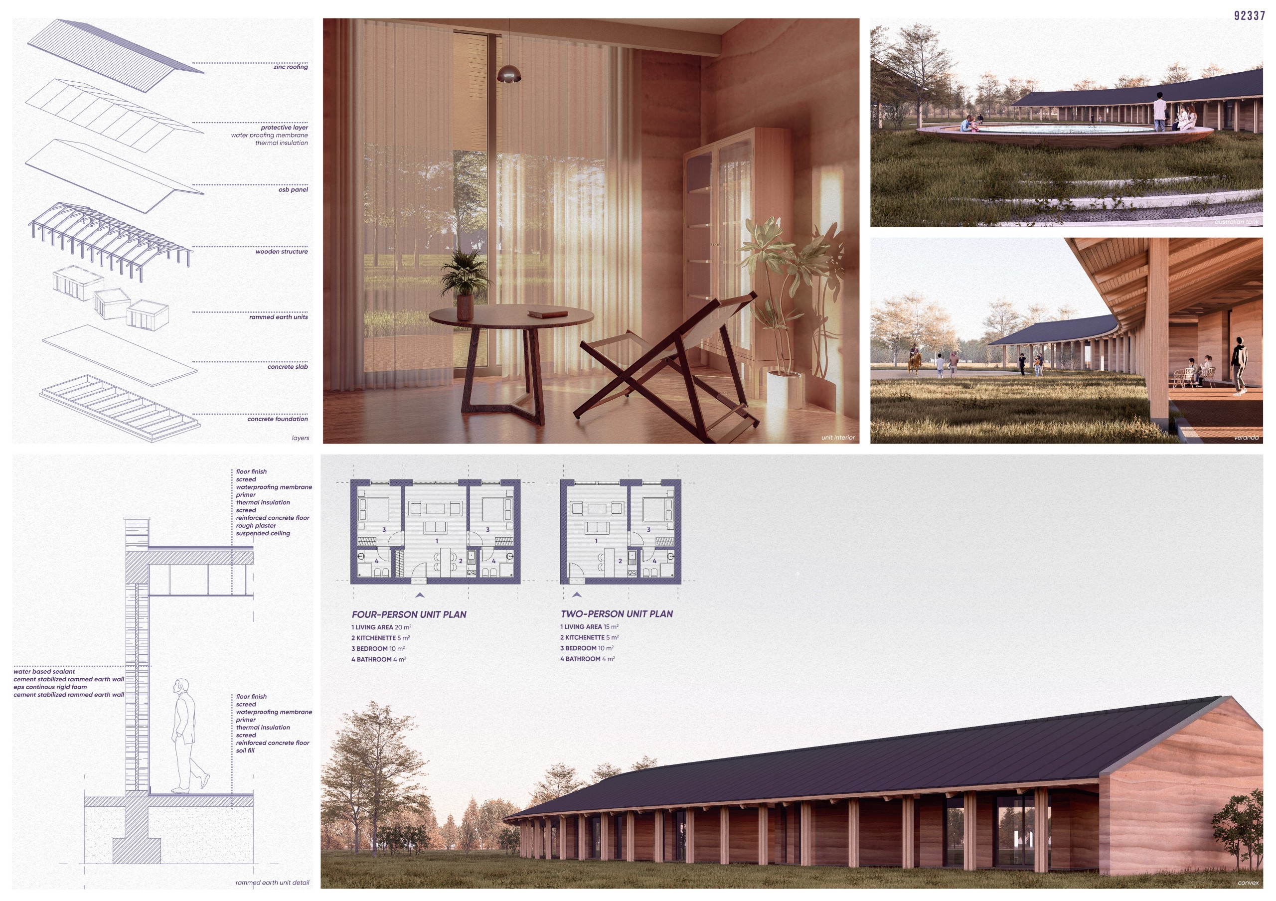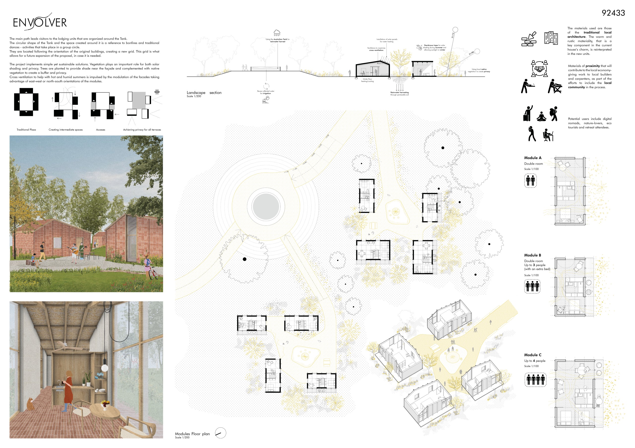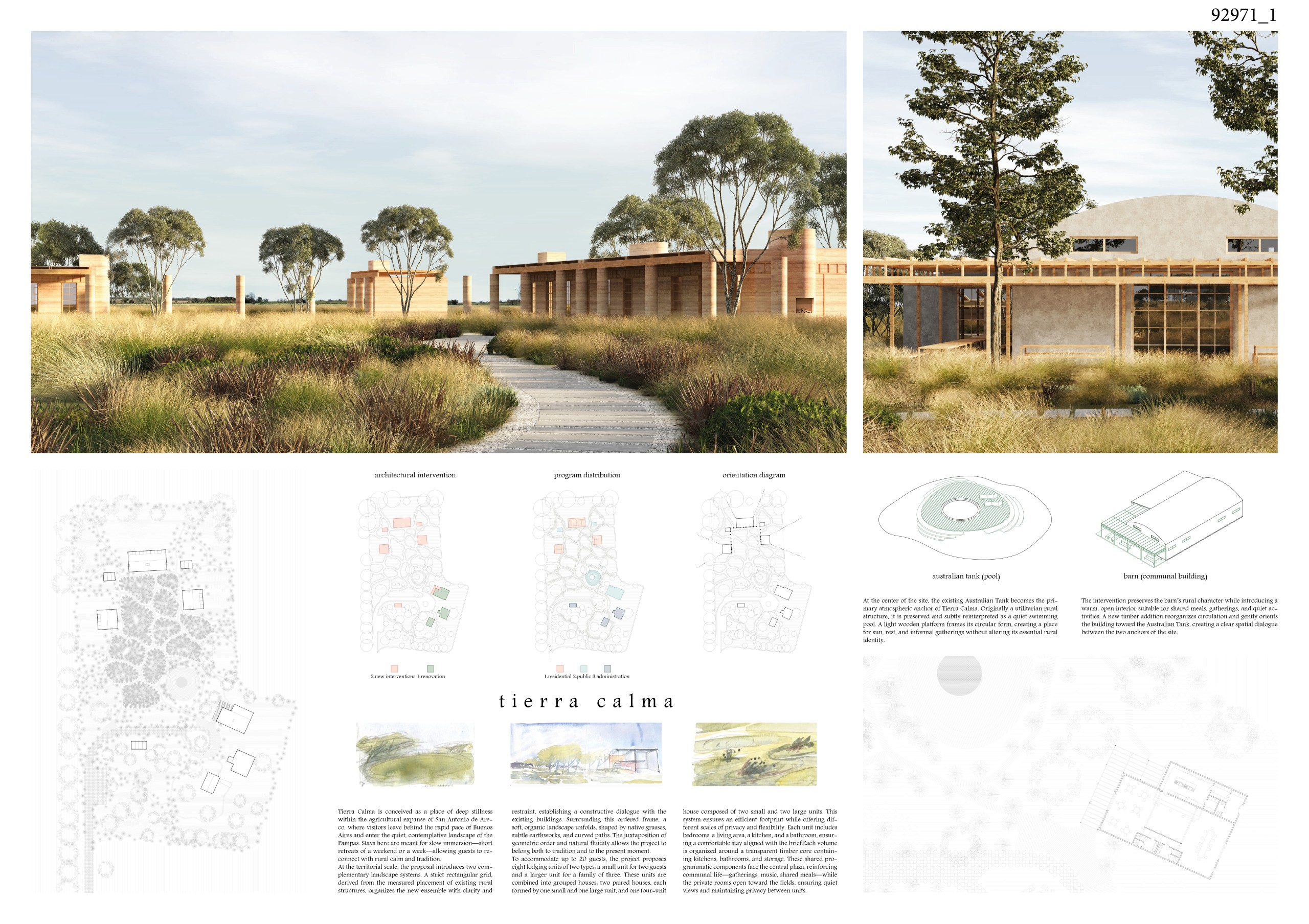 The Australian Tank, preserved and enhanced with a light wooden platform, becomes the quiet center of the site. Opposite it, the existing barn is renovated and extended into a welcoming communal building for shared meals, informal gatherings, and cultural exchange.