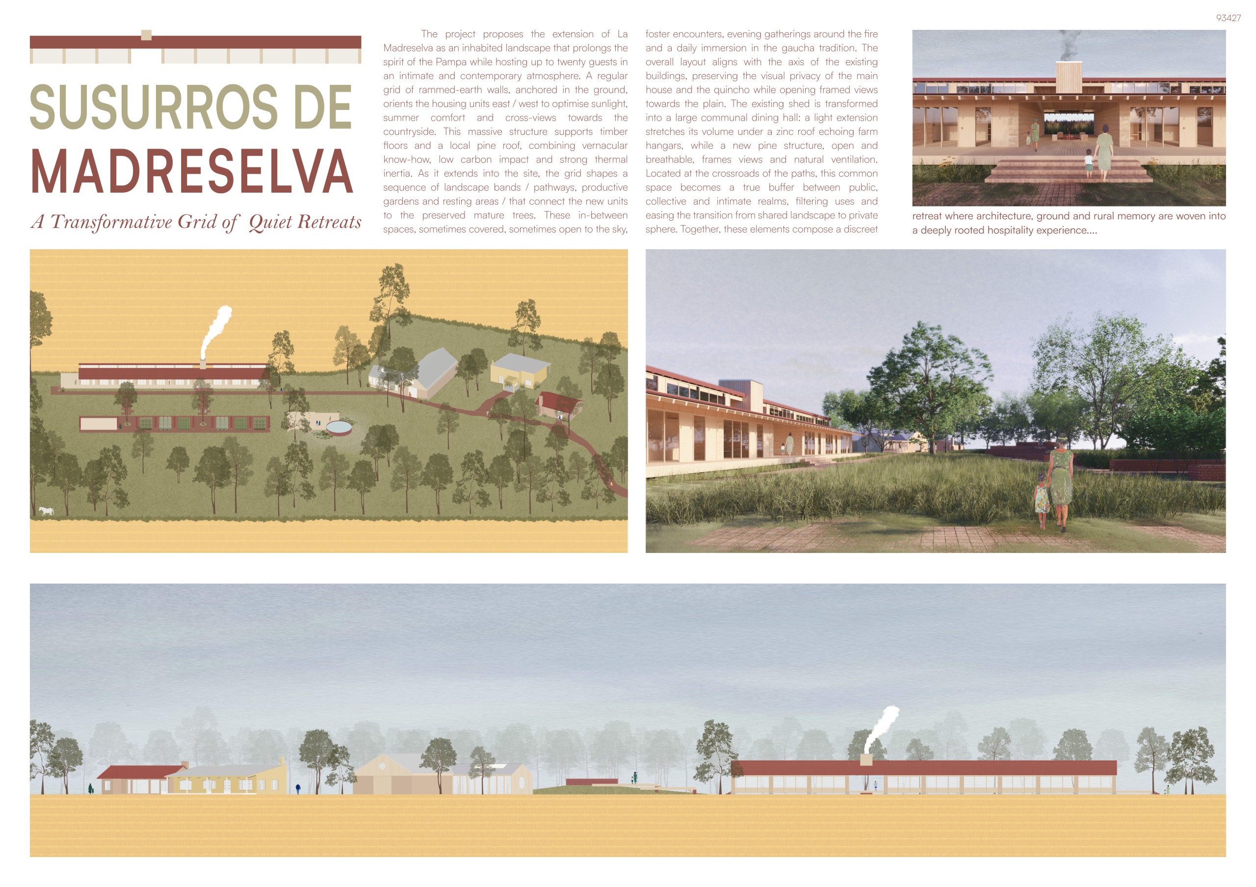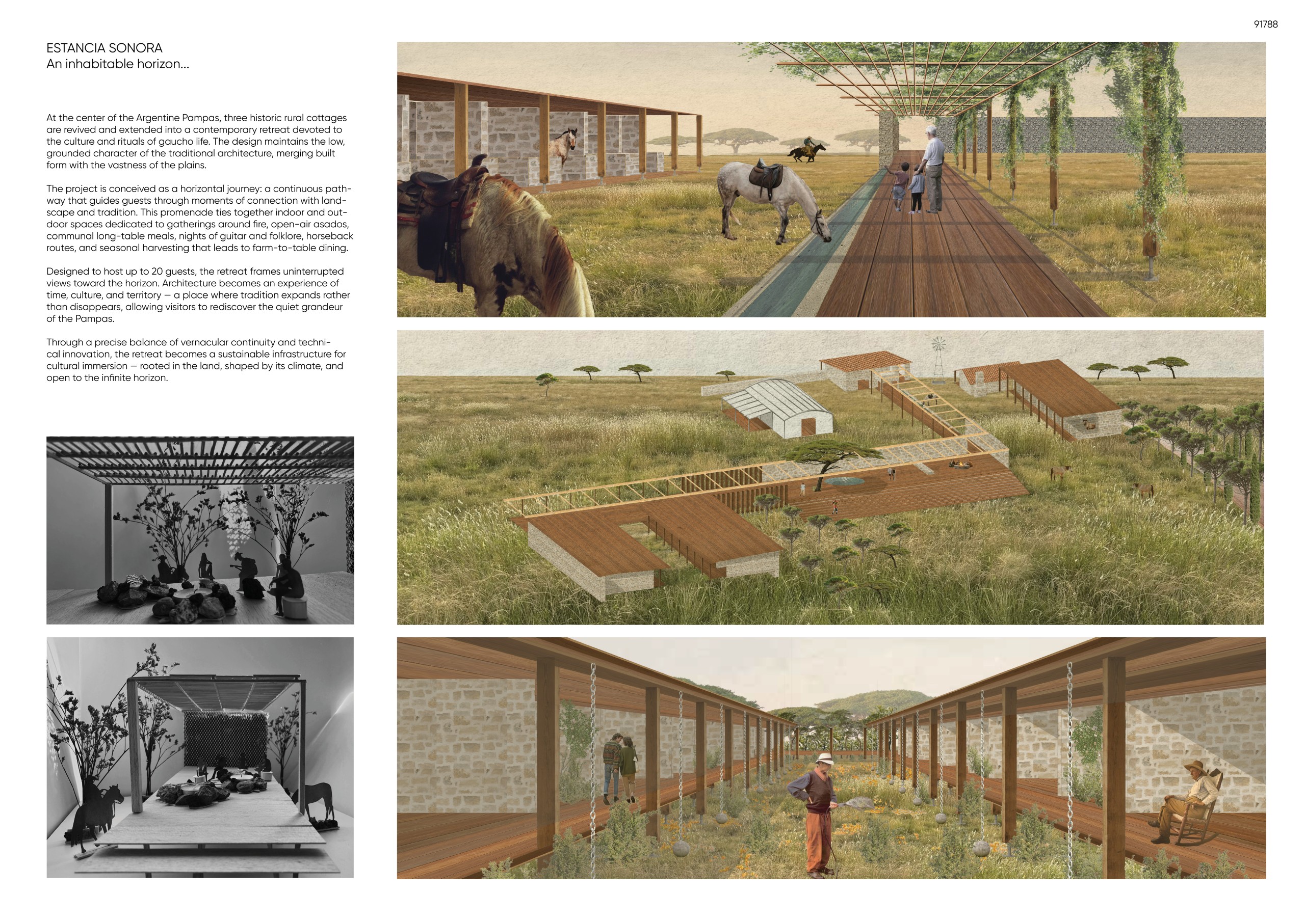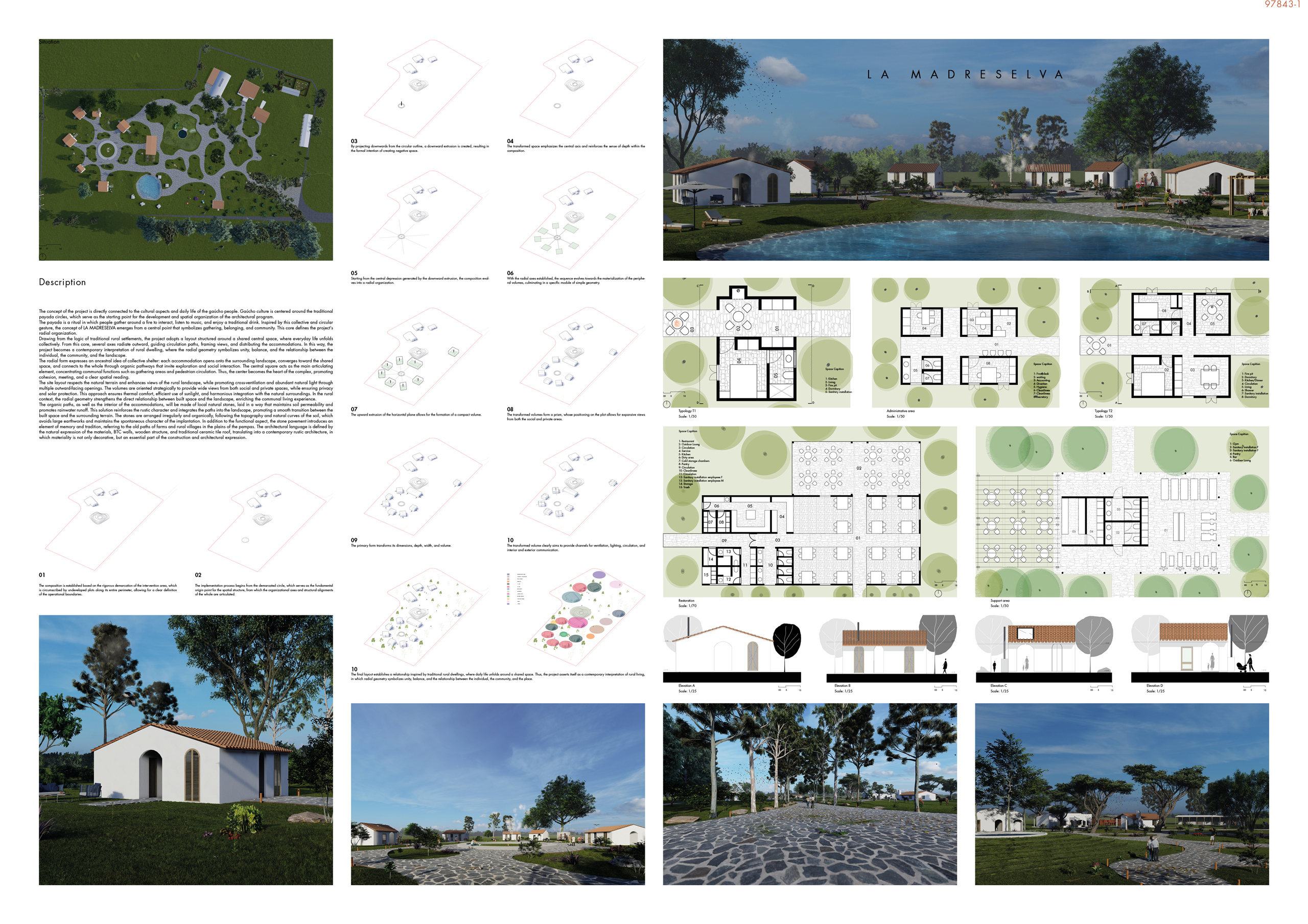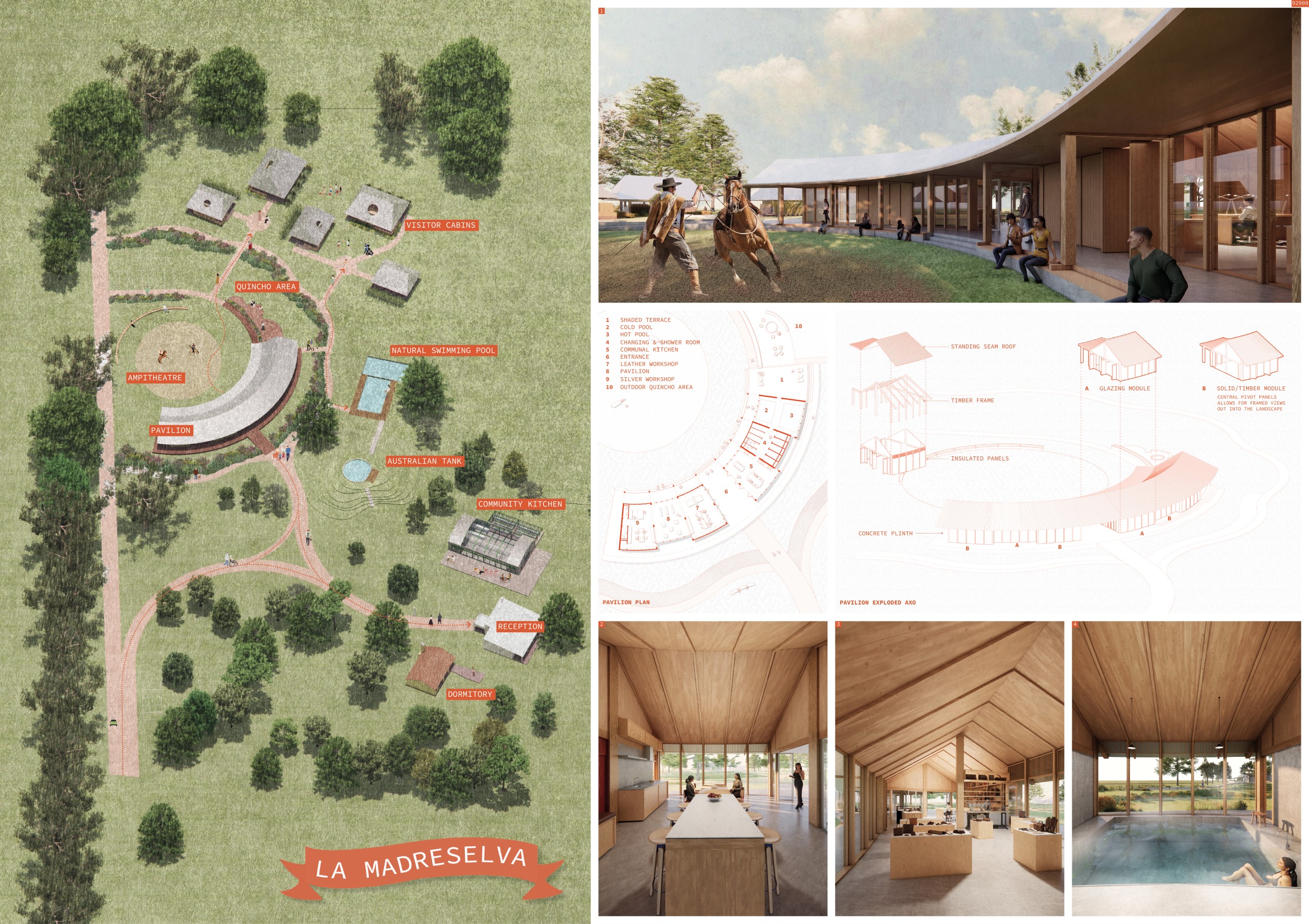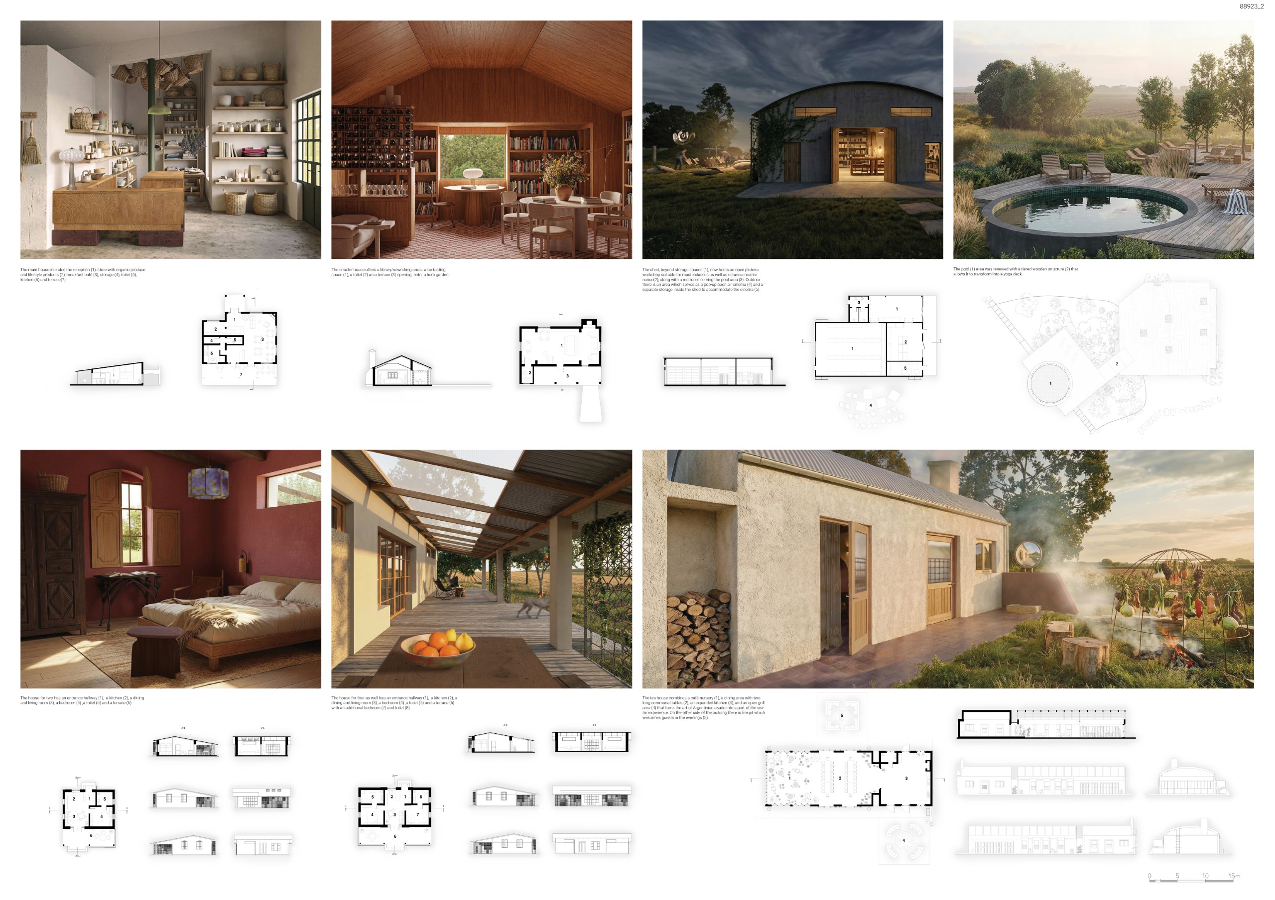 “La Madreselva” invited participants to envision the expansion of a distinctive rural retreat set within the Argentine Pampas, with the aim of accommodating up to 20 guests while preserving the site’s intimate and authentic character. The competition called for the design of small-scale lodging units capable of integrating harmoniously with the surrounding landscape through sensitive material choices and sustainable design principles. More than a simple hospitality project, the challenge encouraged a meaningful dialogue between past and present, connecting new architectural interventions with the existing structures and the vast rural context. Participants were free to explore a wide range of spatial strategies, from repeatable units to flexible systems or clustered configurations, allowing architecture to respond organically to both use and place.