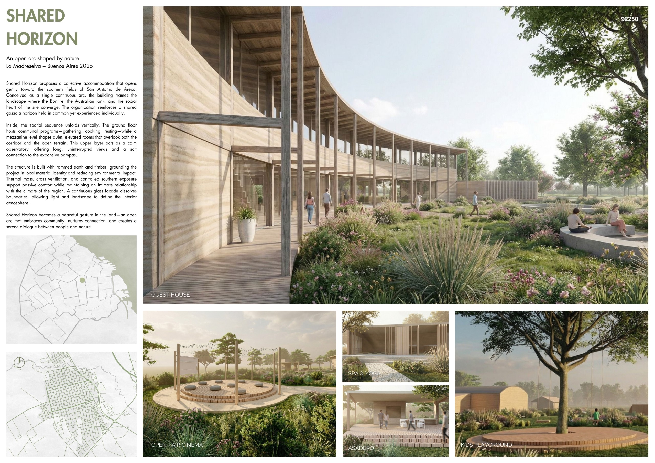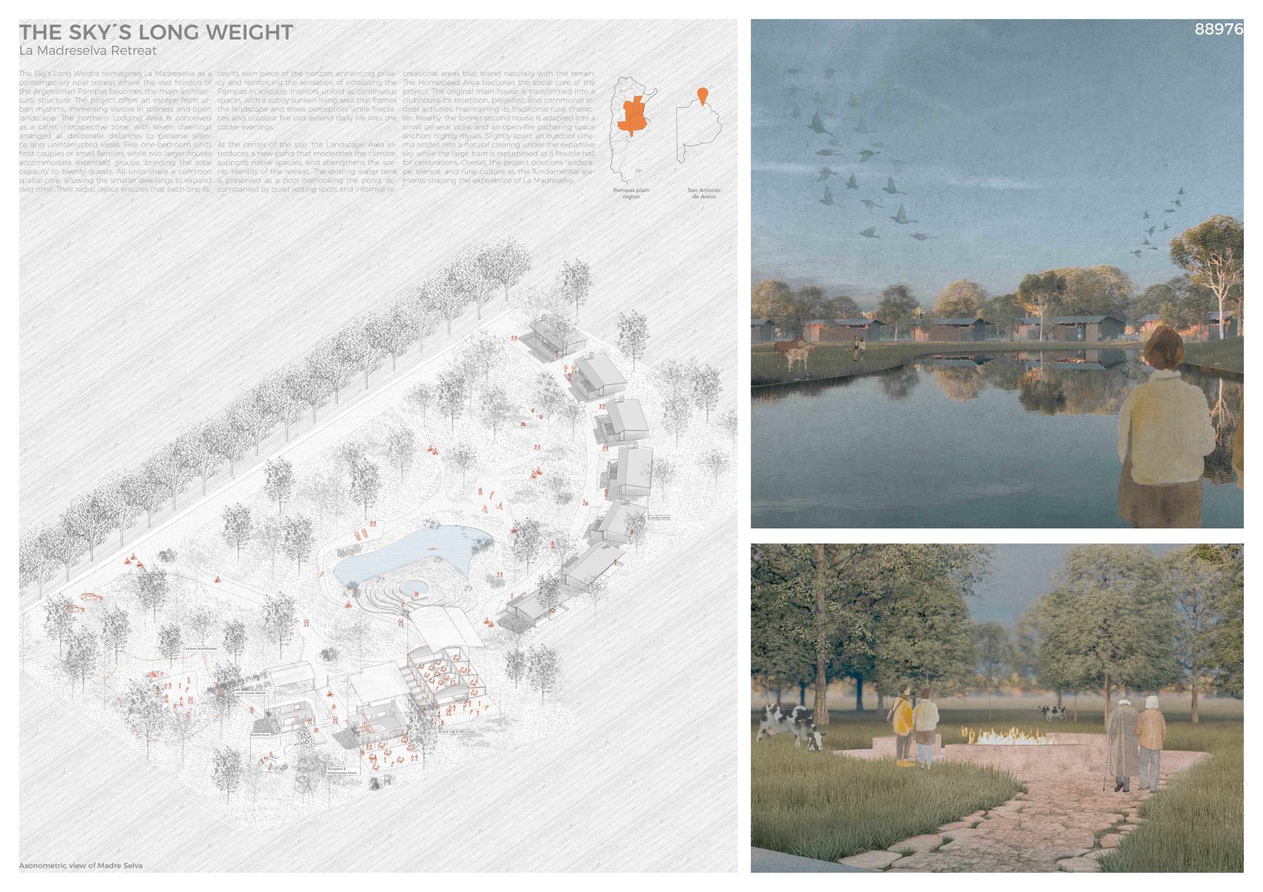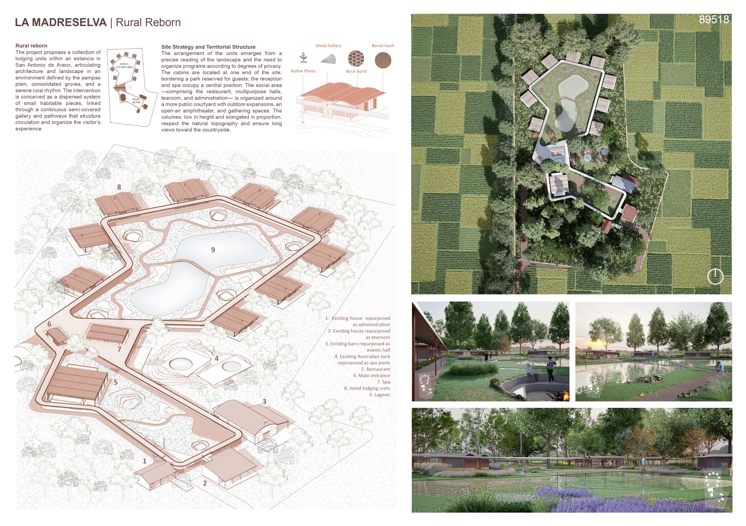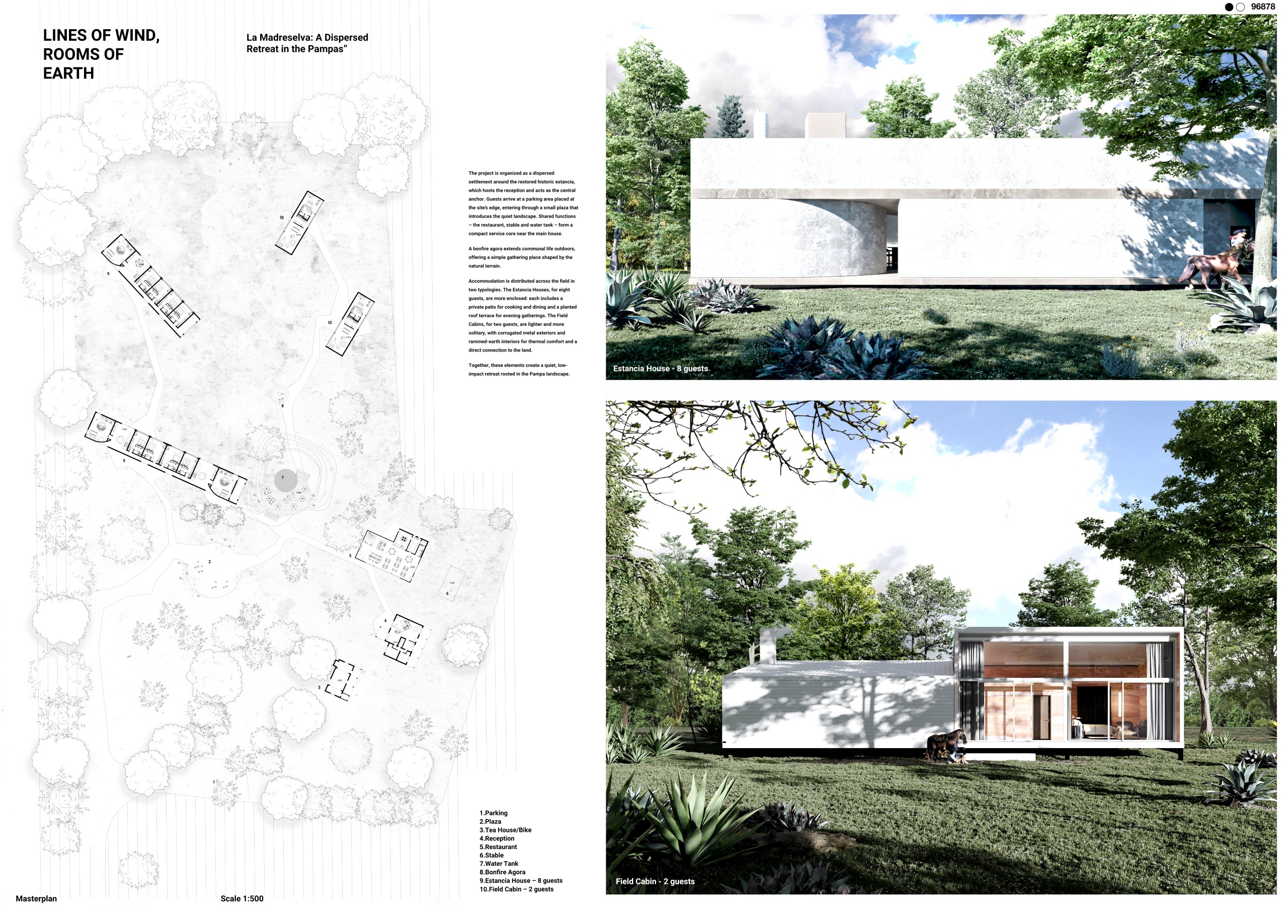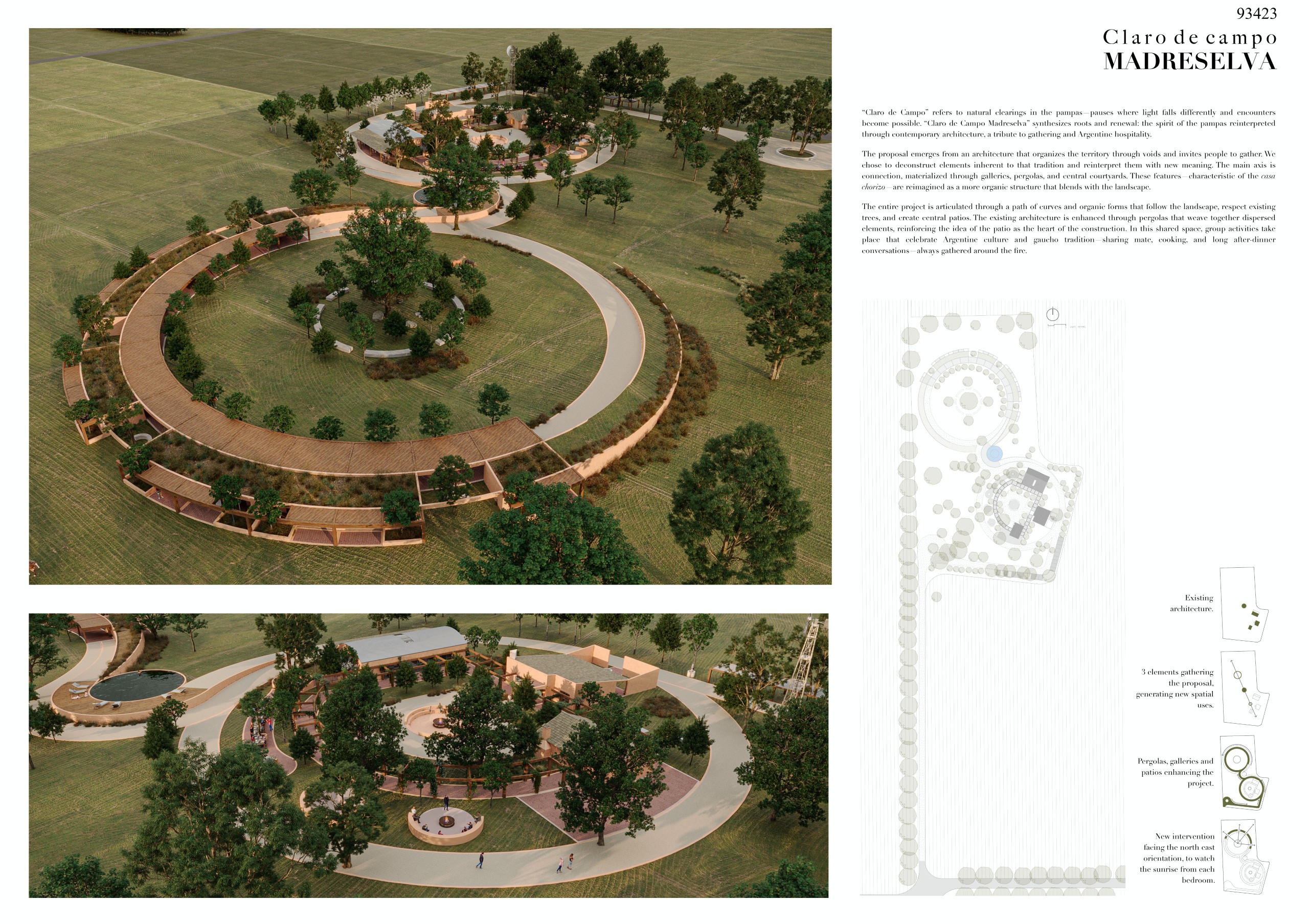 “La Madreselva” invited participants to envision the expansion of a distinctive rural retreat set within the Argentine Pampas, with the aim of accommodating up to 20 guests while preserving the site’s intimate and authentic character. The competition called for the design of small-scale lodging units capable of integrating harmoniously with the surrounding landscape through sensitive material choices and sustainable design principles. More than a simple hospitality project, the challenge encouraged a meaningful dialogue between past and present, connecting new architectural interventions with the existing structures and the vast rural context. Participants were free to explore a wide range of spatial strategies, from repeatable units to flexible systems or clustered configurations, allowing architecture to respond organically to both use and place.