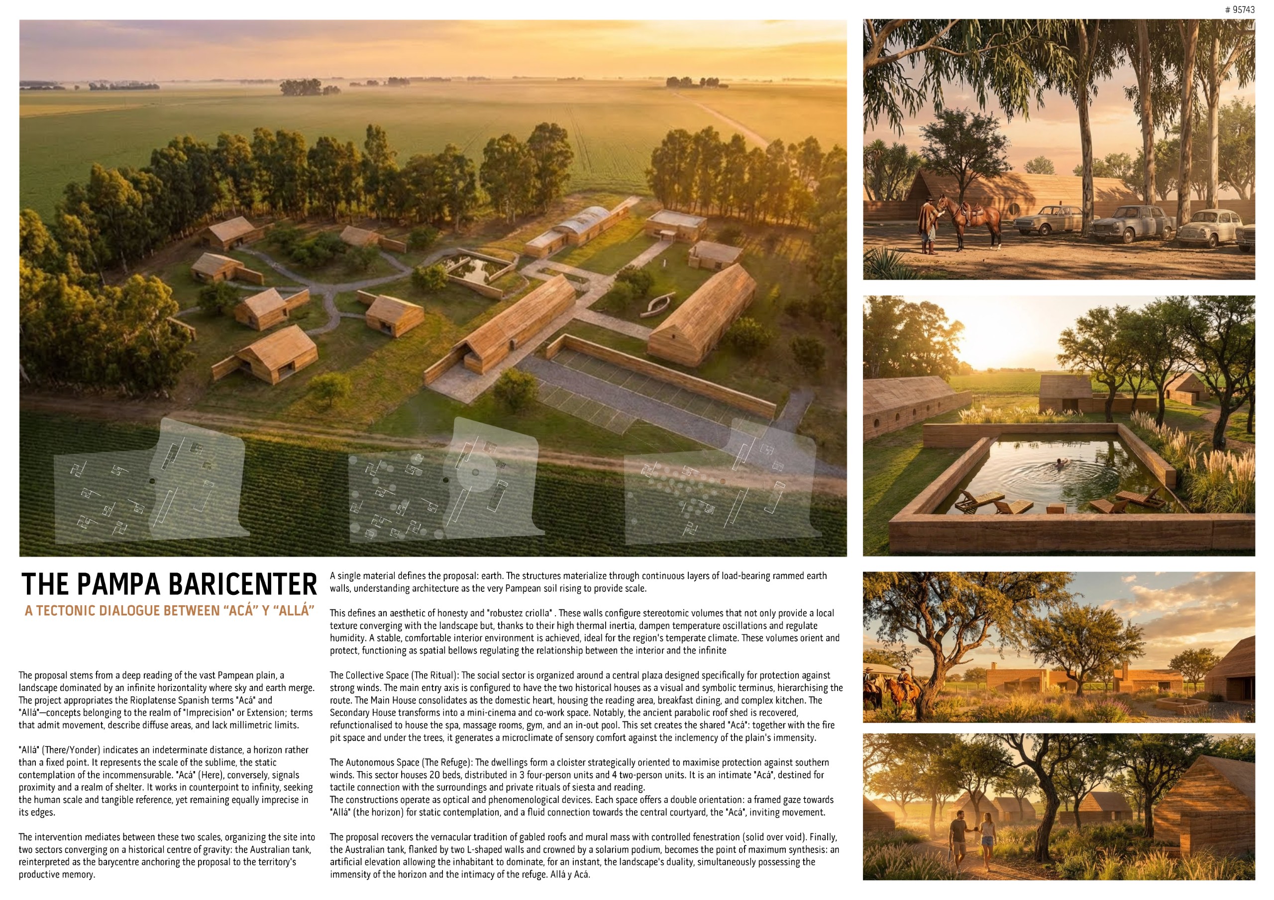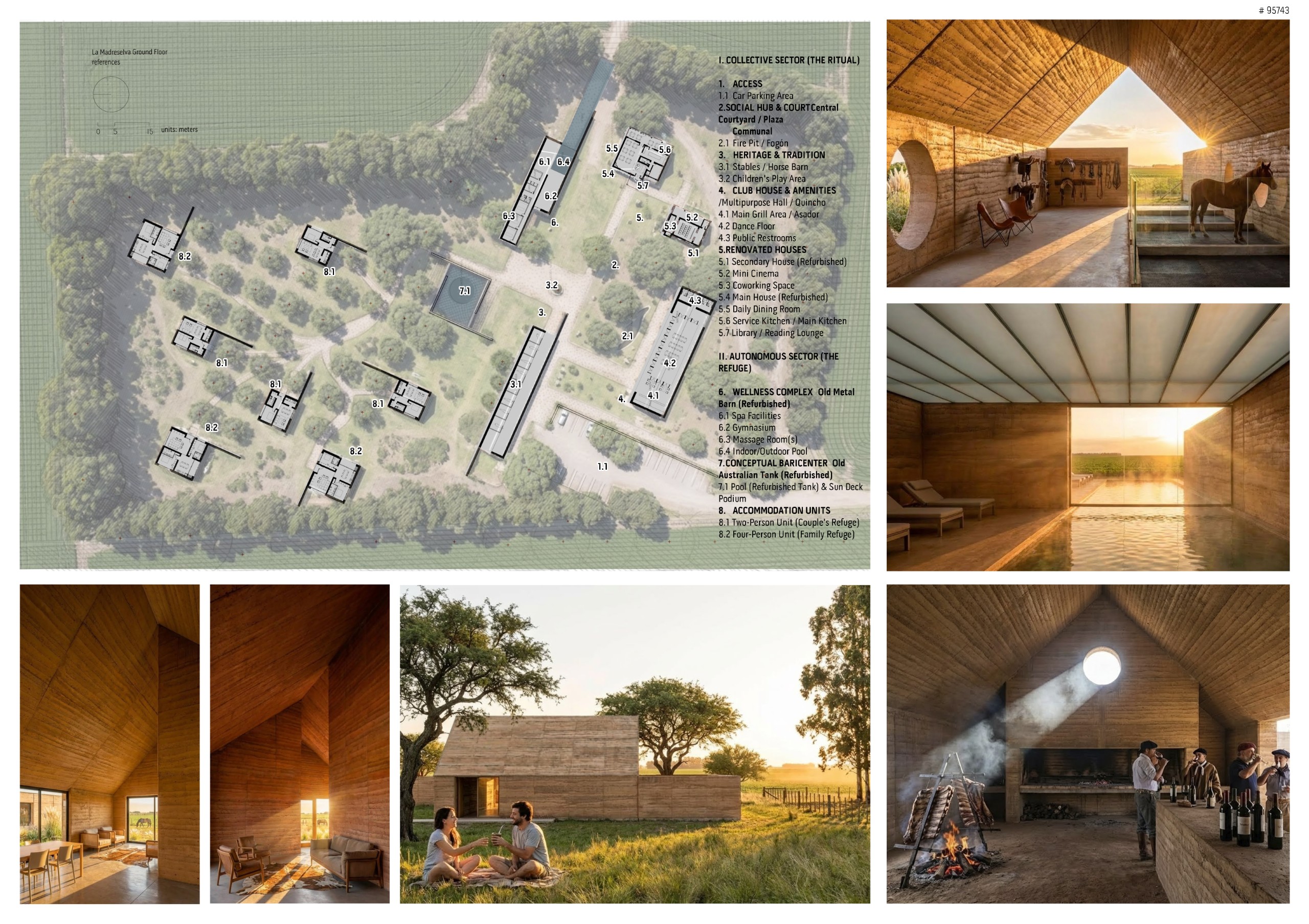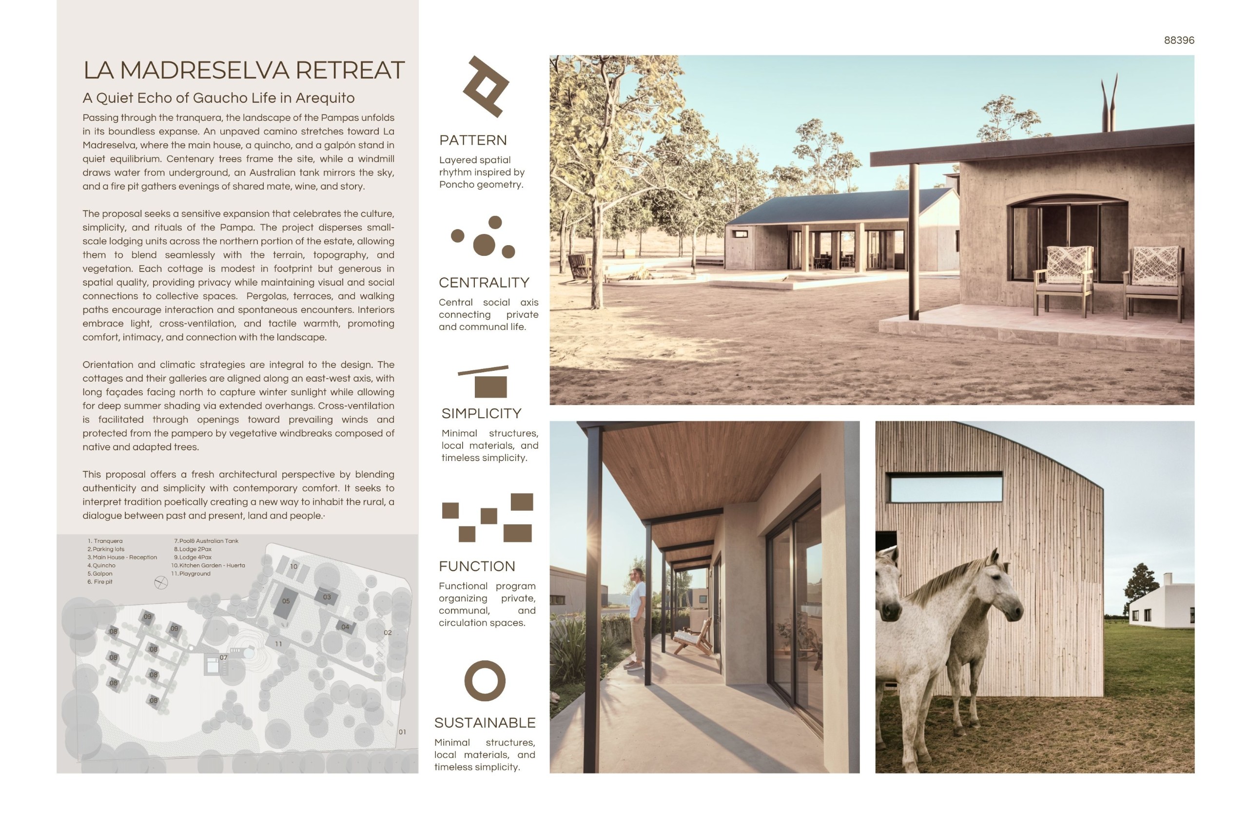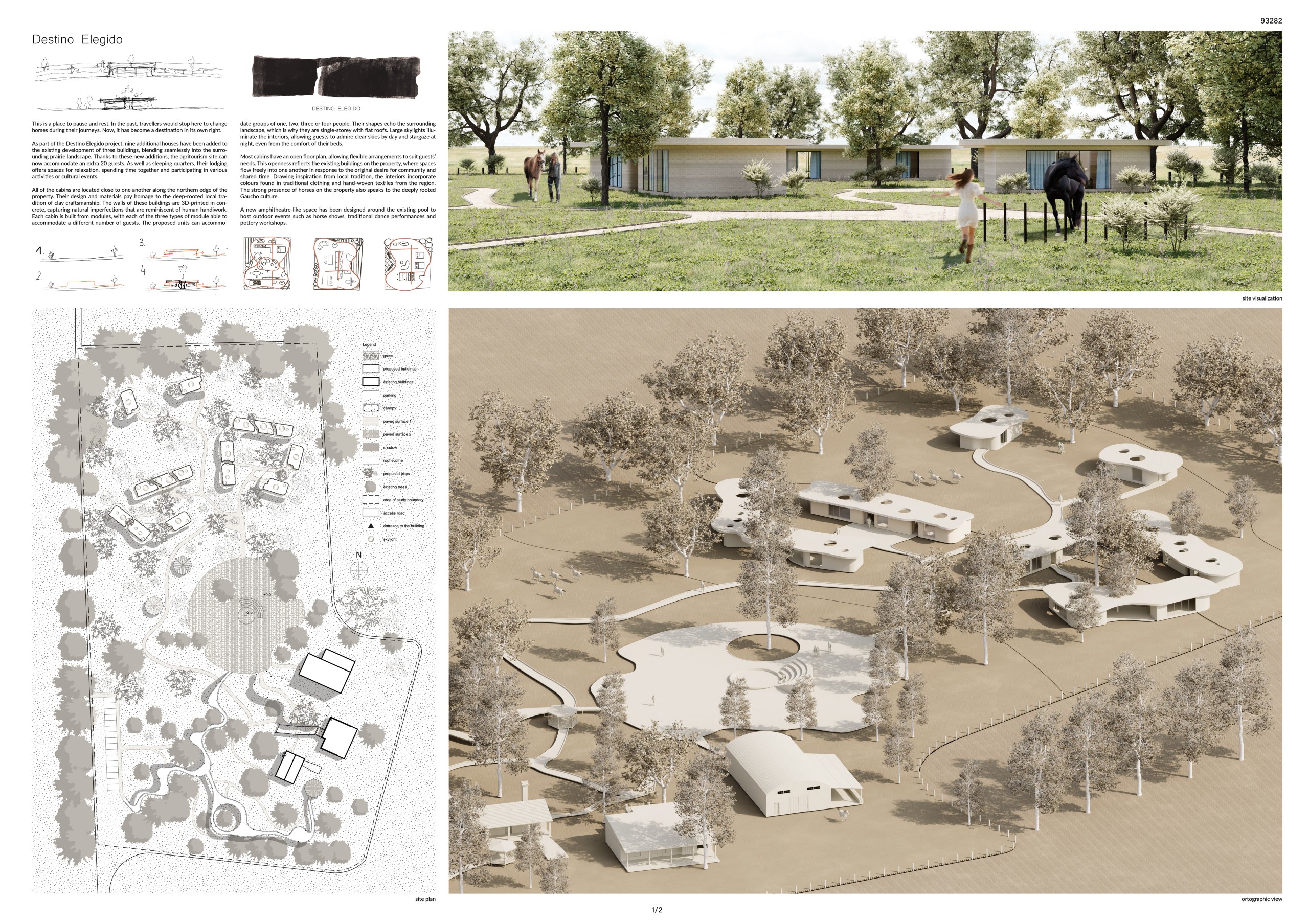 “La Madreselva” invited participants to envision the expansion of a distinctive rural retreat set within the Argentine Pampas, with the aim of accommodating up to 20 guests while preserving the site’s intimate and authentic character. The competition called for the design of small-scale lodging units capable of integrating harmoniously with the surrounding landscape through sensitive material choices and sustainable design principles. More than a simple hospitality project, the challenge encouraged a meaningful dialogue between past and present, connecting new architectural interventions with the existing structures and the vast rural context. Participants were free to explore a wide range of spatial strategies, from repeatable units to flexible systems or clustered configurations, allowing architecture to respond organically to both use and place.