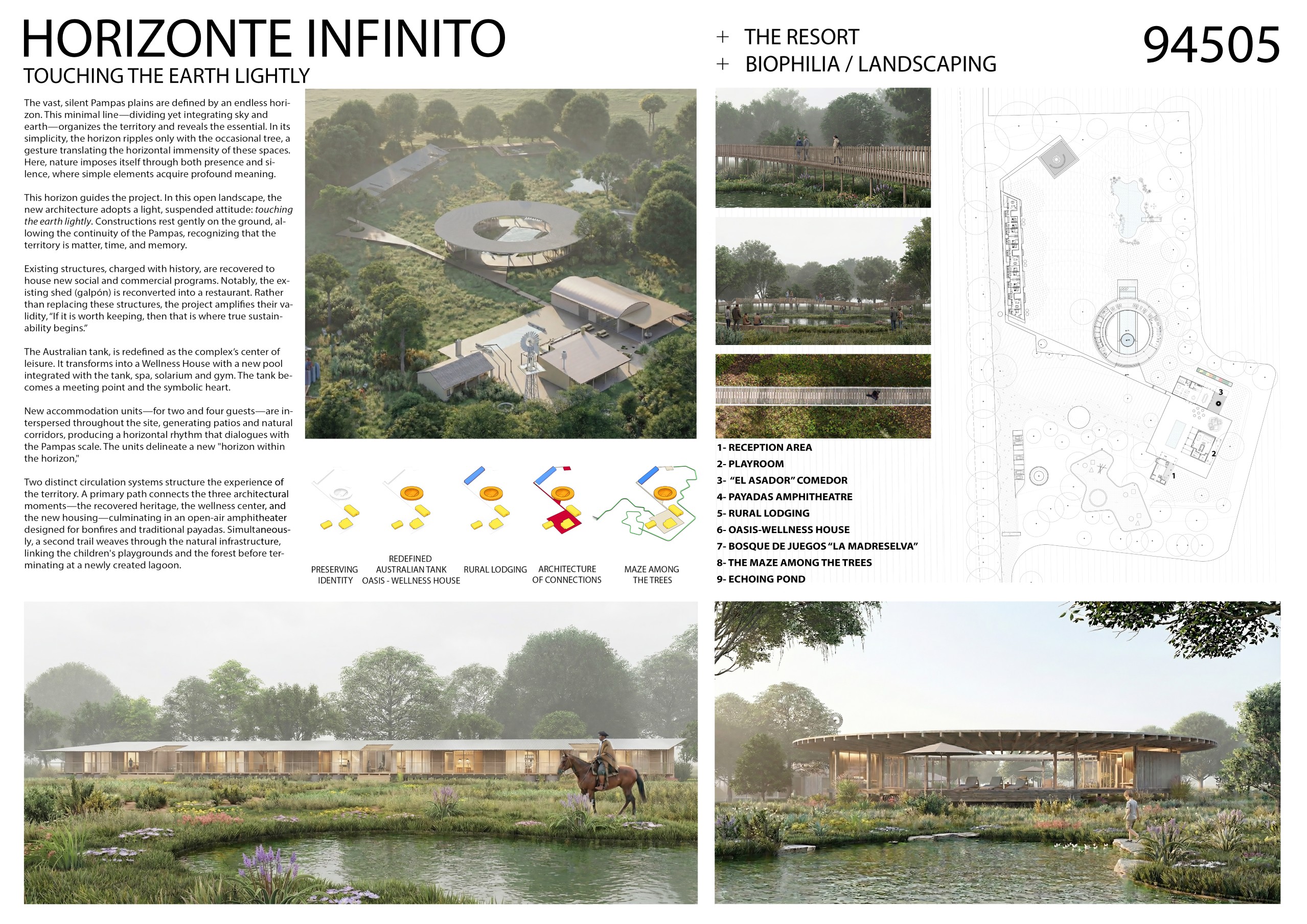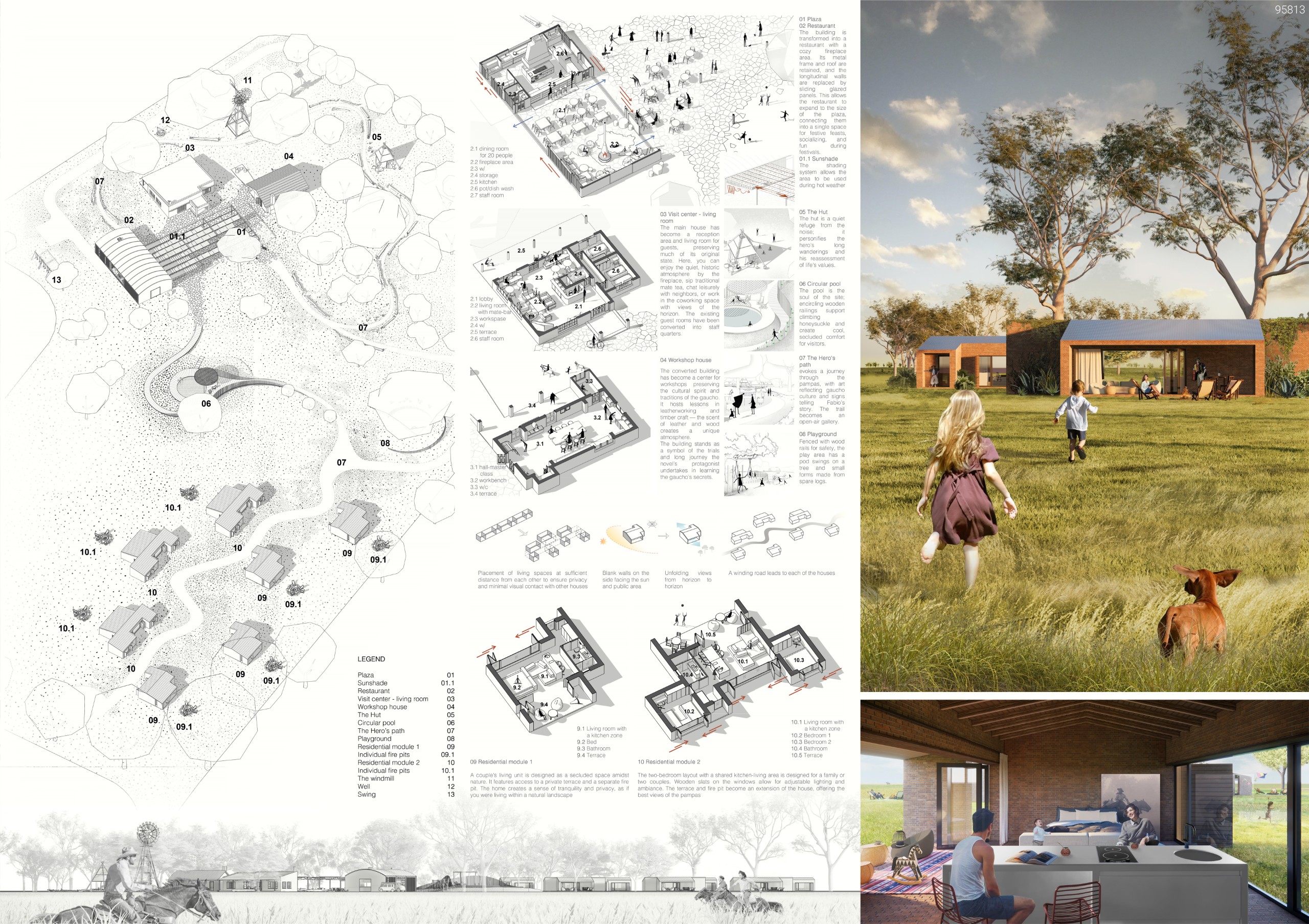 ALONE TOGETHER is a slow-tourism retreat inspired by the ethos of the Gaucho—an existence defined by essentialism, mobility, and deep connection to the land. It offers an antidote to the modern traveler’s urban burden, allowing visitors to step back from the pace of city life and re-enter the primal rhythm of the Pampas. Here, freedom is experienced through minimal presence, heightened awareness, and intimate engagement with the horizon, solitude, and nature. The project is not merely a place; it is a spatial narrative where landscape, movement, and human experience converge, fostering renewal and liberation.