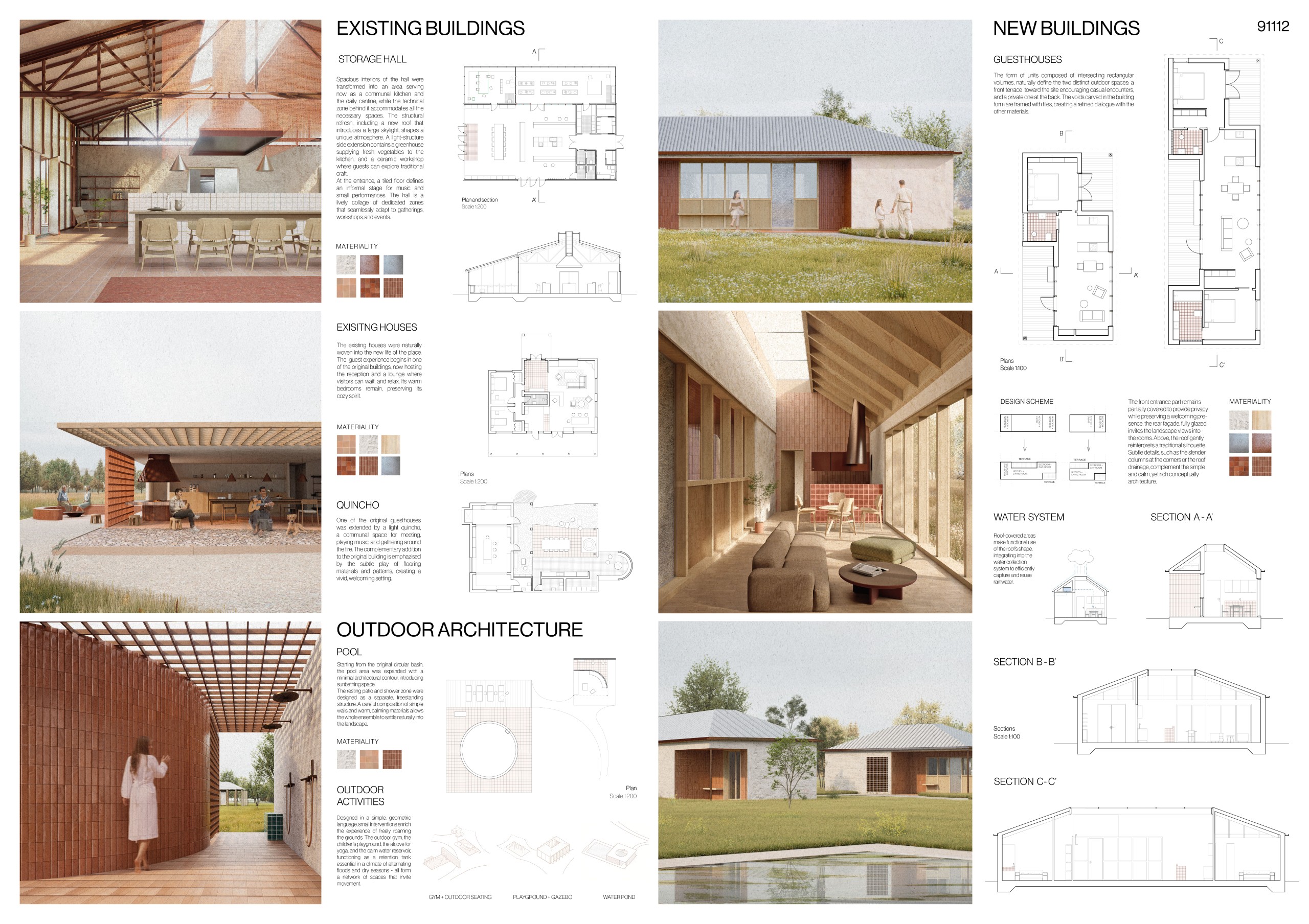 At the center of the estate, the Landscape Area, ease the passage from quietude to collective encounters.Introduces a new artificial pond that acts as climatic and scenic device, cooling the air and supporting native species. The existing tank is preserved as a pool overlooking the water, reinforcing the role of water as an atmospheric and symbolic presence. Around this oasis, small recess areas and informal recreational spaces, for cycling, soccer, or simple wandering, fold gently into the landscape.