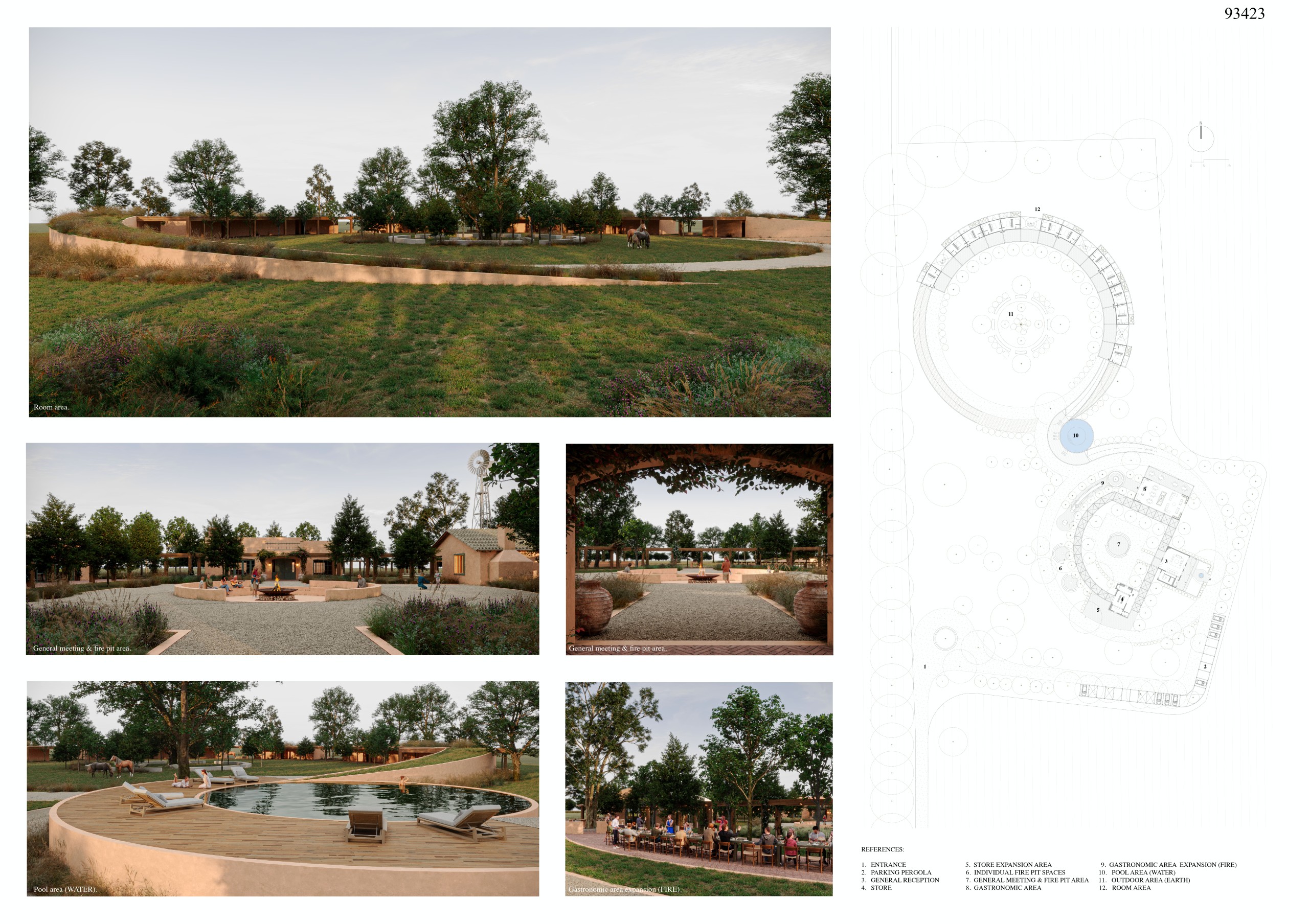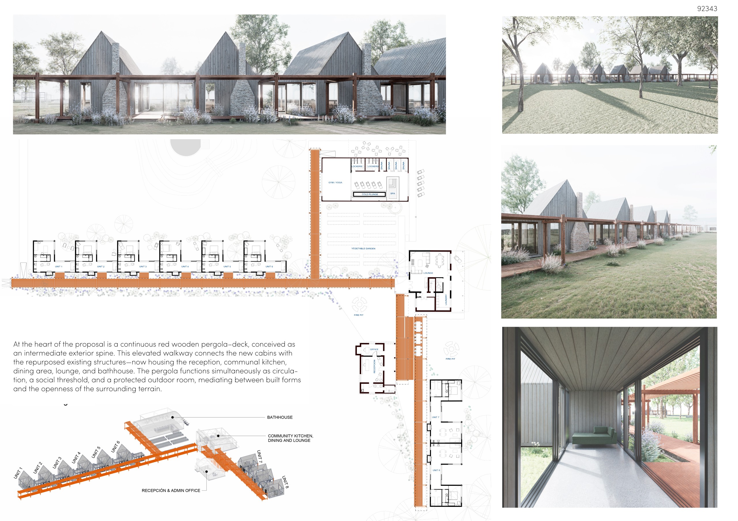 Drawing from the logic of traditional rural settlements, the project adopts a layout structured around a shared central space, where everyday life unfolds collectively. From this core, several axes radiate outward, guiding circulation paths, framing views, and distributing the accommodations. In this way, the project becomes a contemporary interpretation of rural dwelling, where the radial geometry symbolizes unity, balance, and the relationship between the individual, the community, and the landscape.