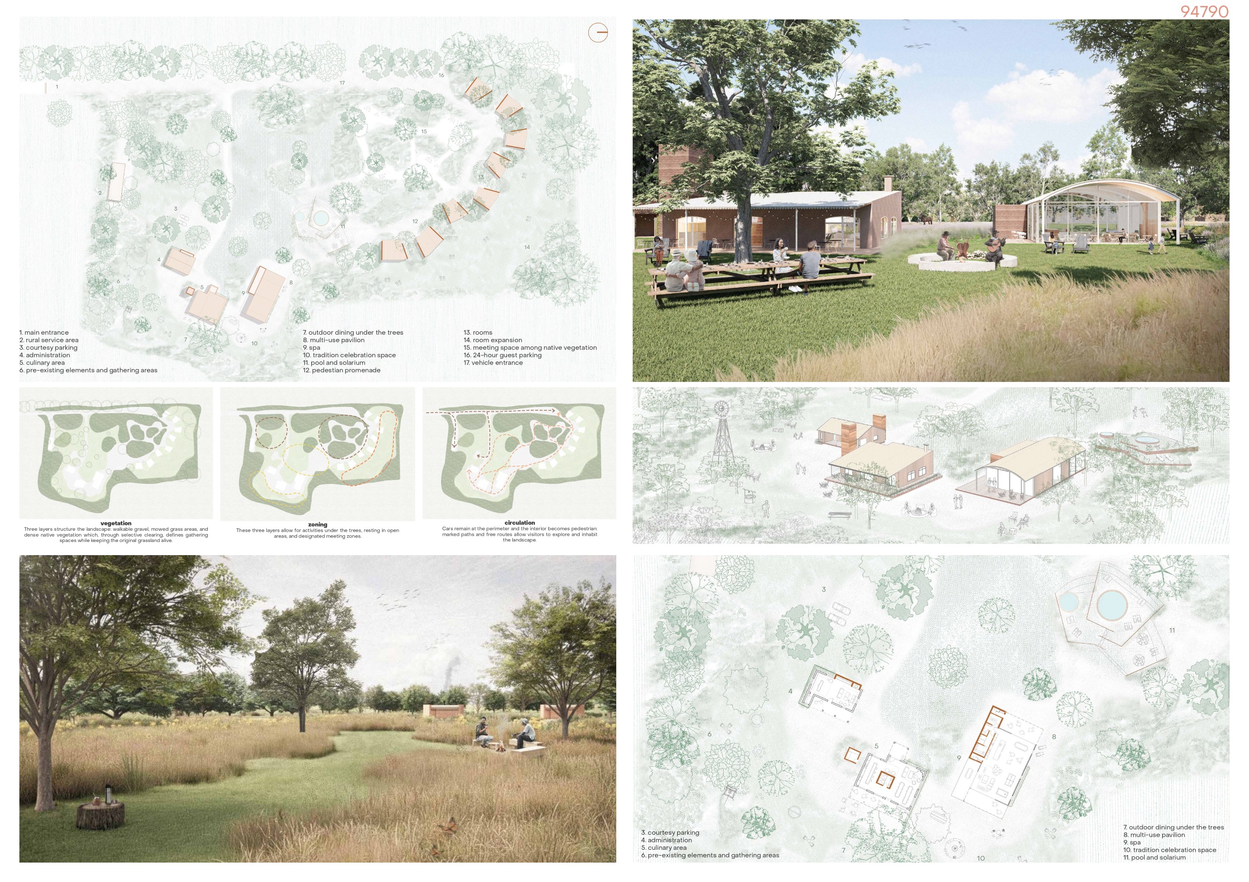 The project grows from a reading of the site, where existing buildings, their roof typologies, and the open grounds already suggest an underlying order. Three roof forms—mono-slope, gable, and vaulted—establish the framework, each bringing its own scale and spatial trace. They link the original structures with the new ones, guiding how people cook, gather, rest, learn, and move across the landscape. Circular clearings and courtyards create places for meeting or pausing, allowing daily rhythms to unfold between sheltered interiors and open grounds. Within this structure, locals, weekend visitors, and travelers can share routines and experience the place with ease.