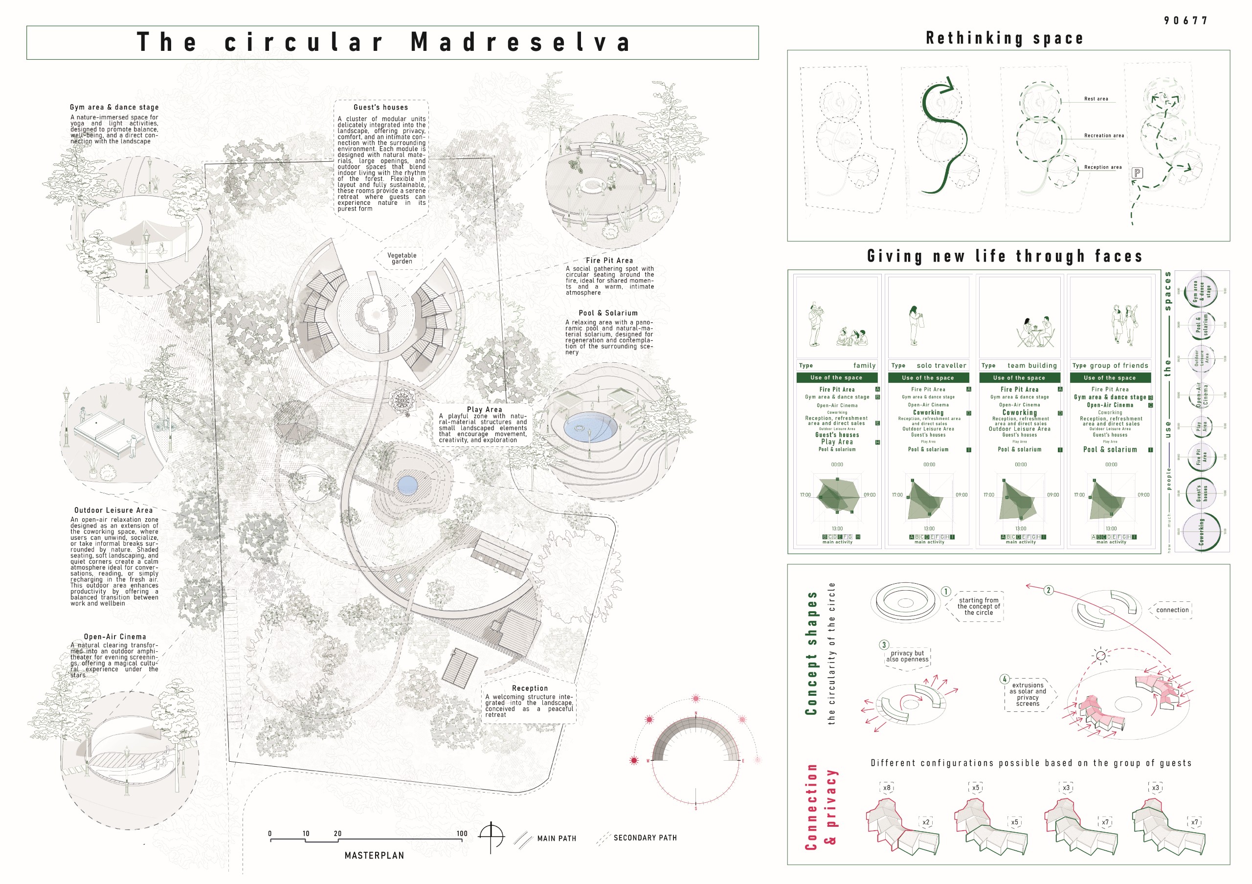 The radial form expresses an ancestral idea of collective shelter: each accommodation opens onto the surrounding landscape, converges toward the shared space, and connects to the whole through organic pathways that invite exploration and social interaction. The central square acts as the main articulating element, concentrating communal functions such as gathering areas and pedestrian circulation. Thus, the center becomes the heart of the complex, promoting cohesion, meeting, and a clear spatial reading.