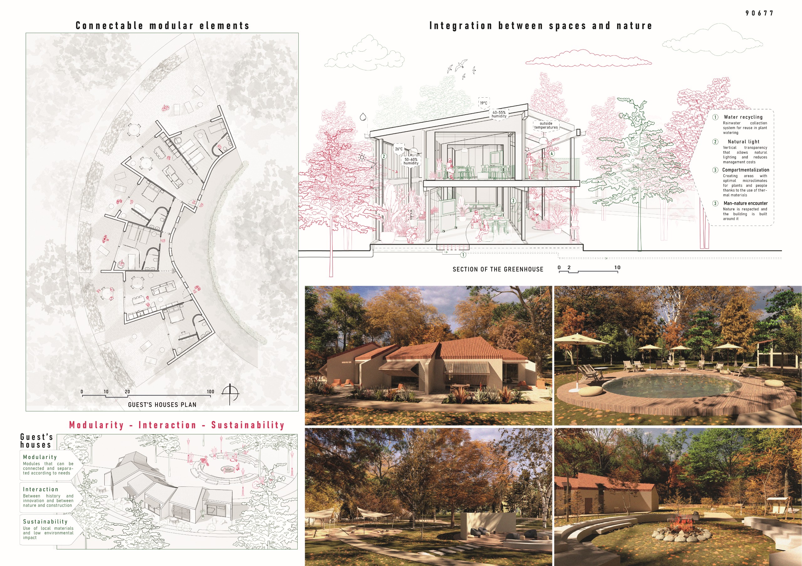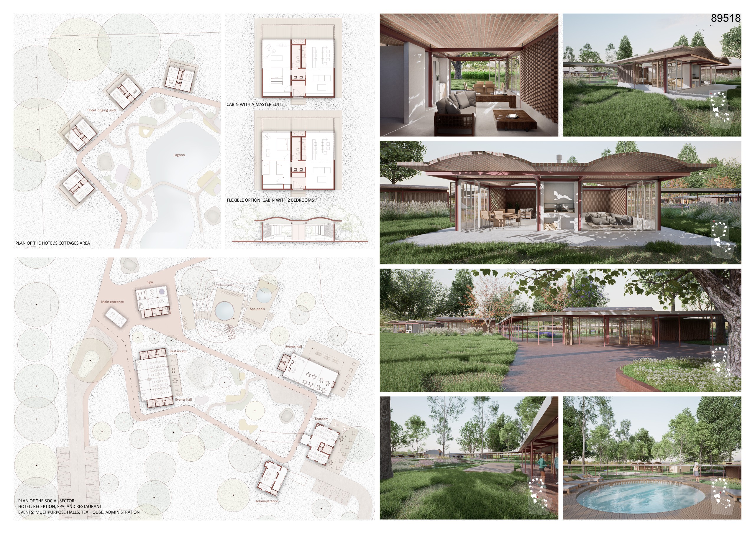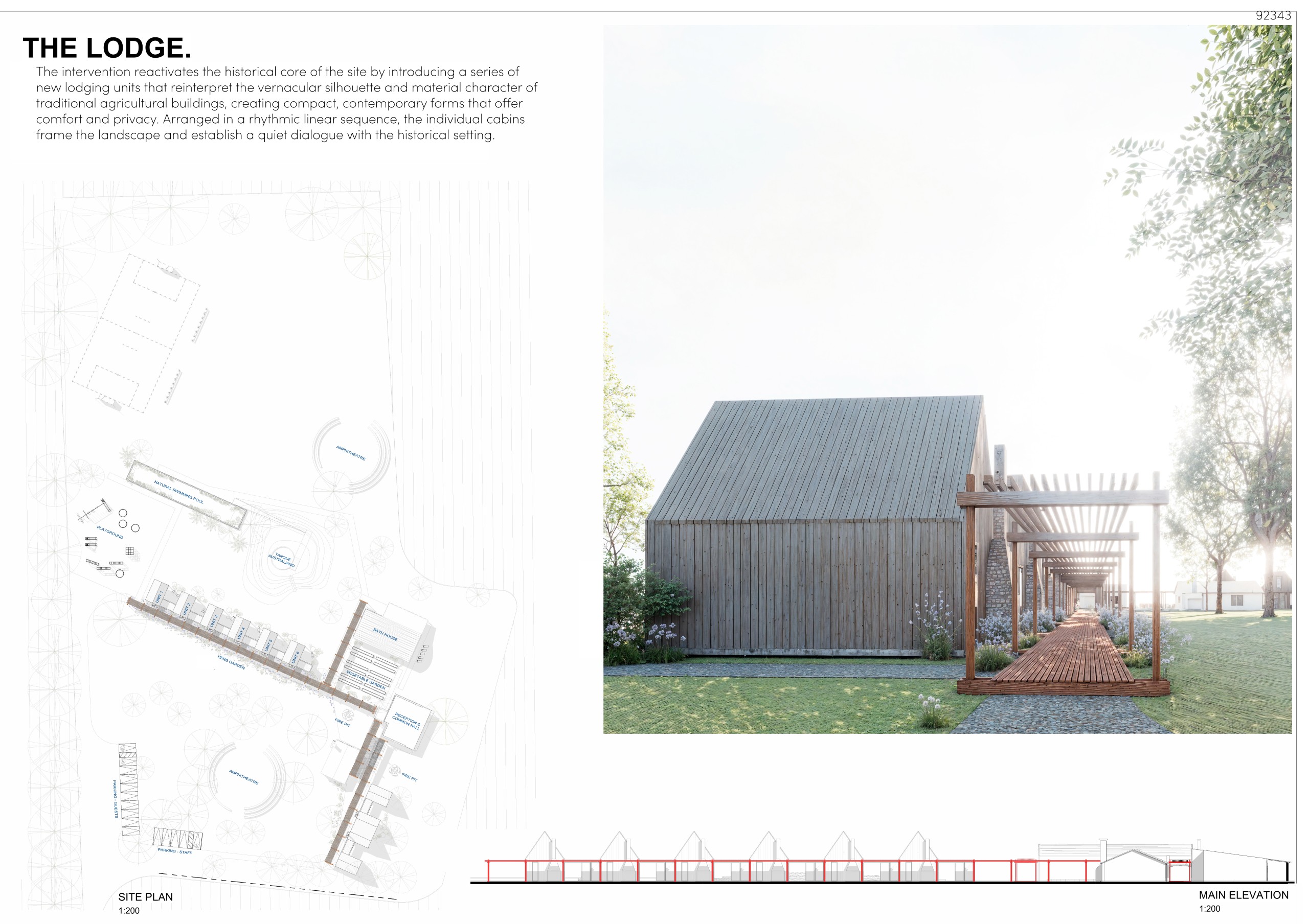 “The project deliberately rejects the idea of an expansion in the northern part of the plot, instead emphasizing a new centrality through a system that brings together the existing buildings and the new extension of the cabins. The dual relationship between tradition and advanced technological solutions—expressed through the use of new materialities—is particularly compelling, as is the introduction of functional “devices” such as the outdoor cinema and the viewpoint tower, which contribute to the overall coherence of the scheme. Greater emphasis could be placed on the relationship with the entrance and arrival sequence.”