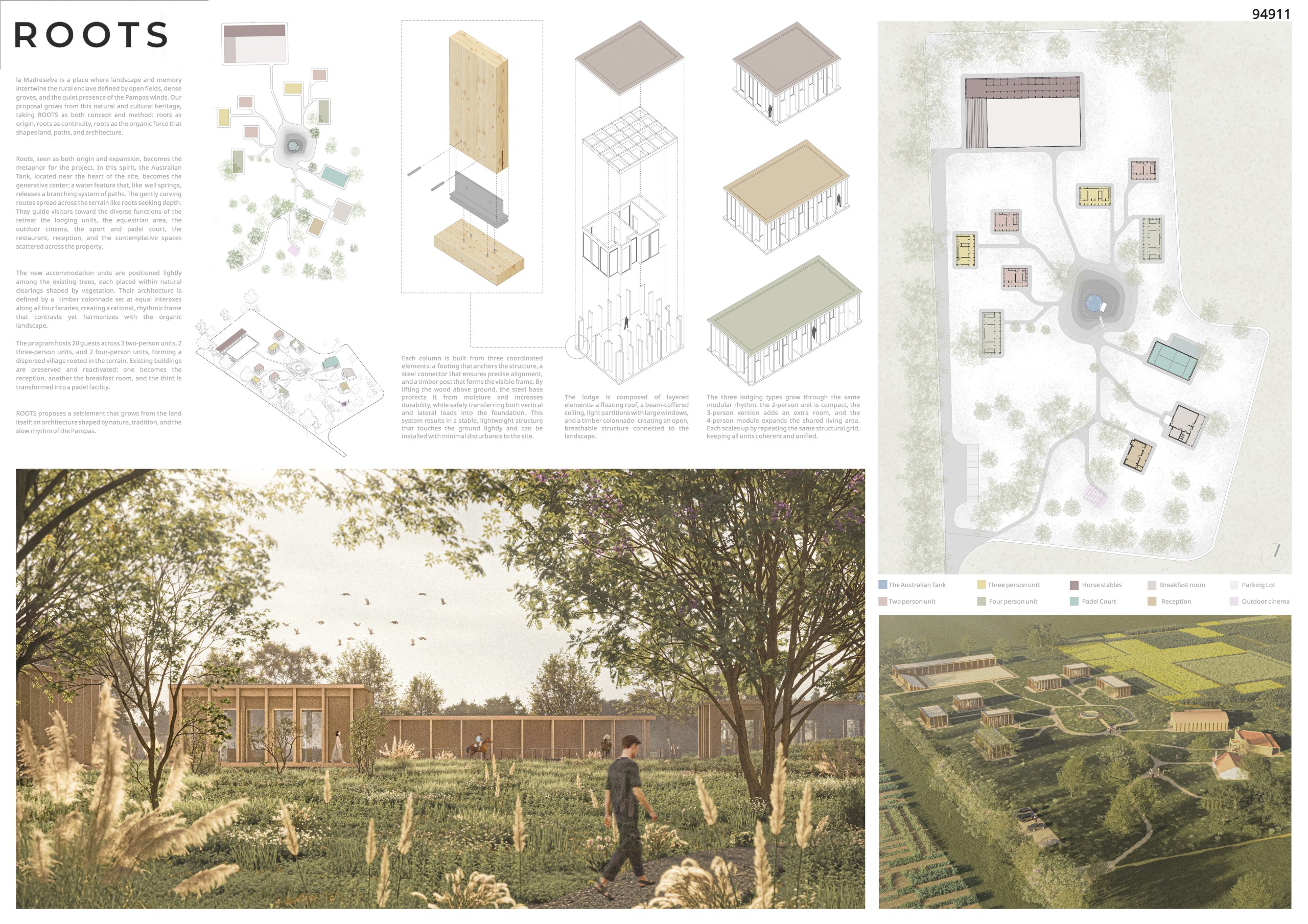 Through its spatial layout, material expression, and relationship with the terrain, ROOTS proposes a settlement that grows from the land itself : an intervention shaped by context, modular clarity, and the slow rural rhythm of the Pampas. It is not a reproduction of rural life, but a continuation of it.