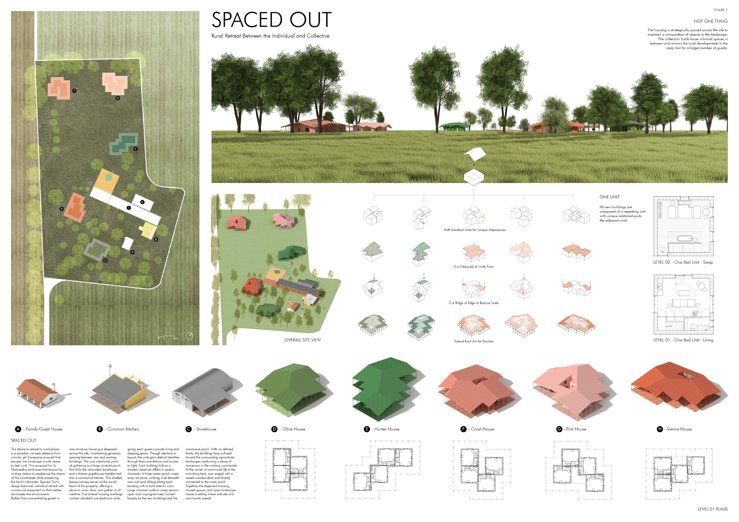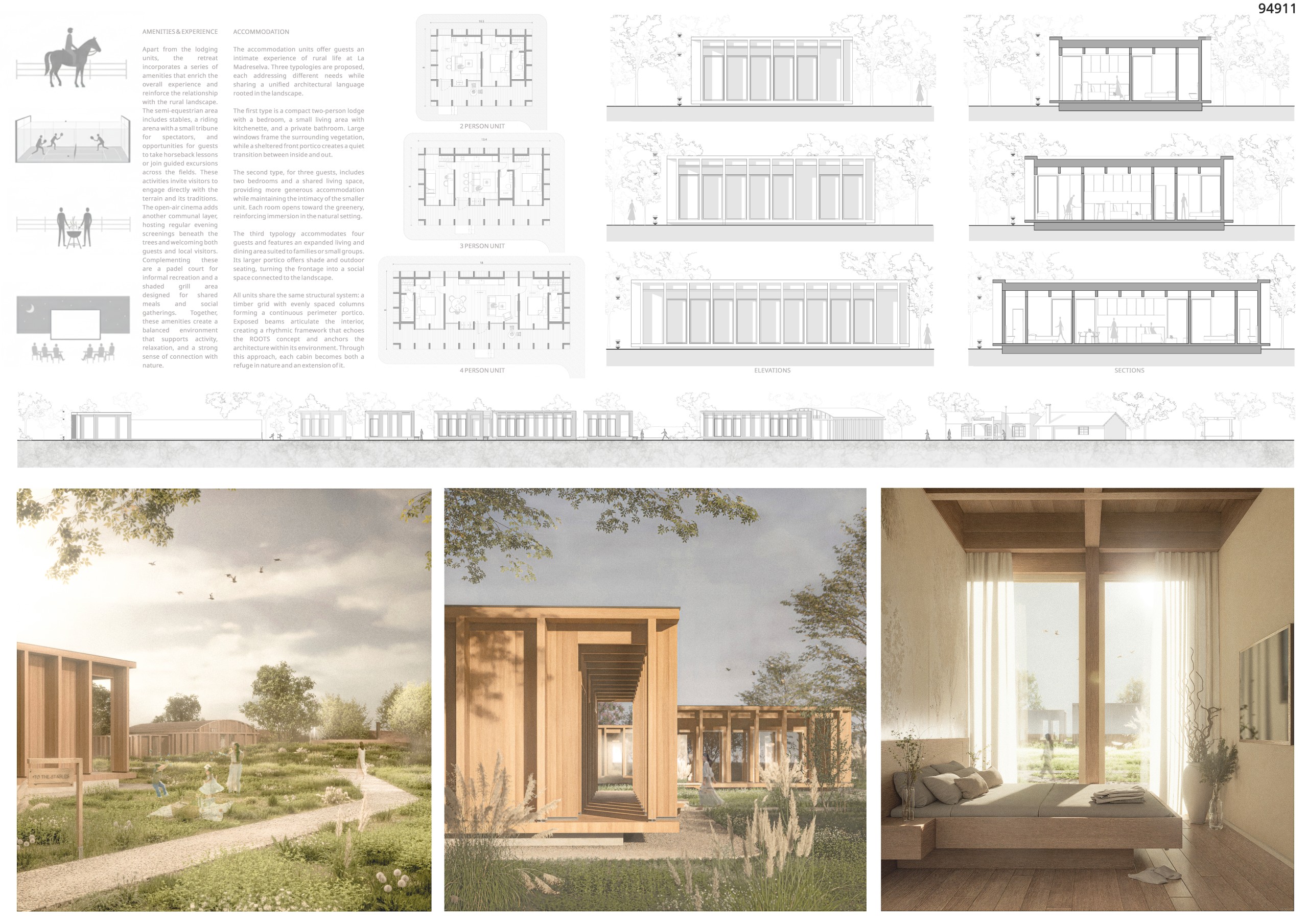 La Madreselva is a site where landscape, memory, and rural culture coexist in quiet equilibrium. Our proposal grows from these existing conditions by adopting ROOTS as its guiding concept: a metaphor for origin, connection, and continuity. Roots express the way a place anchors itself, how it expands gently through the terrain, and how individual elements grow from a common core. This idea became the foundation for a spatial and architectural strategy in which the project does not sit on the land as an isolated object, but evolves from its inherent logic.