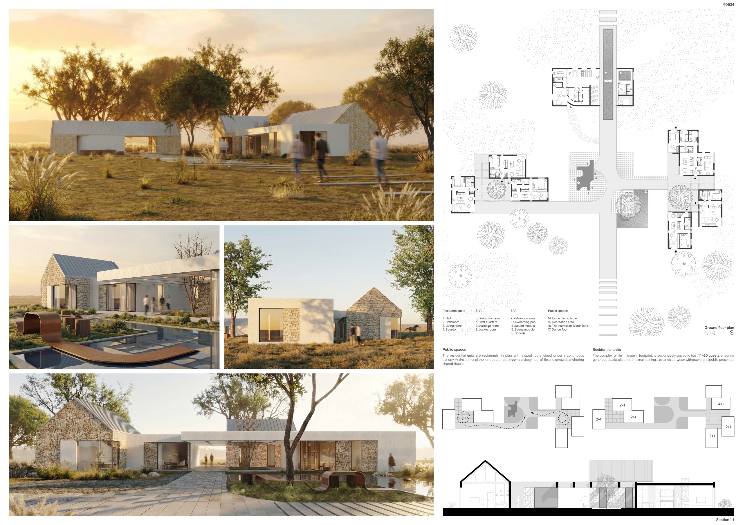 “The project clearly defines the connections between the different components of the plot (the existing structures, the Wellness House, and the new units), culminating in an open-air auditorium that effectively concludes the spatial sequence. Particular significance is attributed to the Australian Tank, whose central role is reinforced by a portico structure that enhances its symbolic value. The articulation of the residential units, although formally simple, plays with the horizontal character of traditional architecture, fostering a commistion between private and shared spaces. Another noteworthy aspect is the relationship between the new constructions and the ground: the buildings rest lightly on the terrain through a limited number of contact points, thereby minimizing their impact on the landscape.”