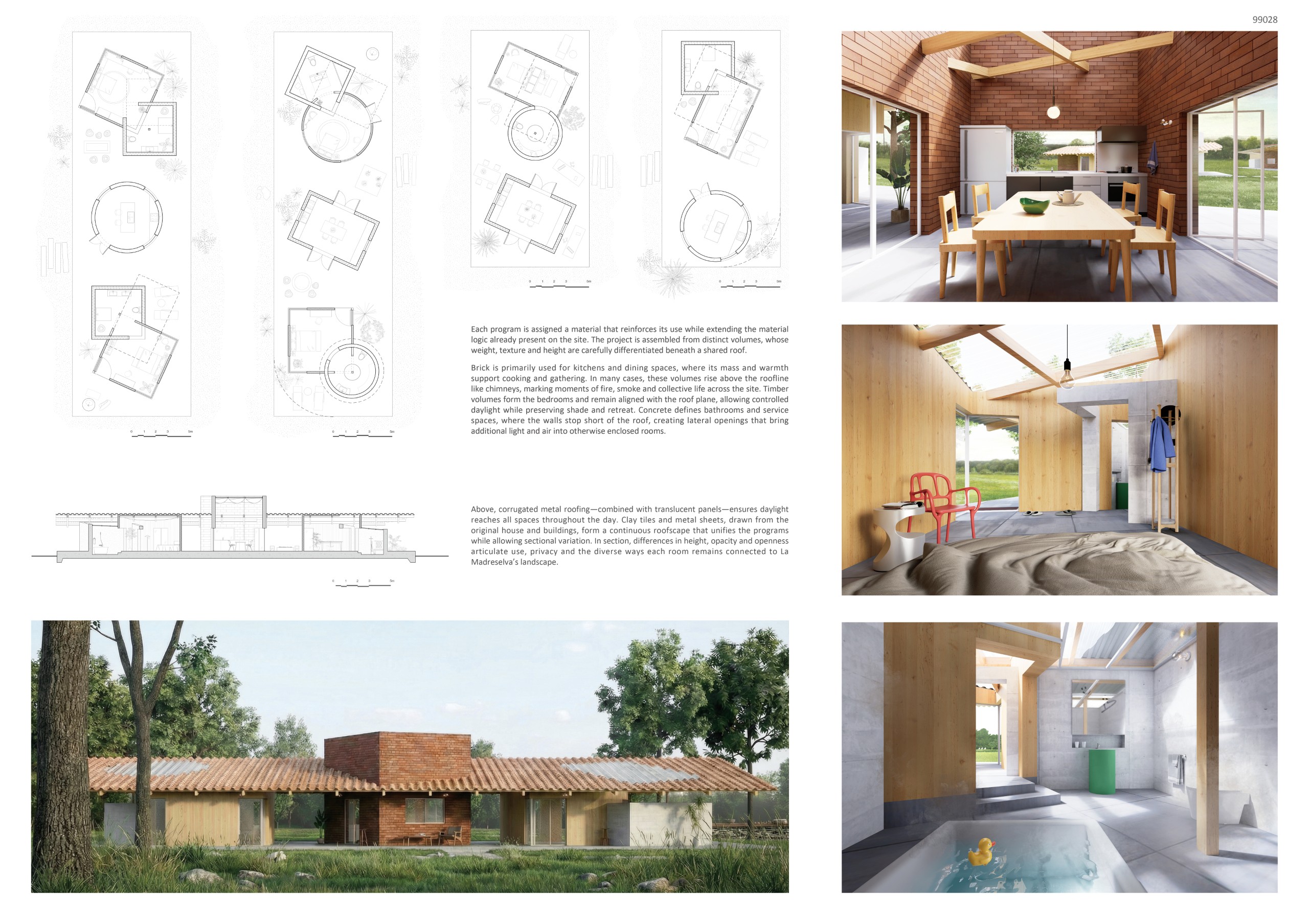 Material and section play a central role in articulating use, atmosphere and memory. Each program is assigned a material that reinforces its character while extending the logic of the existing buildings on site. Brick is primarily used for kitchens and dining spaces, where its mass and thermal presence support cooking and gathering; in many cases these volumes rise above the roofline, recalling chimneys within the landscape. Timber forms the bedroom volumes, remaining aligned with the roof plane to preserve controlled light, shade and retreat. Concrete defines bathrooms and service spaces, where walls stop short of the roof to create lateral openings for additional light and air.