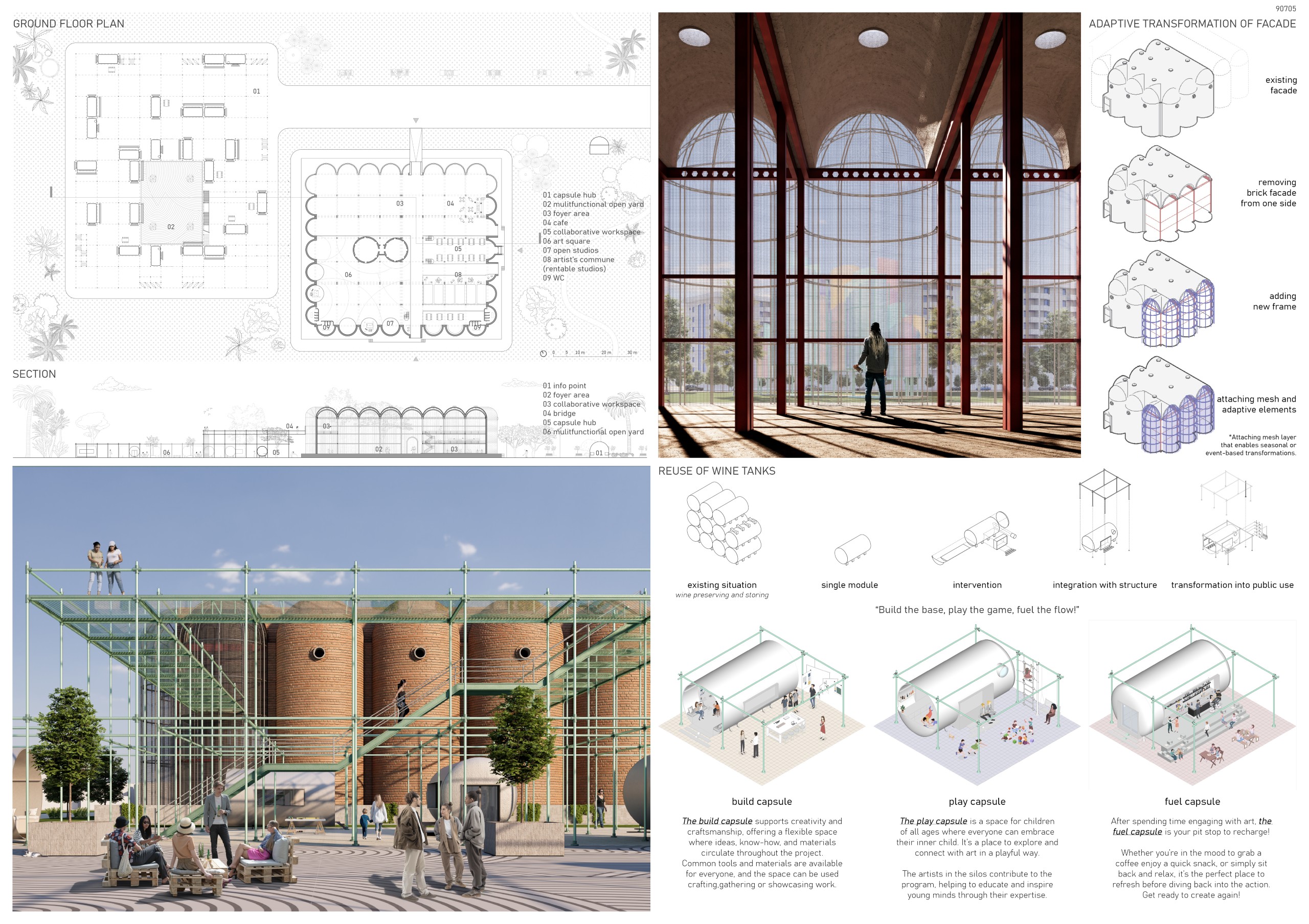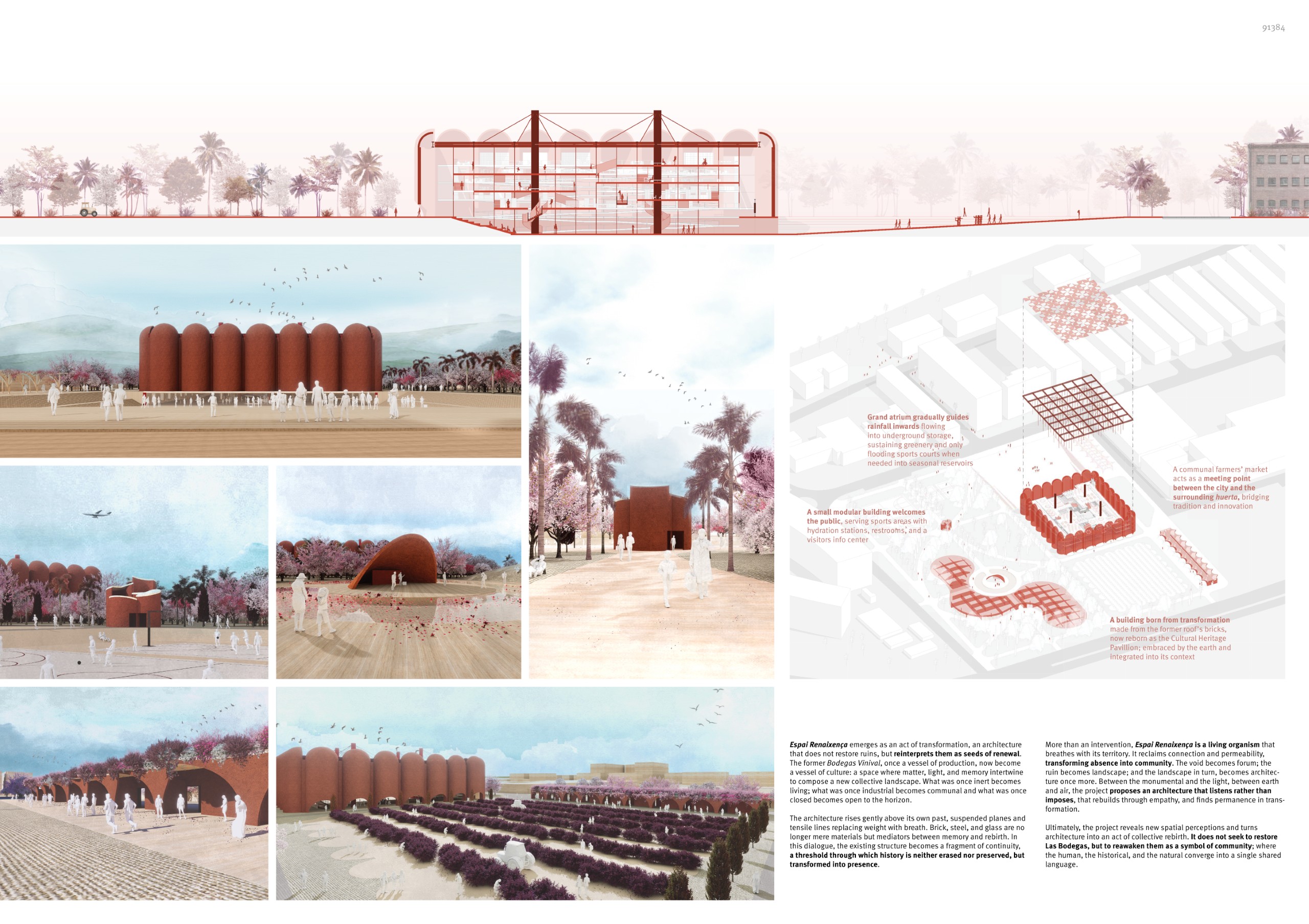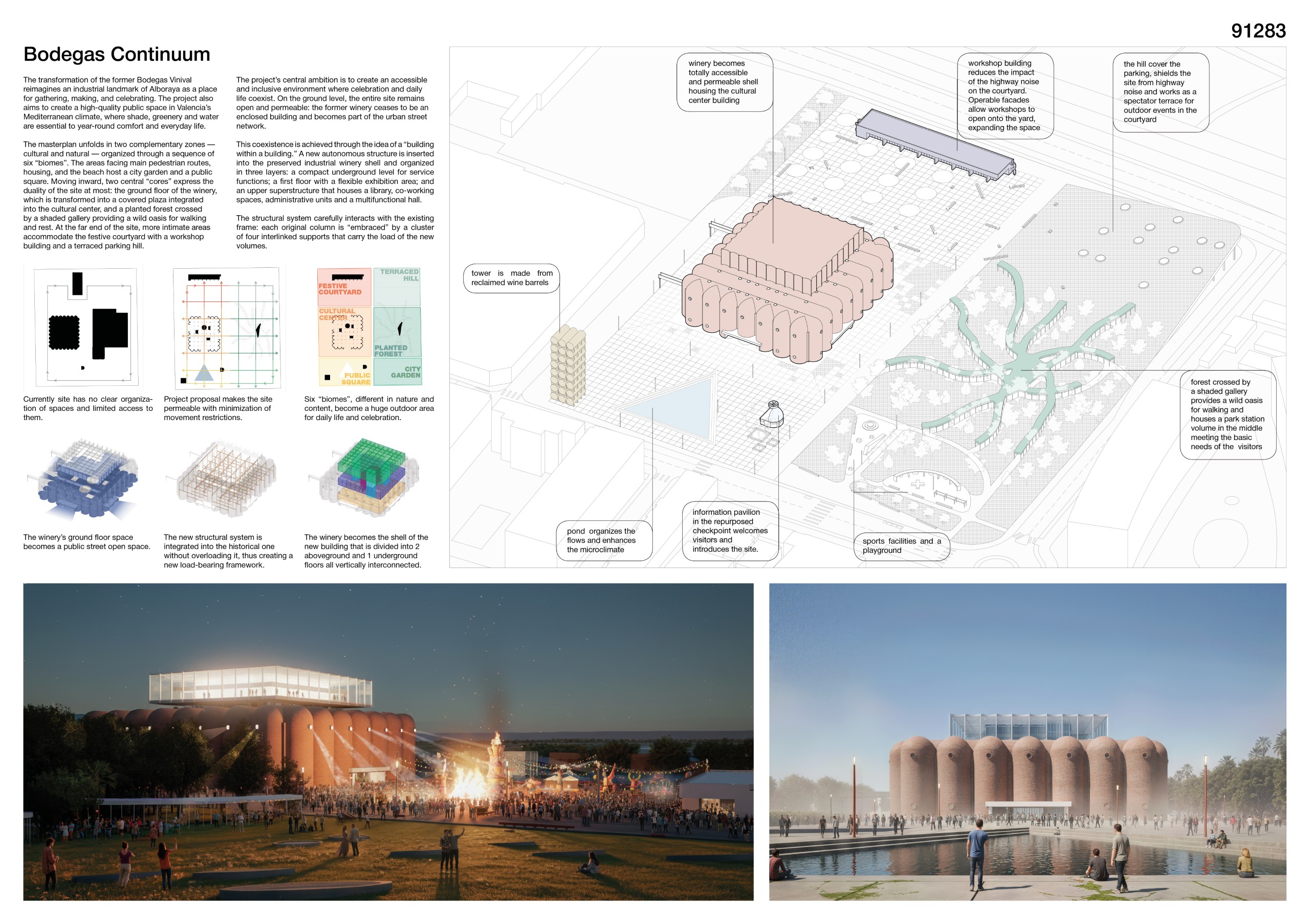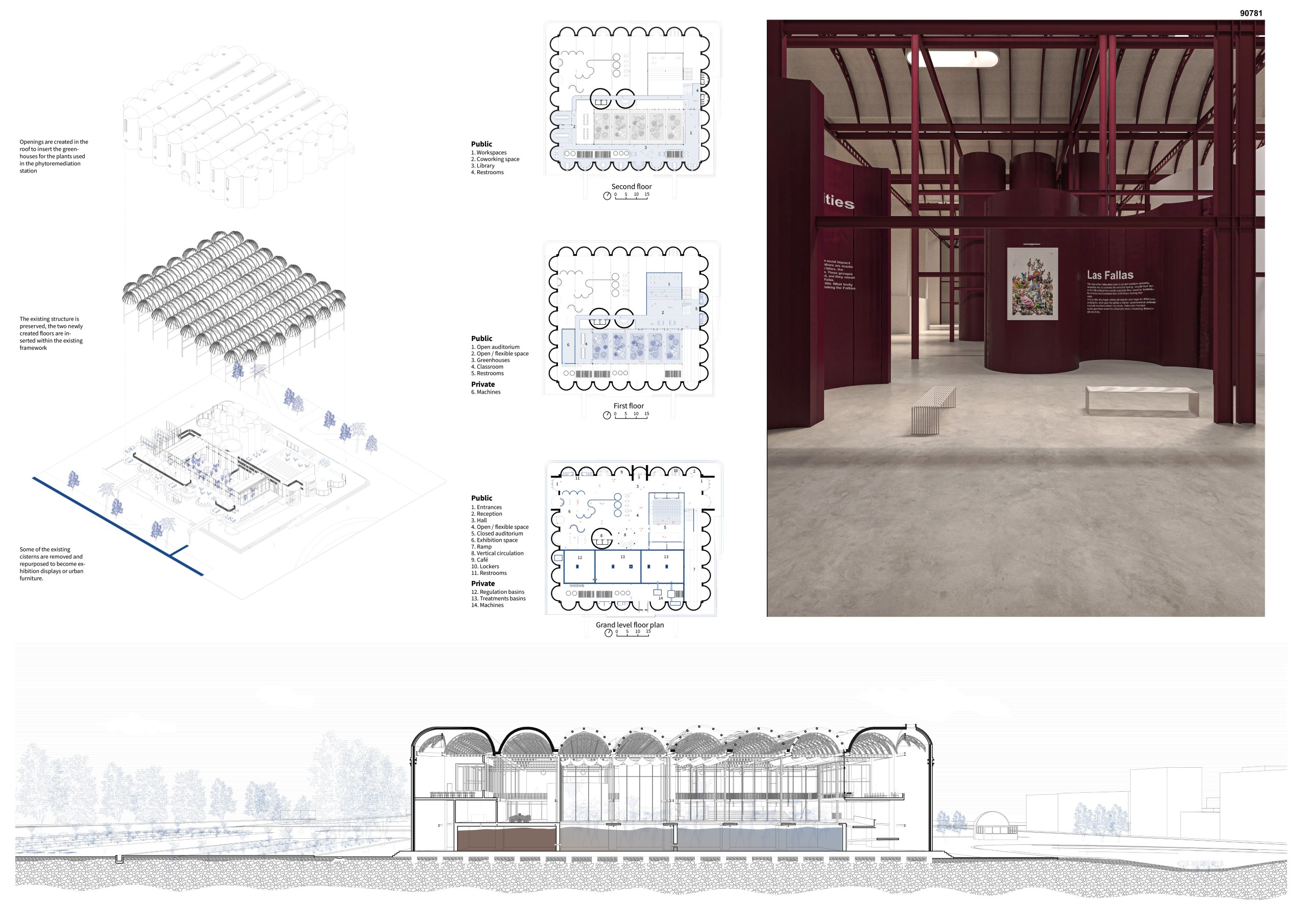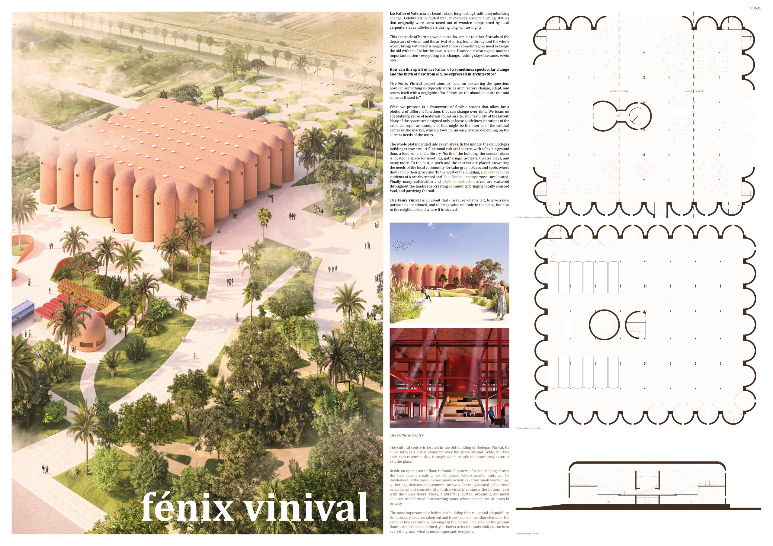 The former winery complex is transformed through adaptive reuse, where the metallic silos become inhabitable structures capable of assuming multiple functions—viewpoints, water fountains, reading spaces, or vertical circulations. The building takes shape as an inhabited garden where the industrial fabricengages with the surrounding landscape. The central void becomes the main public space, conceived for collective activities, diverse exhibitions, and displays of Las Fallas floats—the emblematic event that gives meaning to the new architectural intervention. Fragments of demolished walls are integrated into the proposal to allow a ceaseless exchange between interior and exterior, allowing vegetation to inhabit the interior spaces and the mirror of the water to traverse them, generating a tempered and inhabitable microclimate.