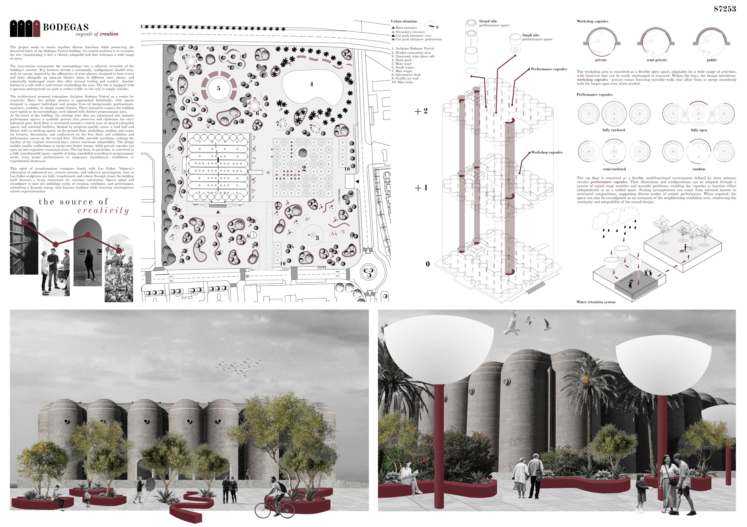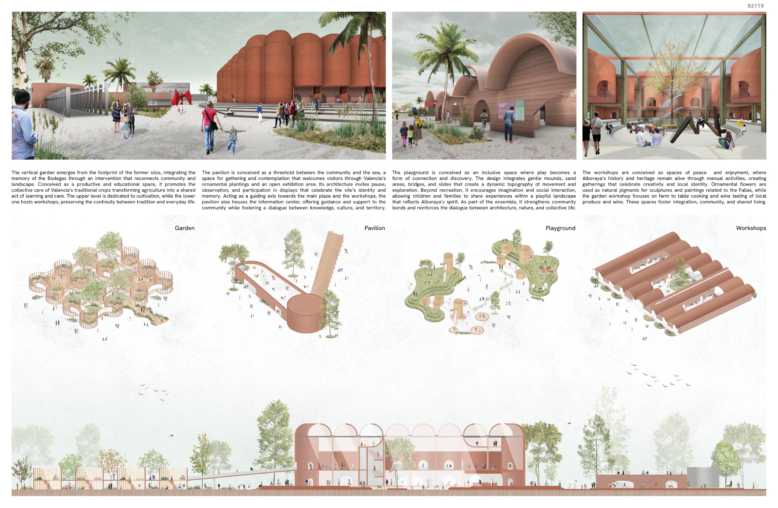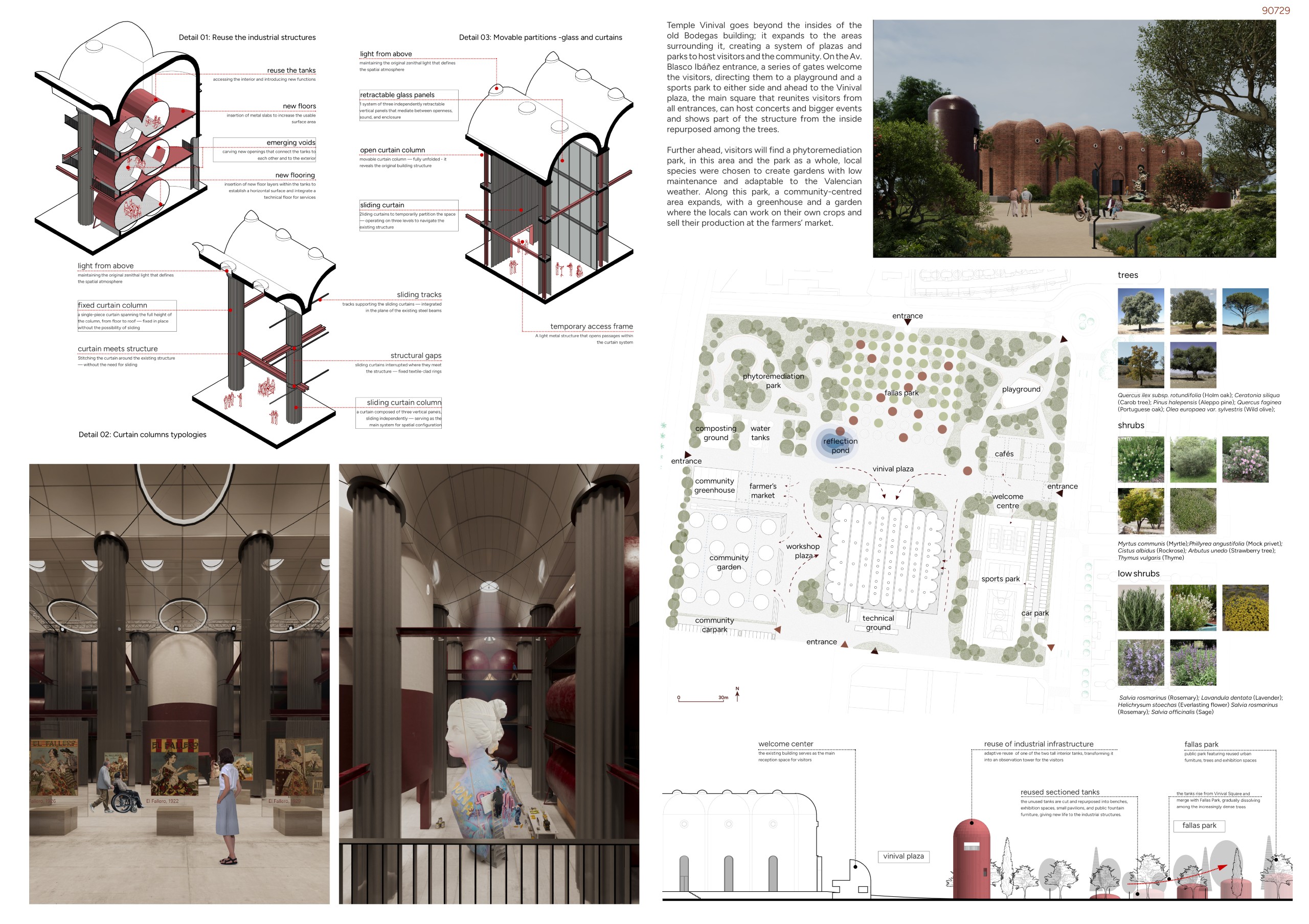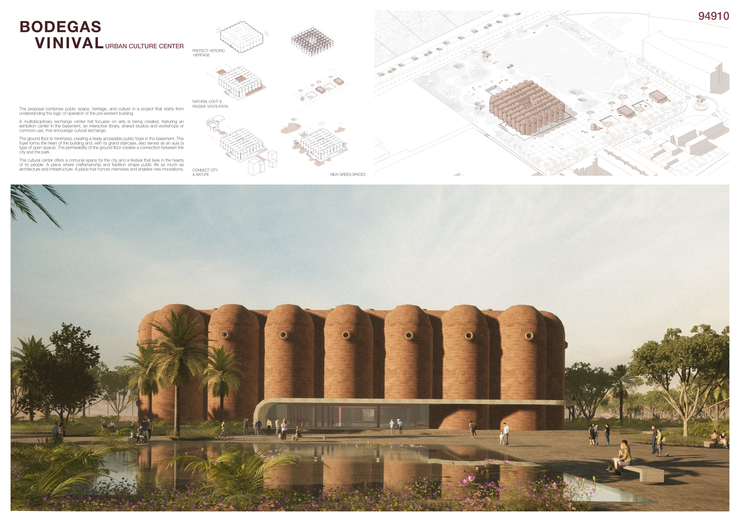 The former winery complex is transformed through adaptive reuse, where the metallic silos become inhabitable structures capable of assuming multiple functions—viewpoints, water fountains, reading spaces, or vertical circulations. The building takes shape as an inhabited garden where the industrial fabricengages with the surrounding landscape. The central void becomes the main public space, conceived for collective activities, diverse exhibitions, and displays of Las Fallas floats—the emblematic event that gives meaning to the new architectural intervention. Fragments of demolished walls are integrated into the proposal to allow a ceaseless exchange between interior and exterior, allowing vegetation to inhabit the interior spaces and the mirror of the water to traverse them, generating a tempered and inhabitable microclimate.