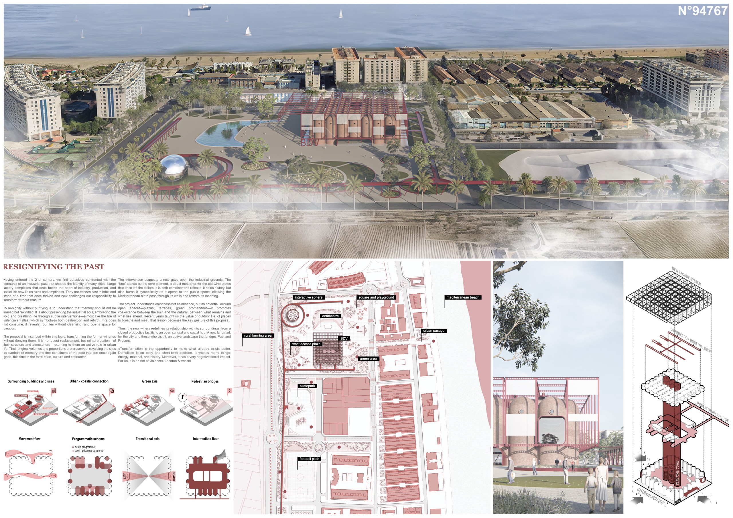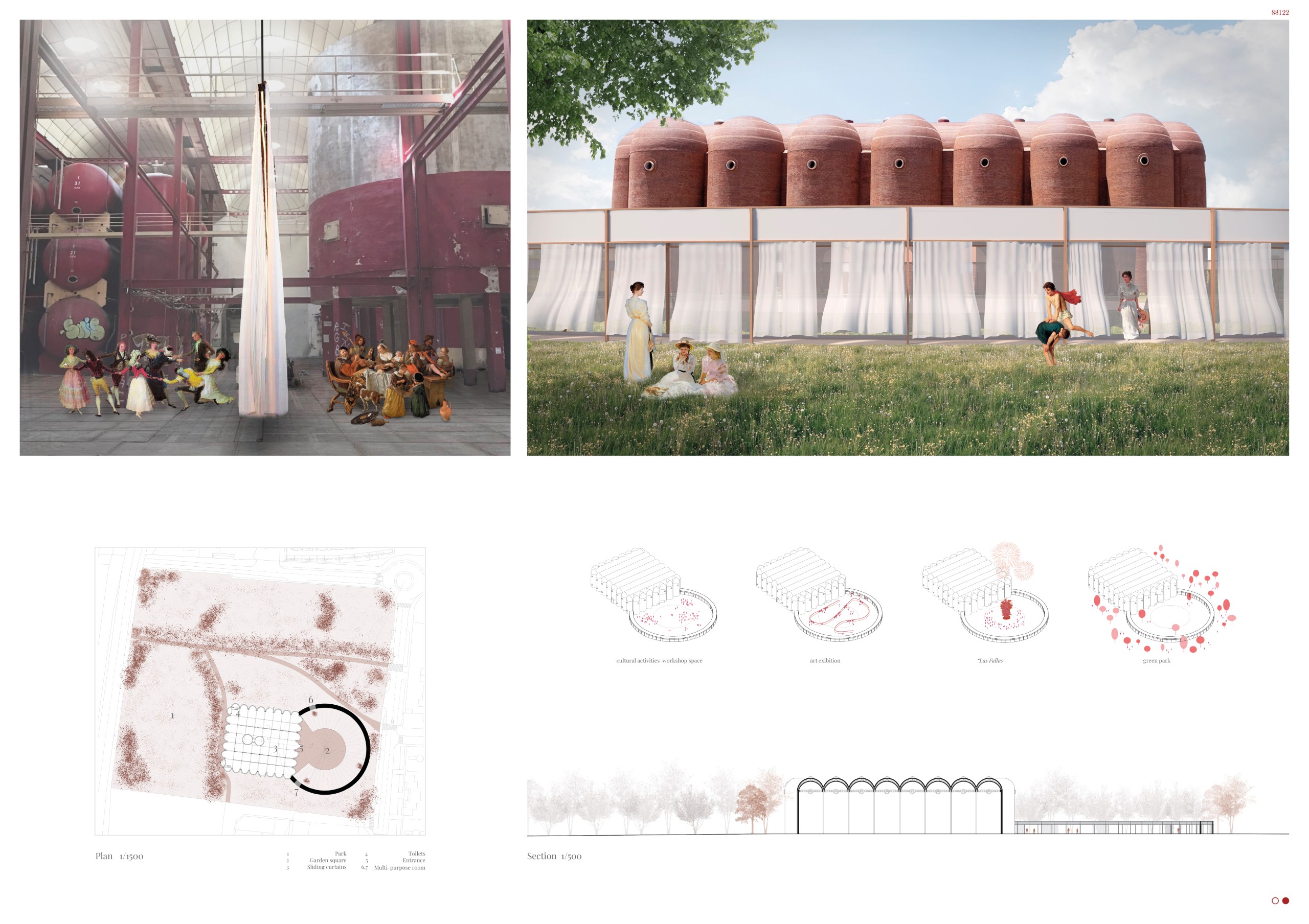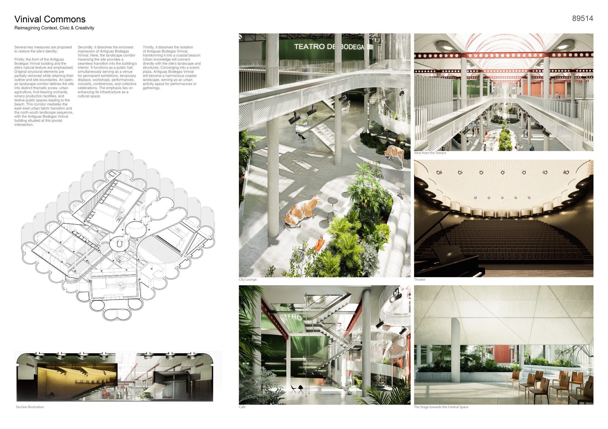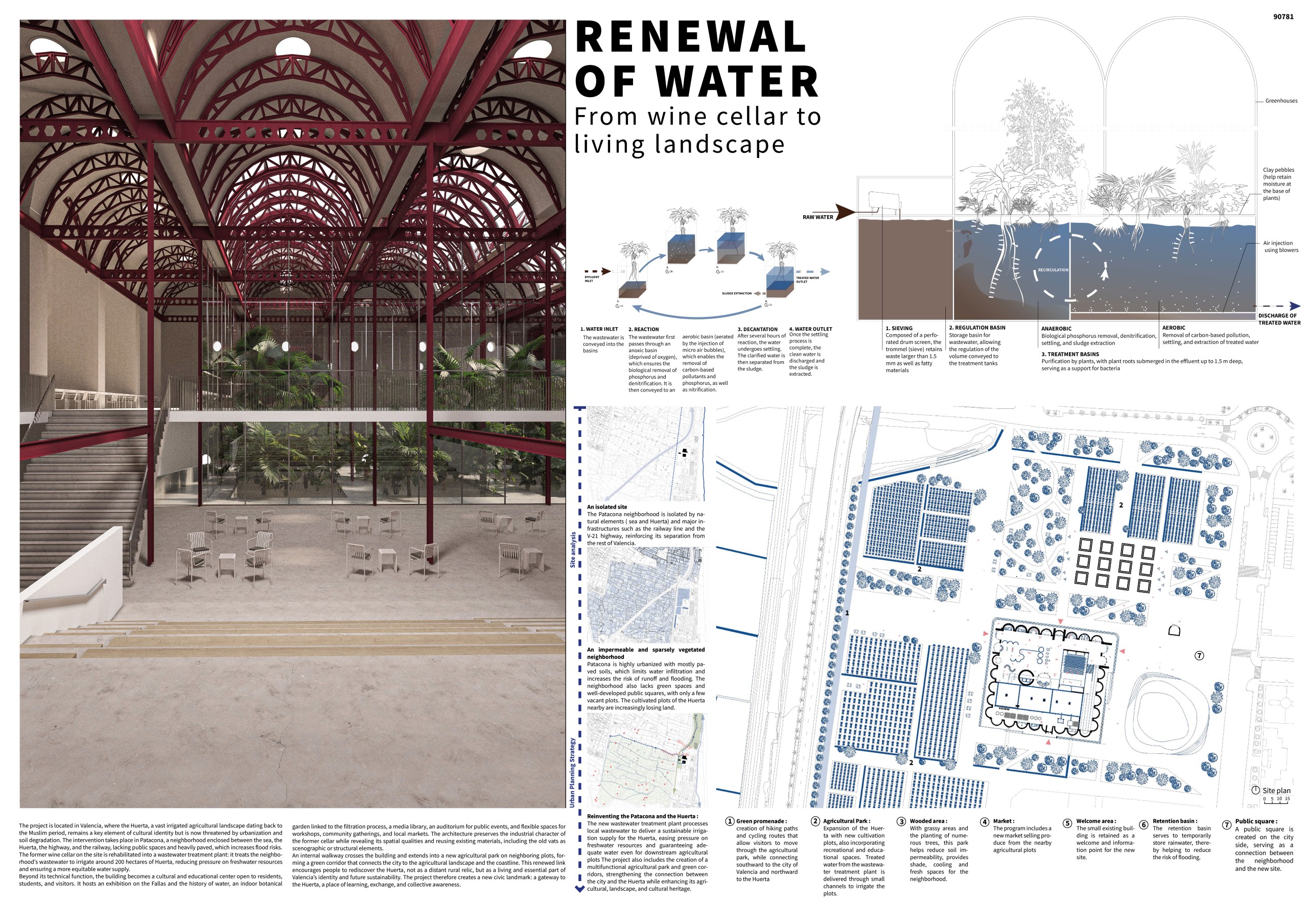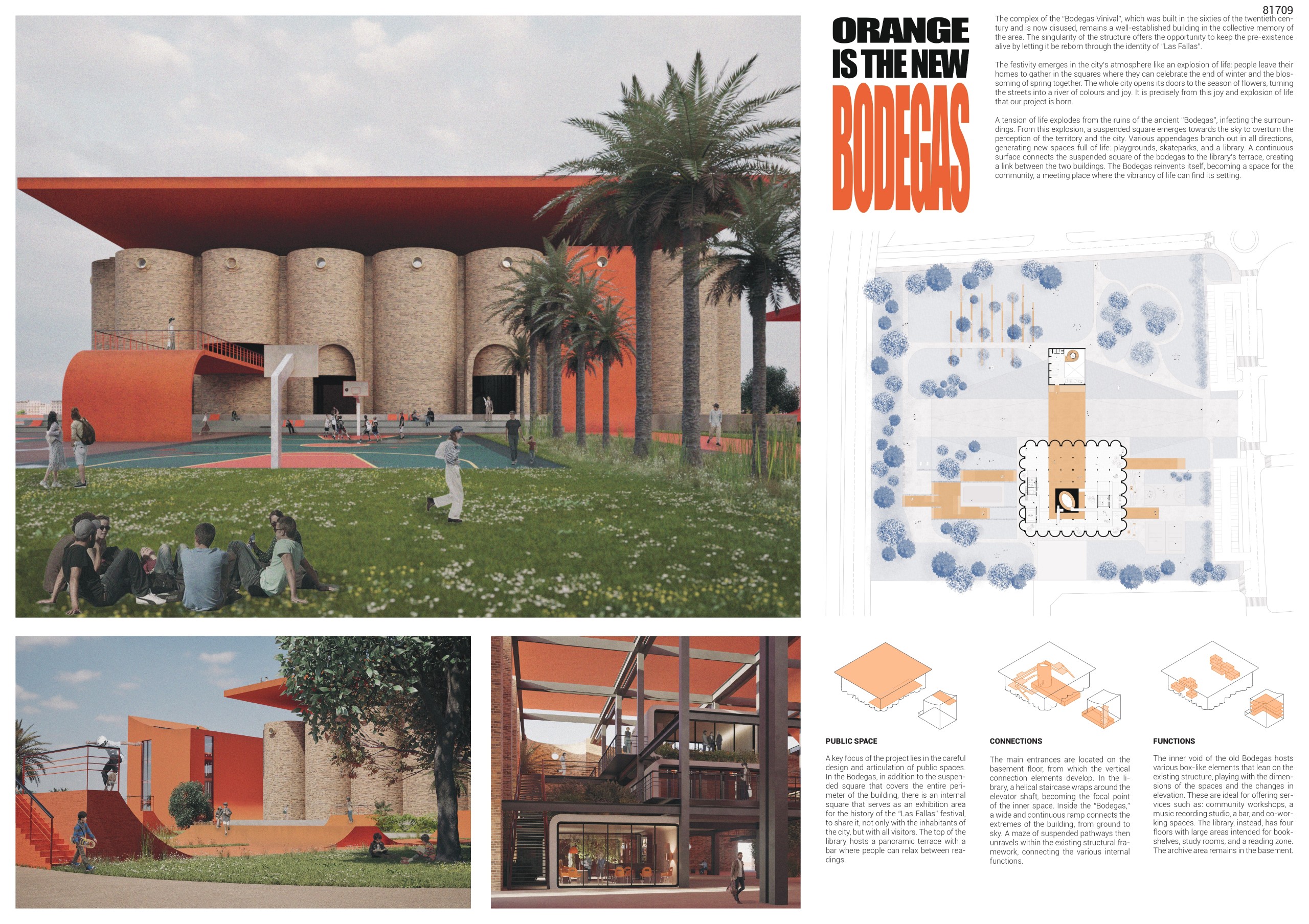 The former winery complex is transformed through adaptive reuse, where the metallic silos become inhabitable structures capable of assuming multiple functions—viewpoints, water fountains, reading spaces, or vertical circulations. The building takes shape as an inhabited garden where the industrial fabricengages with the surrounding landscape. The central void becomes the main public space, conceived for collective activities, diverse exhibitions, and displays of Las Fallas floats—the emblematic event that gives meaning to the new architectural intervention. Fragments of demolished walls are integrated into the proposal to allow a ceaseless exchange between interior and exterior, allowing vegetation to inhabit the interior spaces and the mirror of the water to traverse them, generating a tempered and inhabitable microclimate.
