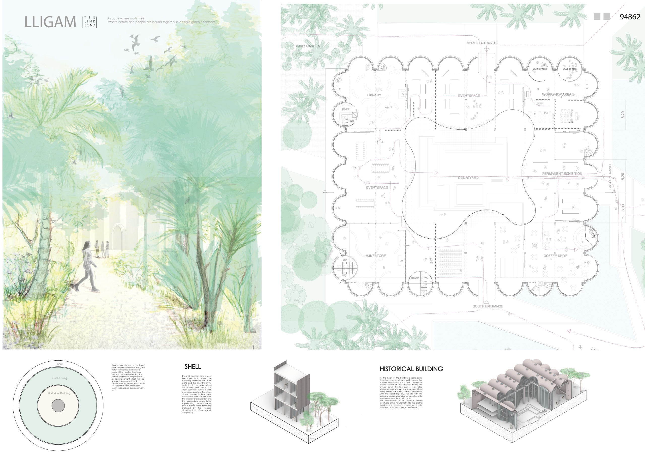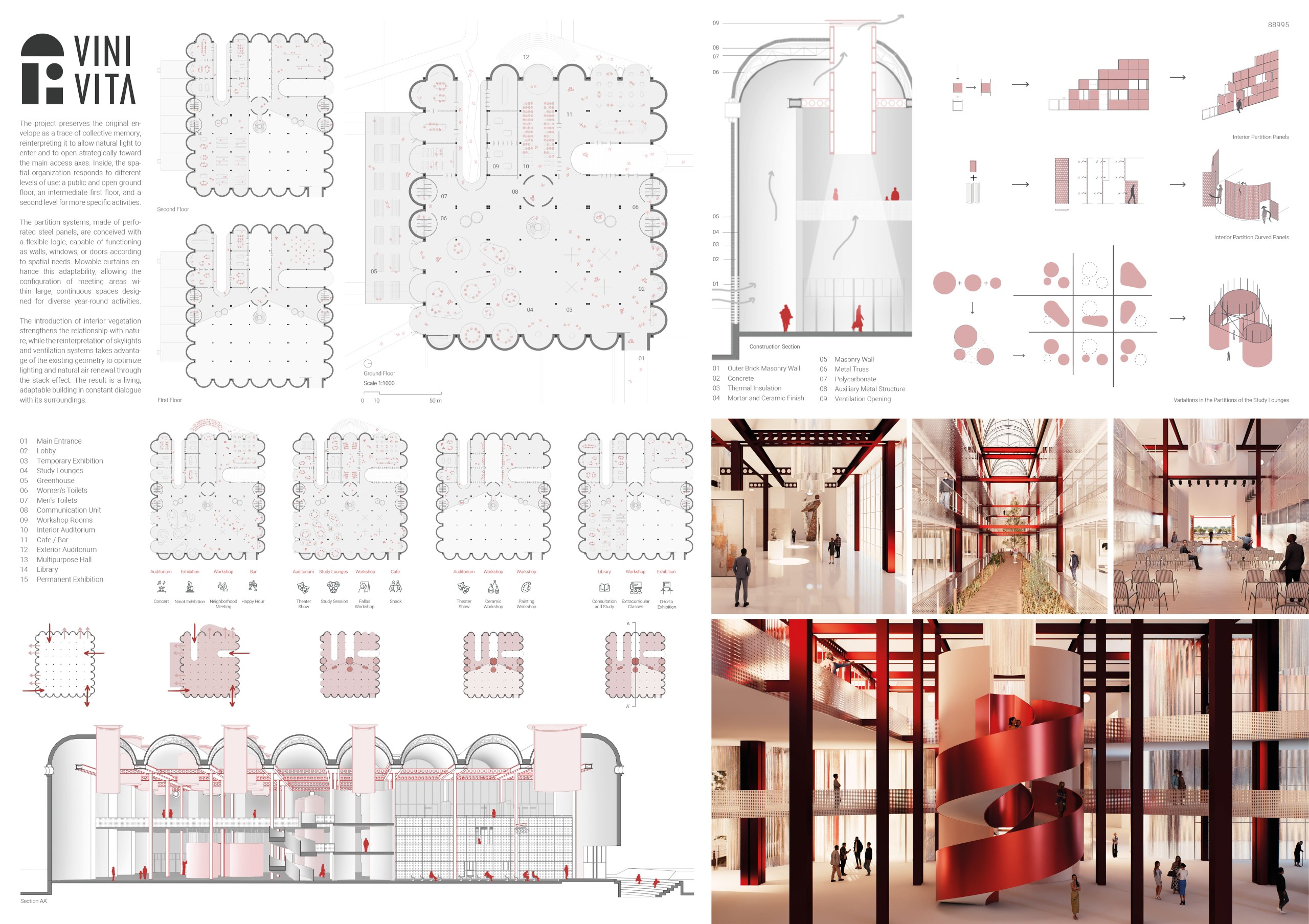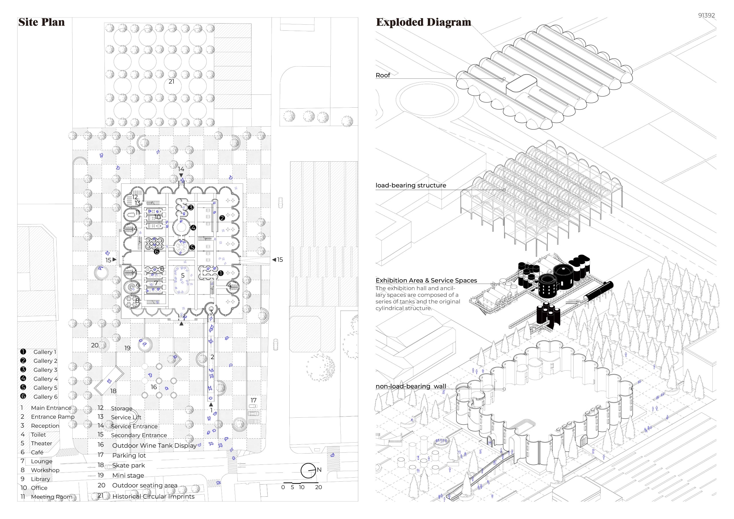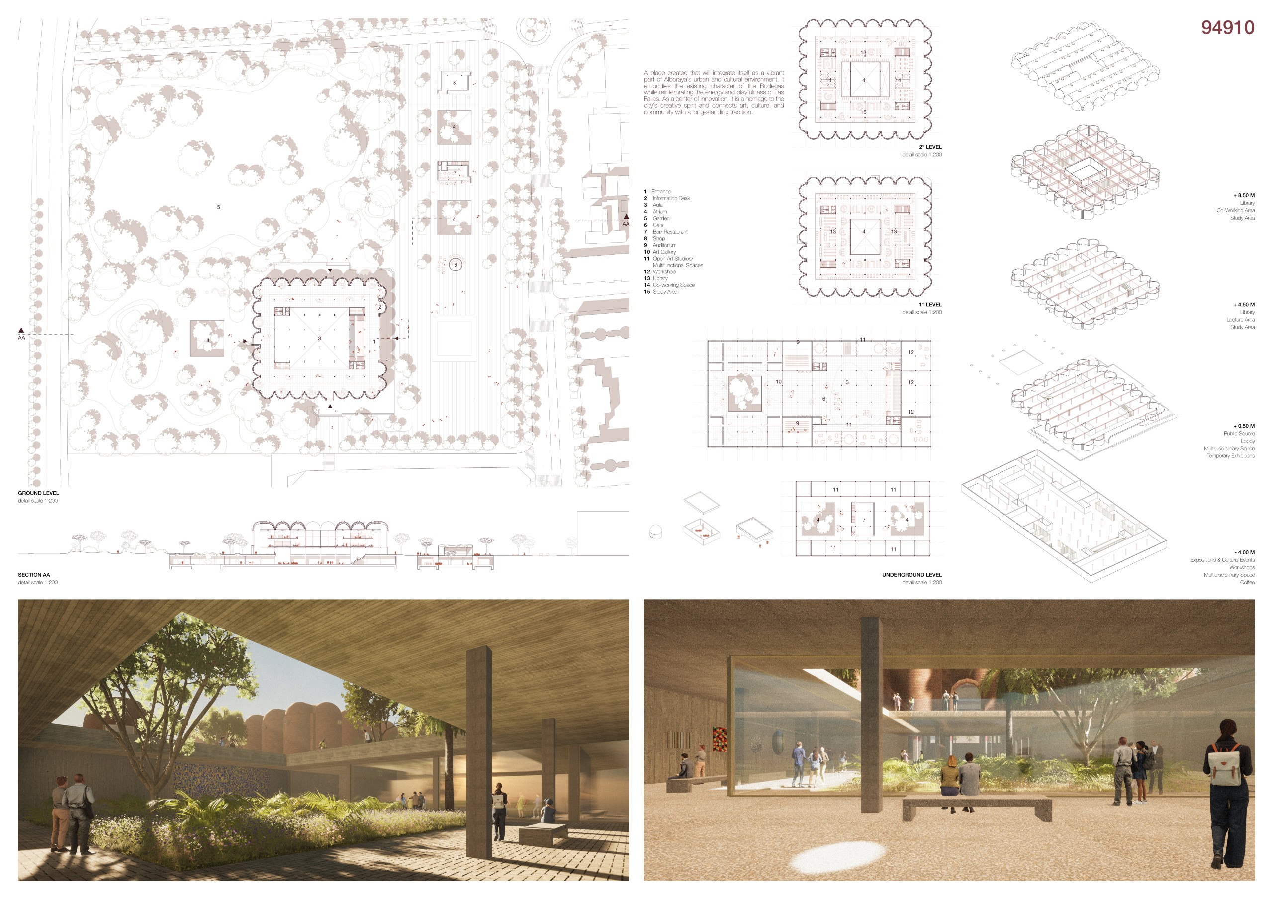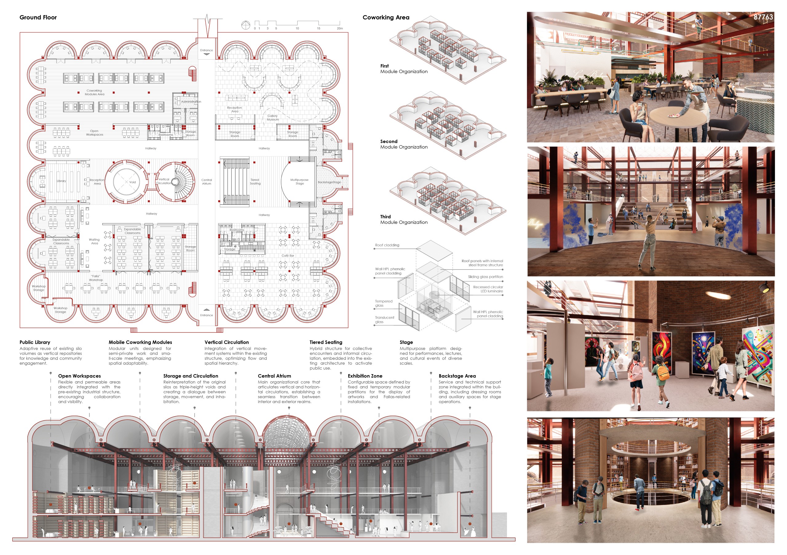 The former winery complex is transformed through adaptive reuse, where the metallic silos become inhabitable structures capable of assuming multiple functions—viewpoints, water fountains, reading spaces, or vertical circulations. The building takes shape as an inhabited garden where the industrial fabricengages with the surrounding landscape. The central void becomes the main public space, conceived for collective activities, diverse exhibitions, and displays of Las Fallas floats—the emblematic event that gives meaning to the new architectural intervention. Fragments of demolished walls are integrated into the proposal to allow a ceaseless exchange between interior and exterior, allowing vegetation to inhabit the interior spaces and the mirror of the water to traverse them, generating a tempered and inhabitable microclimate.