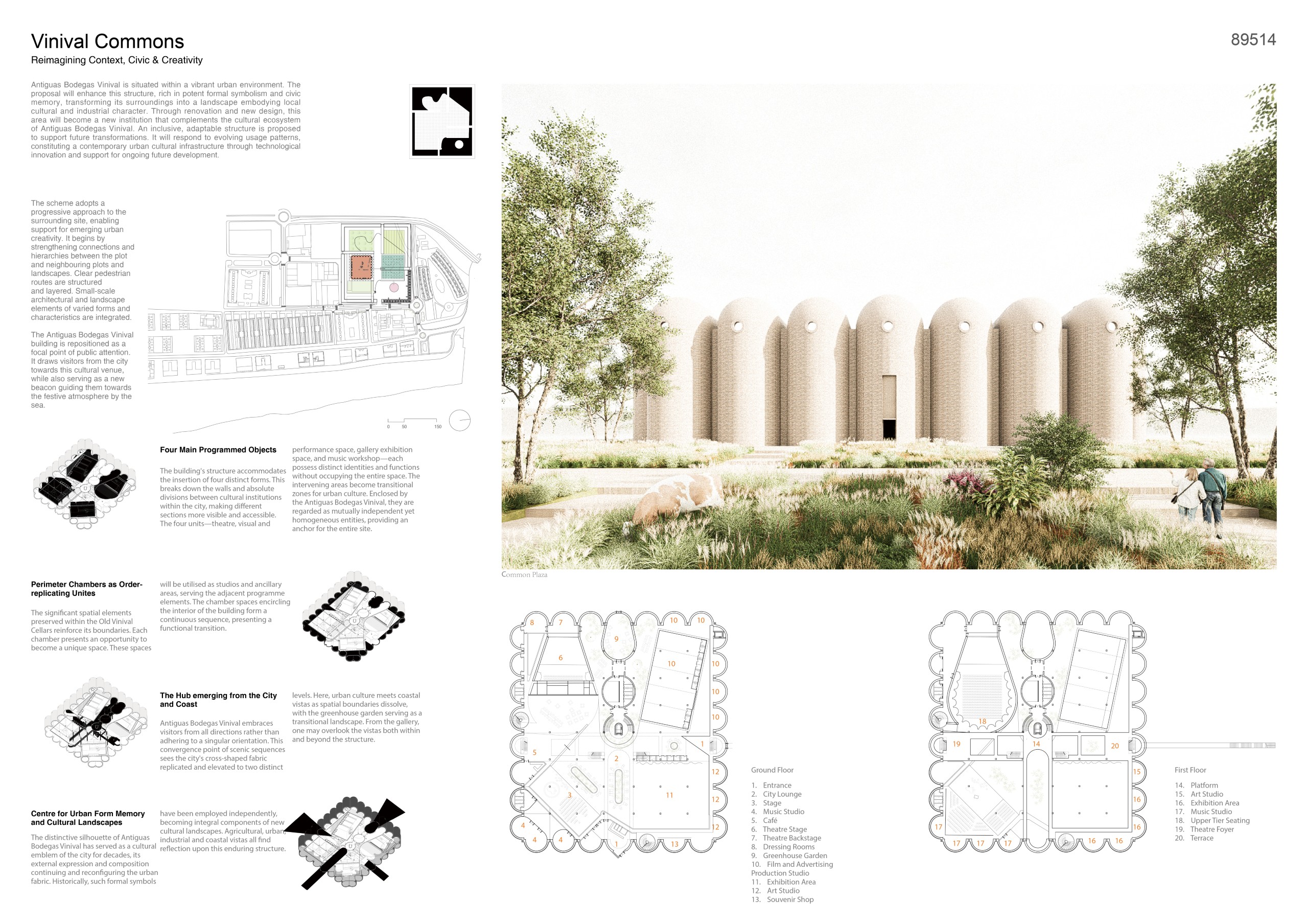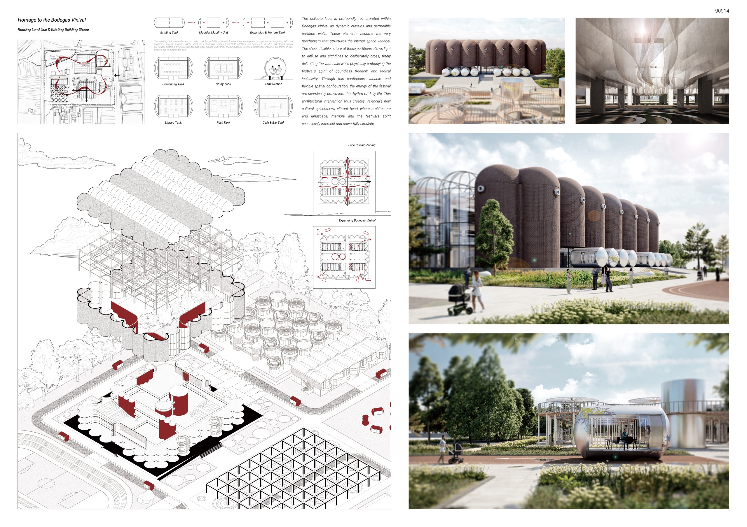 The jury praised the awarded proposals for their ability to balance innovation with deep sensitivity to the identity of Bodegas Vinival. Some projects distinguished themselves through the seamless integration of architecture, landscape and water systems, transforming industrial structures into ecological frameworks that horon both agricultural memory and the festive spirit of Las Fallas. Others were commended for their pragmatic and realistic approach, demonstrating how minimal, economically viable interventions can unlock new spatial possibilities, activate the surrounding public realm and reinterpret the existing structure with clarity and purpose. Additional recognition was given to proposals that addressed broader urban needs, pairing adaptive reuse with a coherent landscape strategy that strengthens the connection between the Bodegas and its territorial context. Together, these visions showcased a thoughtful and inspiring reimagining of the site’s cultural future.