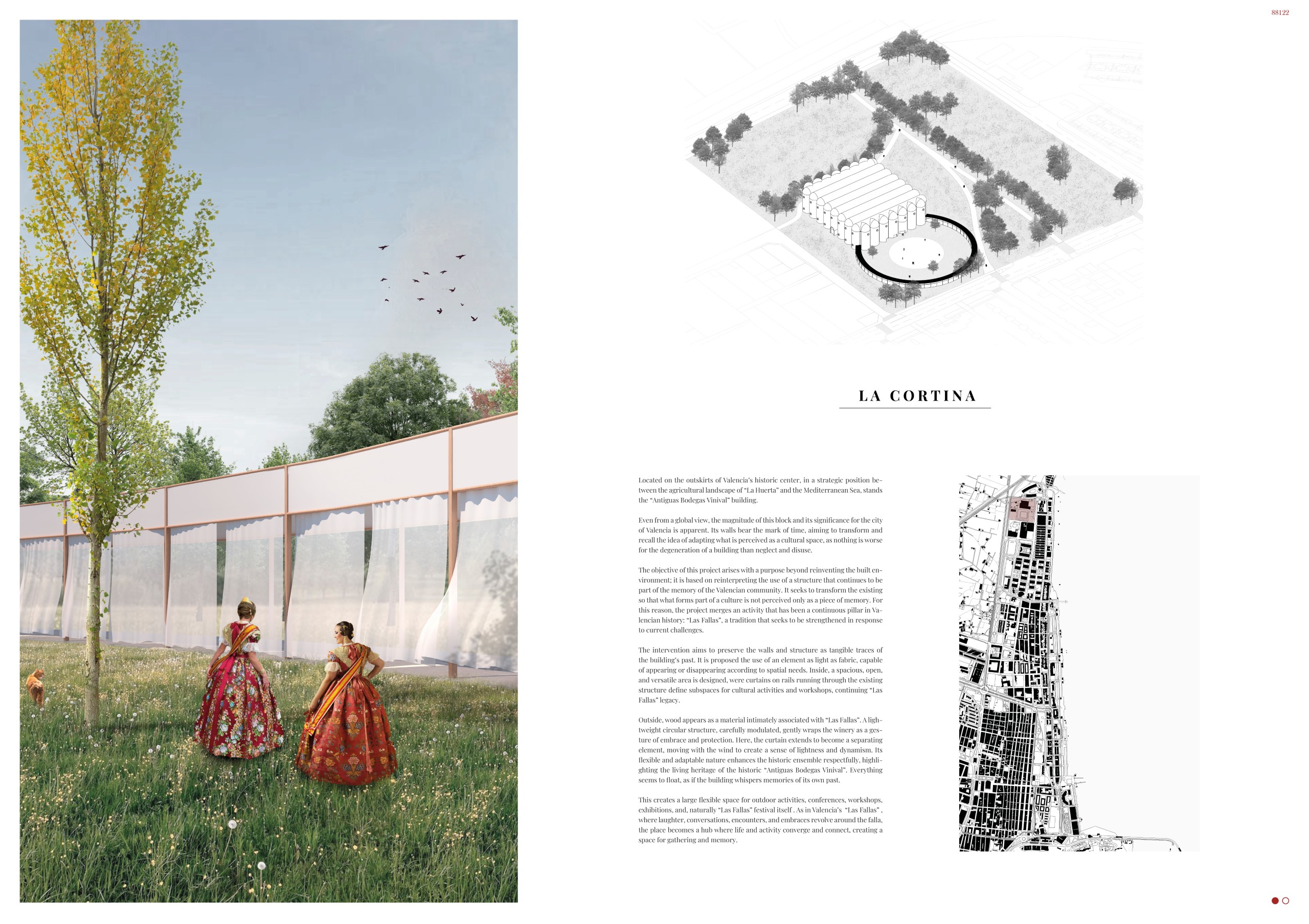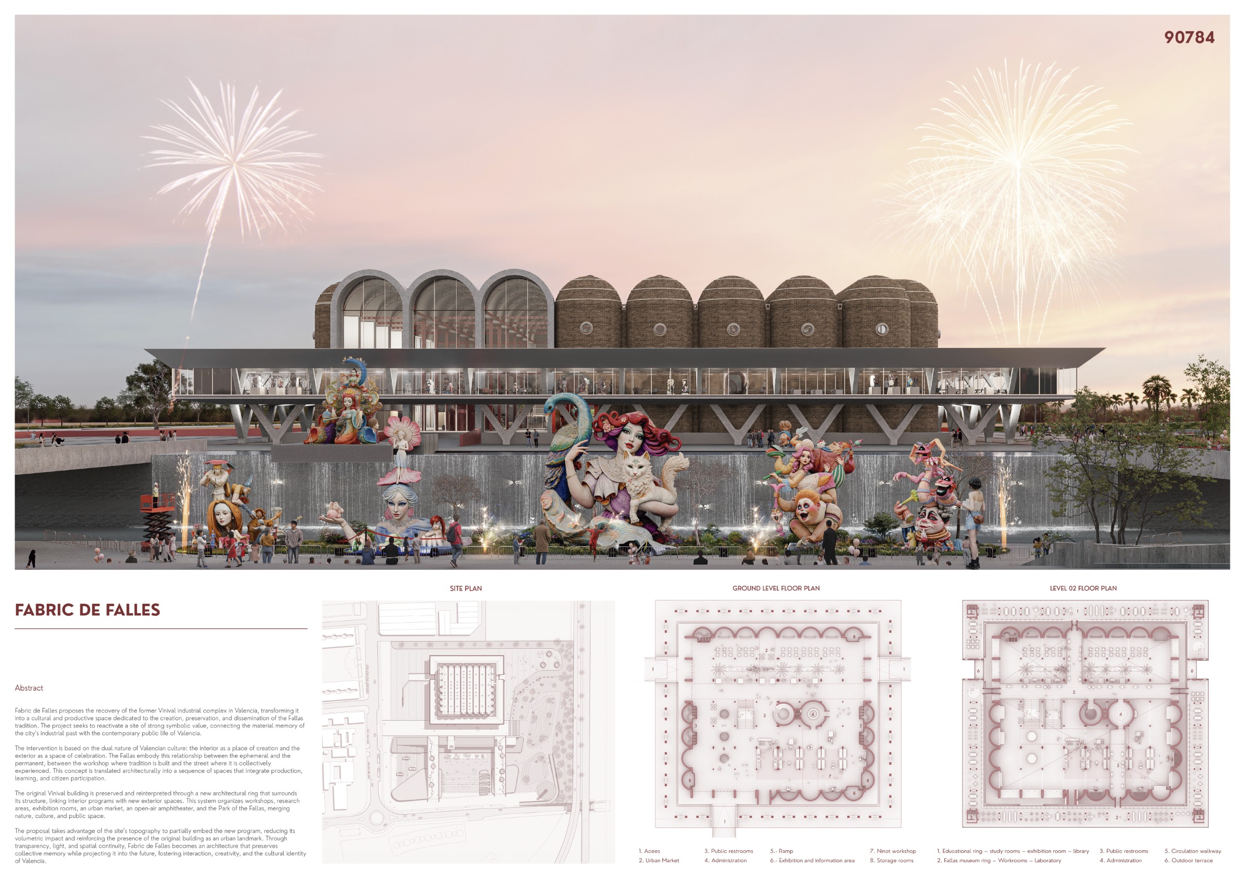 The Fabric de Falles project proposes the recovery of the former Vinival industrial complex in Valencia, transforming it into a cultural and productive center dedicated to the creation, preservation, and dissemination of the Fallas tradition. The intervention seeks to reactivate this site of great symbolic value, integrating tradition and contemporaneity through an architecture that connects industrial memory with the public life of the city.