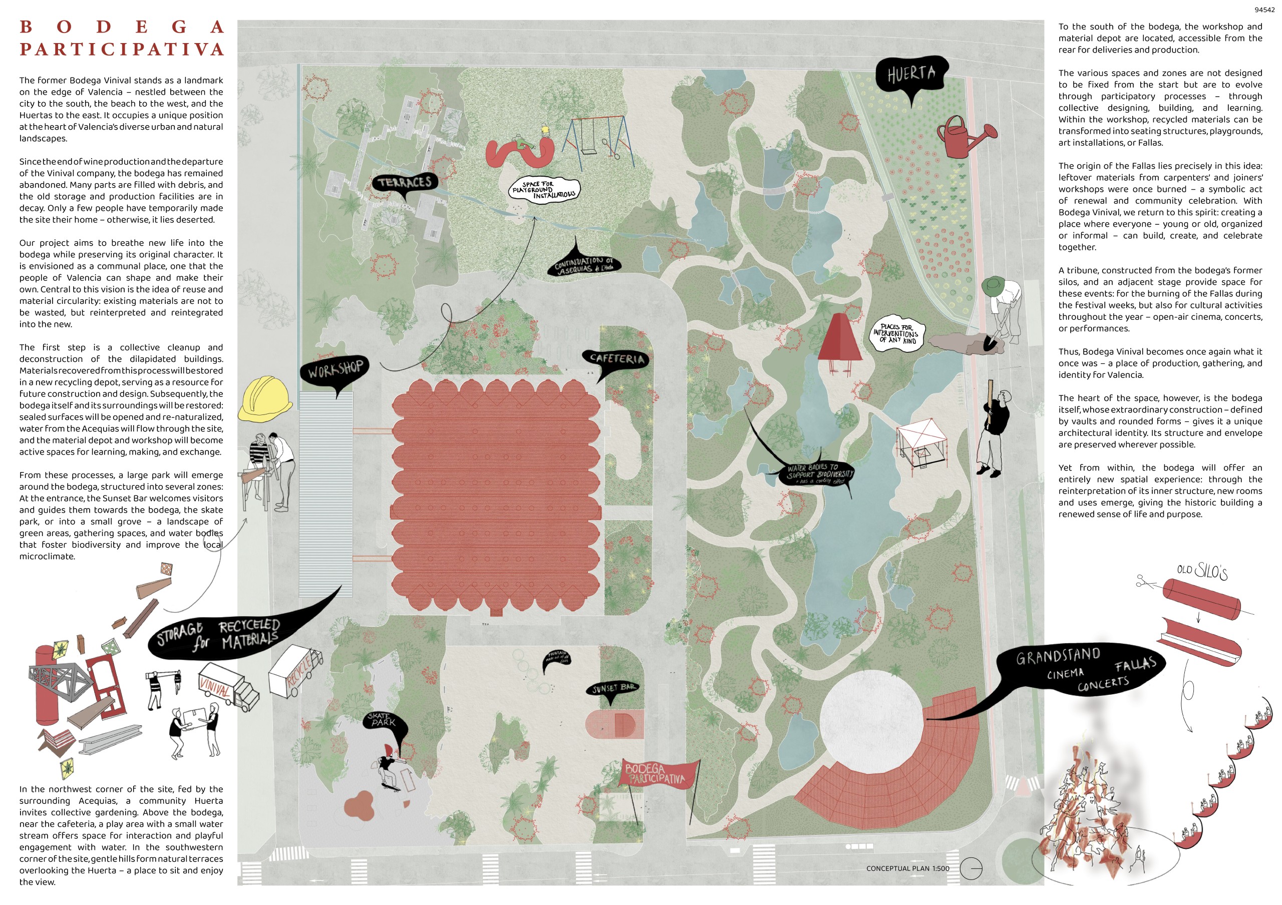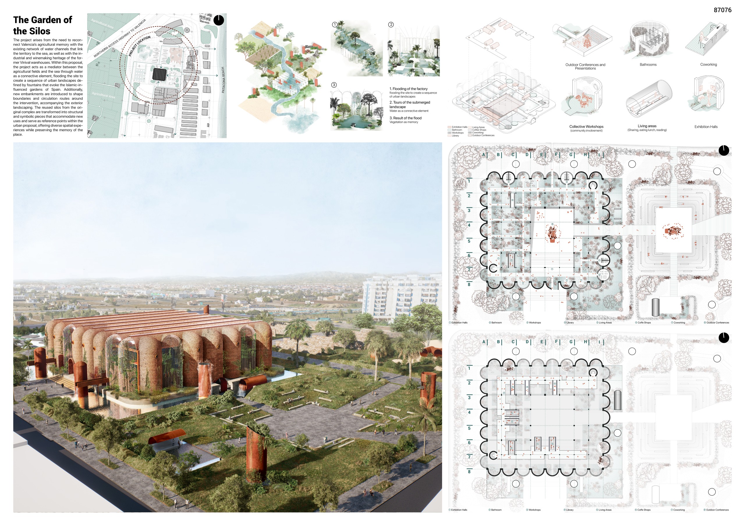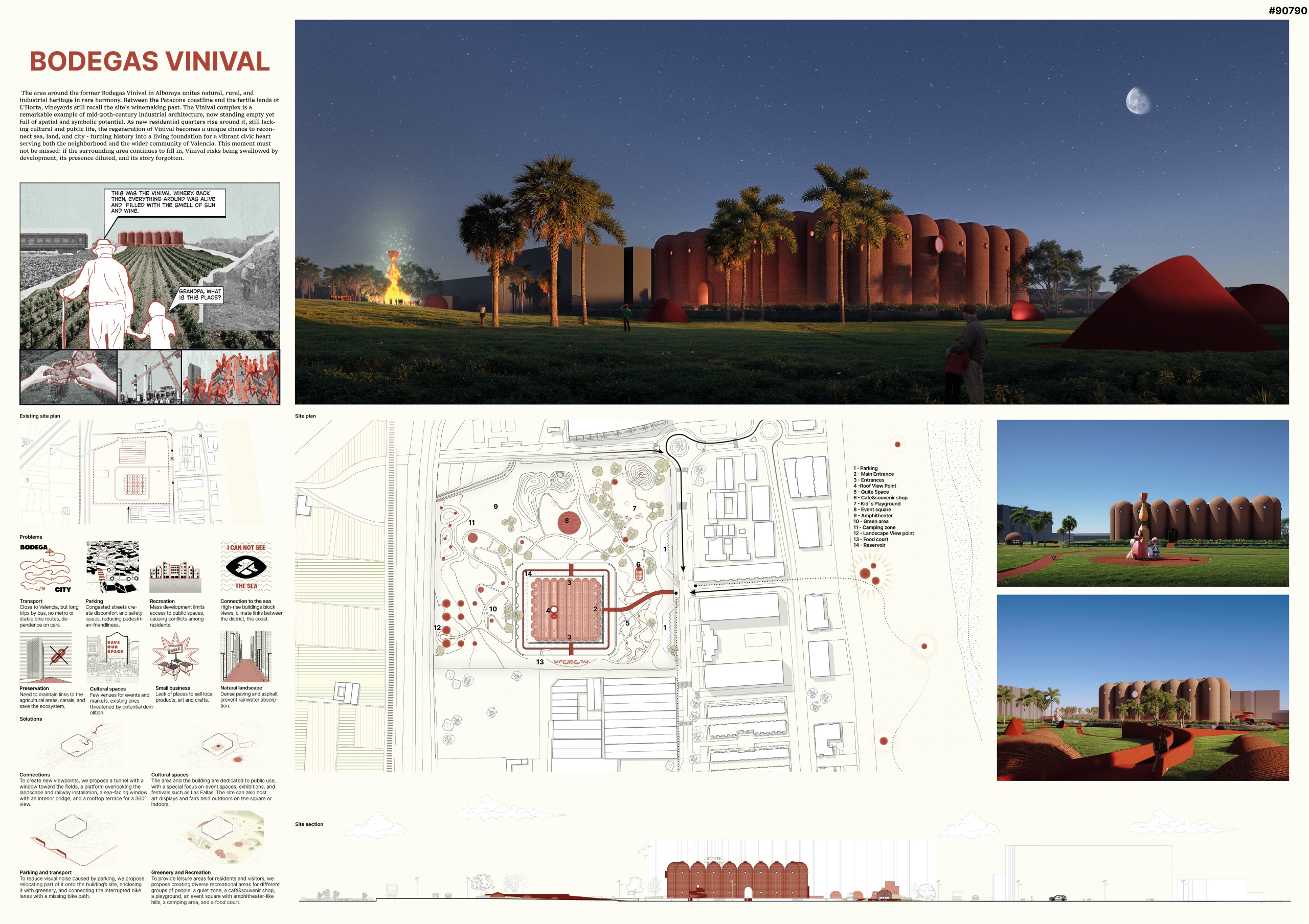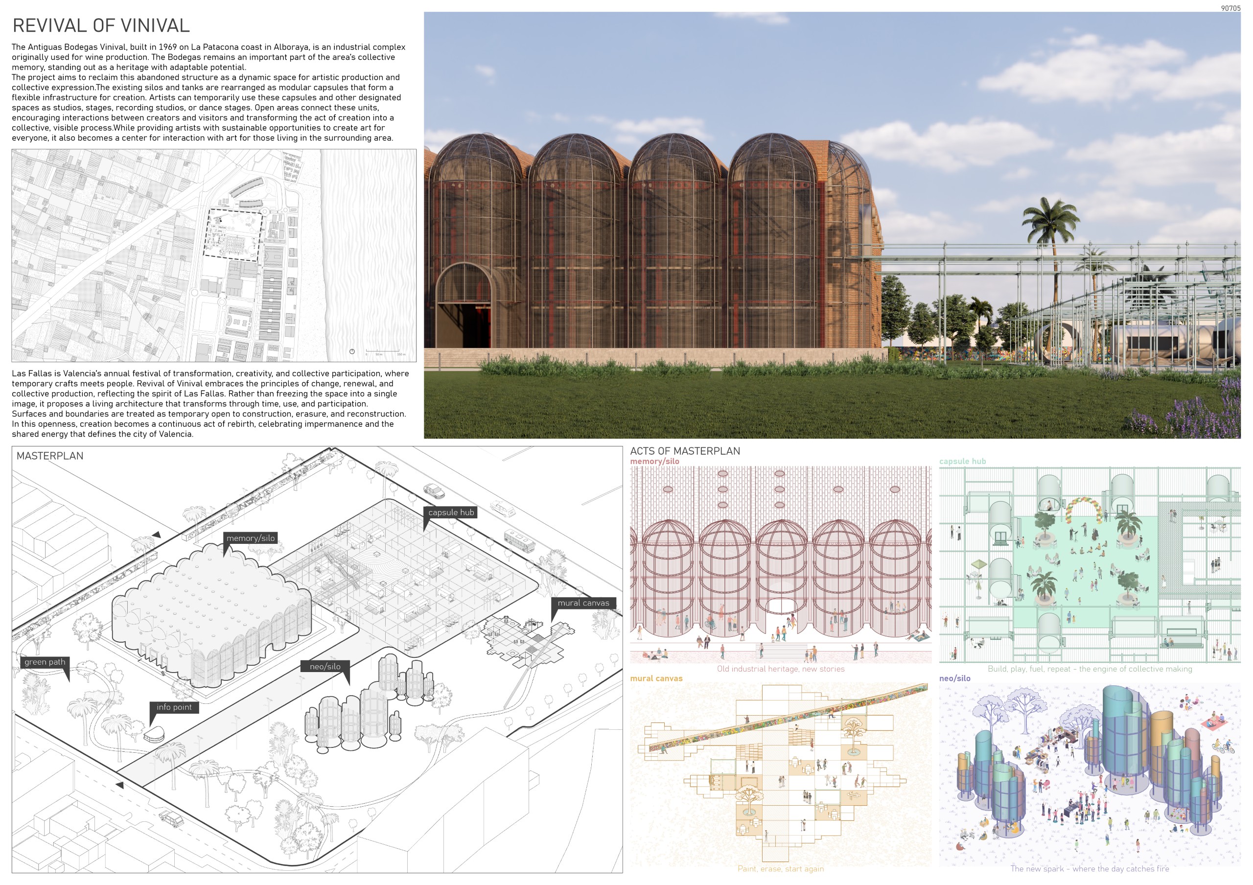 The project arises from the need to reconnect Valencia’s agricultural memory with the existing network of water channels that link the territory to the sea, as well as with the industrial and winemaking heritage of the former Vinival warehouses. Within this proposal, the project acts as a mediator between the agricultural fields and the sea through water as a connective element, floodingthe site to create a sequence of urban landscapes defined by fountains thatevoke the Islamic-influenced gardens of Spain. Additionally, new embankmentsare introduced to shape boundaries and circulation routes around the intervention, accompanying the exterior landscaping. The reused silos from the original complex are transformed into structural and symbolic pieces that accommodate new uses and serve as reference points within the urban proposal, offering diverse spatial experiences while preserving the memory of the place.