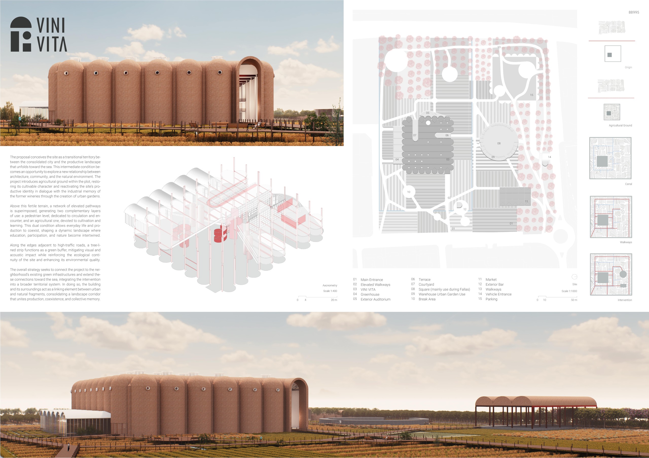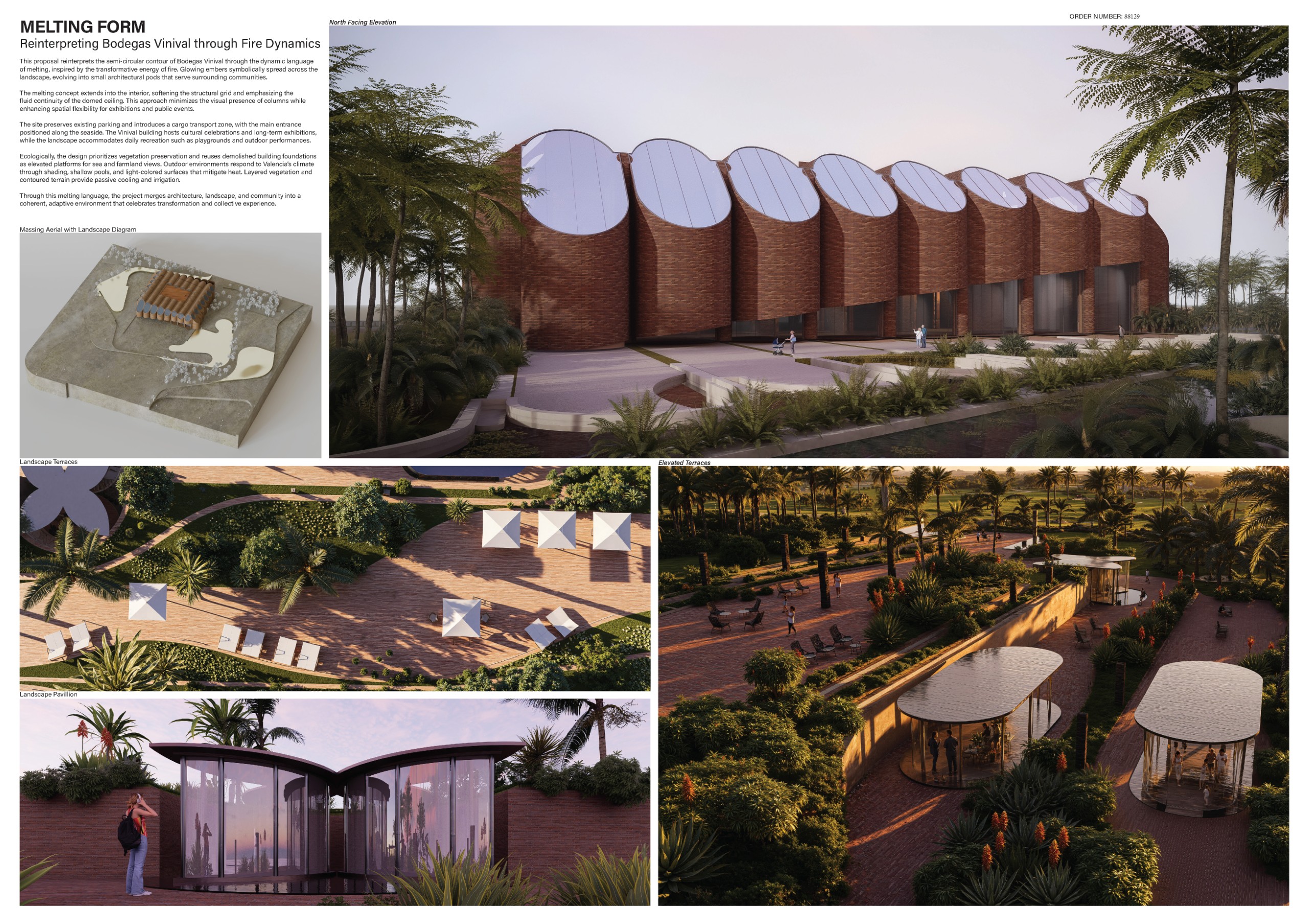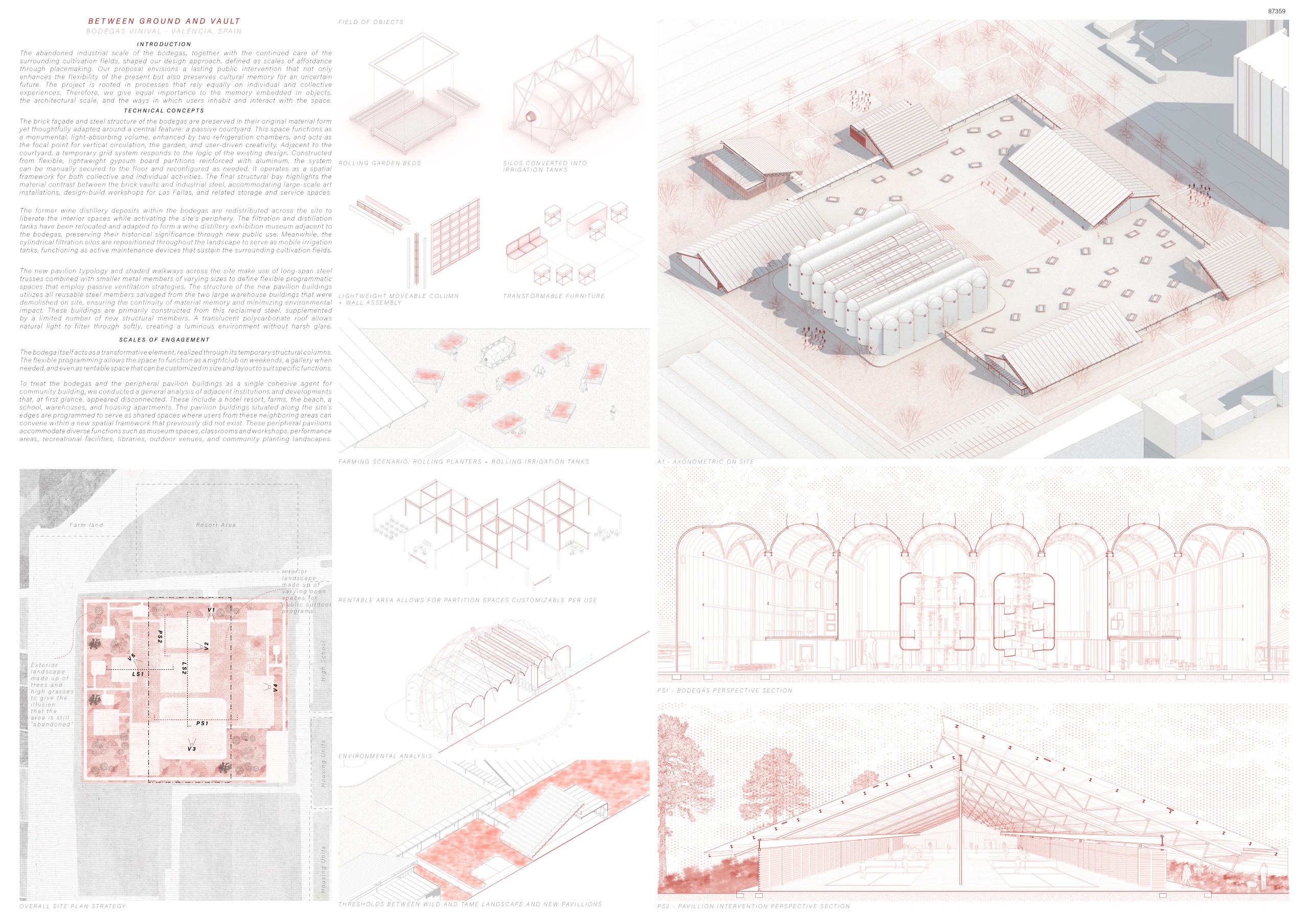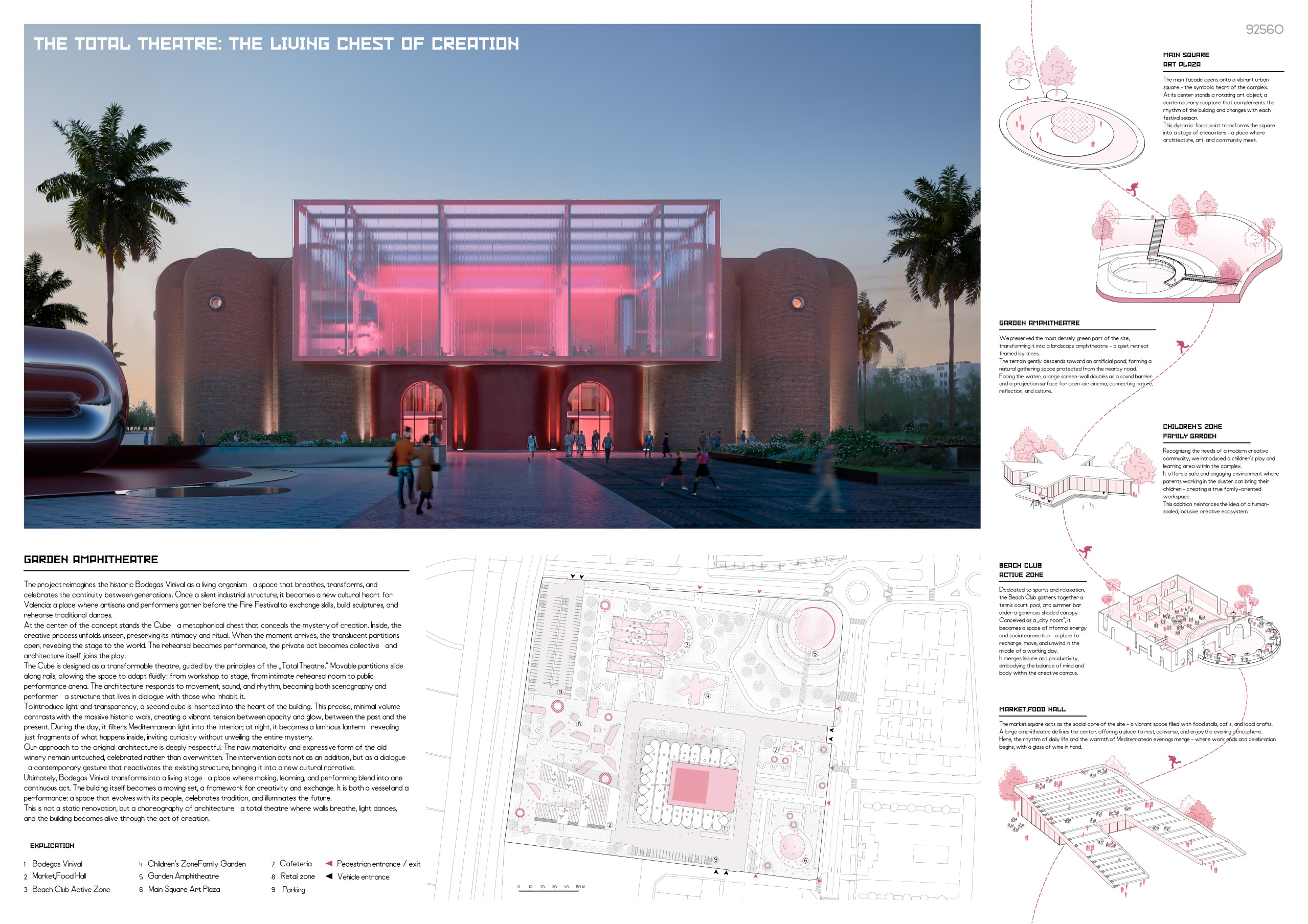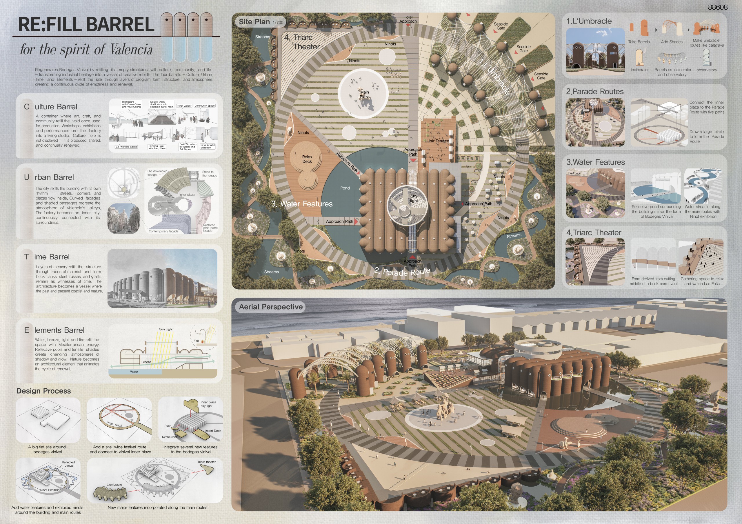 The project arises from the need to reconnect Valencia’s agricultural memory with the existing network of water channels that link the territory to the sea, as well as with the industrial and winemaking heritage of the former Vinival warehouses. Within this proposal, the project acts as a mediator between the agricultural fields and the sea through water as a connective element, floodingthe site to create a sequence of urban landscapes defined by fountains thatevoke the Islamic-influenced gardens of Spain. Additionally, new embankmentsare introduced to shape boundaries and circulation routes around the intervention, accompanying the exterior landscaping. The reused silos from the original complex are transformed into structural and symbolic pieces that accommodate new uses and serve as reference points within the urban proposal, offering diverse spatial experiences while preserving the memory of the place.