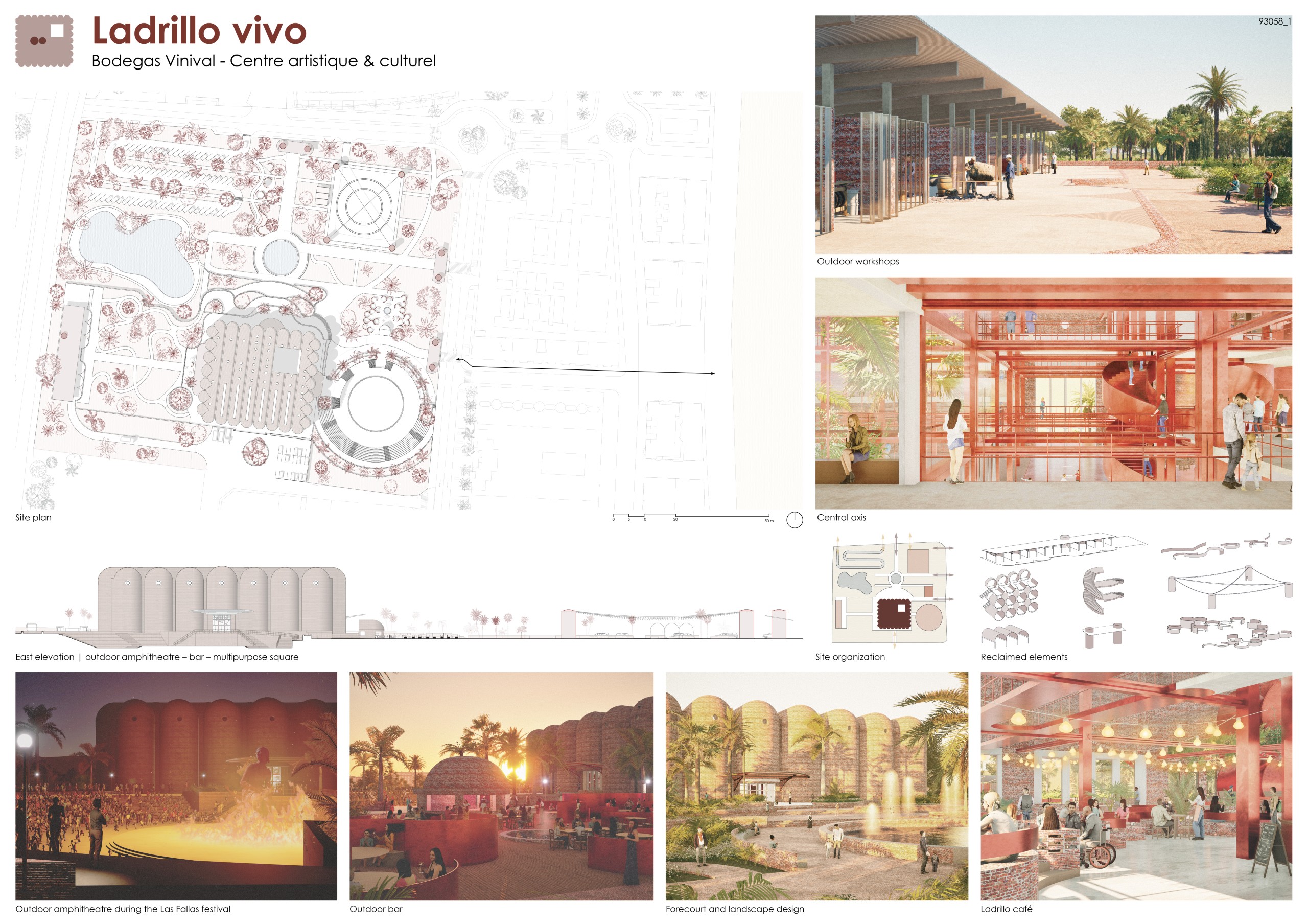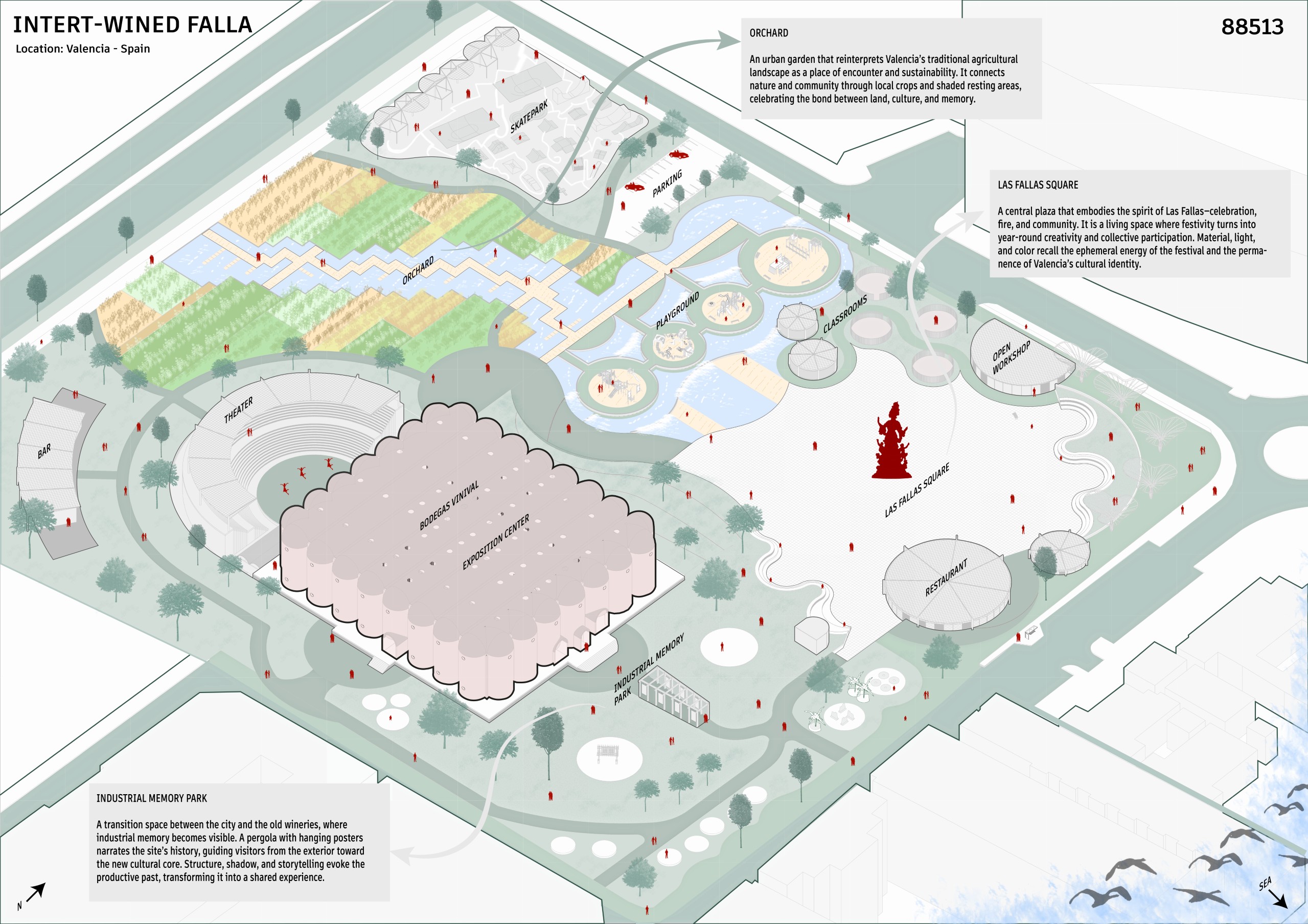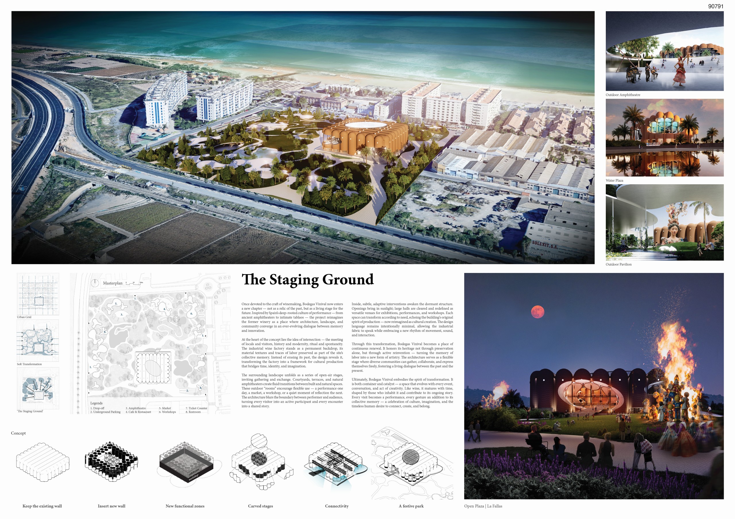 The public space is structured into three sectors aligned along thenorth-south axis, unified by a perimeter circuit that gives rise to different shaded and resting areas. On the western elevation, facing the orchards, vegetation dominates, recognizing existing species while incorporating native plants. Towards the east, facing the see and the city, the space takes on a recreational character and incorporates reflective water features that evoke dialogue with the sea. At the northern end, the bonfire is located, serving as the stage for the ritual act of burning, conceived as a contemplative plaza. Acontinuous platform connects the winery with this space, beneath which a lower level is developed for gatherings andfire ceremonies. Surrounding this core are workshops, a cafe, and exhibition niches that reinterpret the formal language of the old wineries, housing fallas or their remnants.