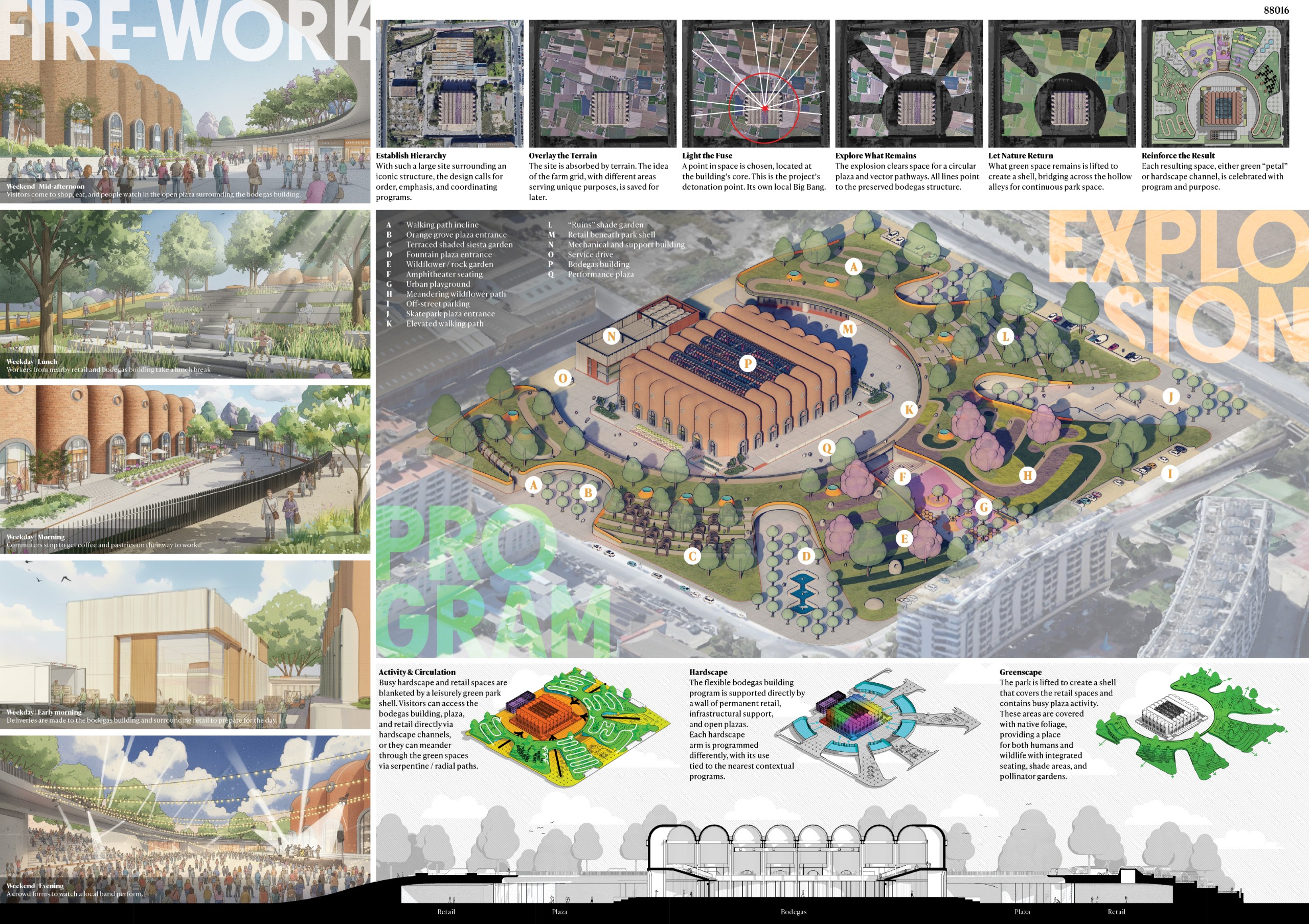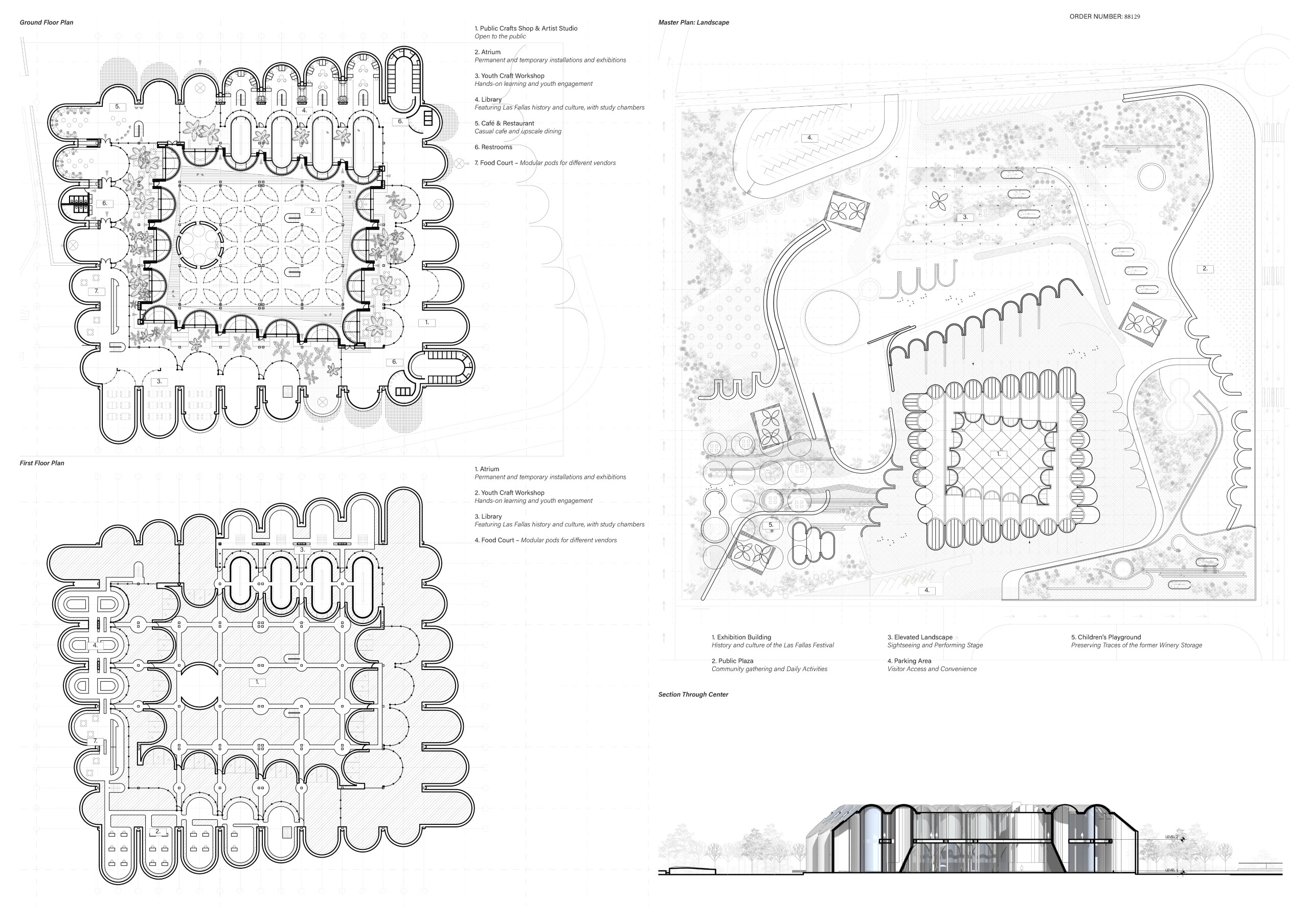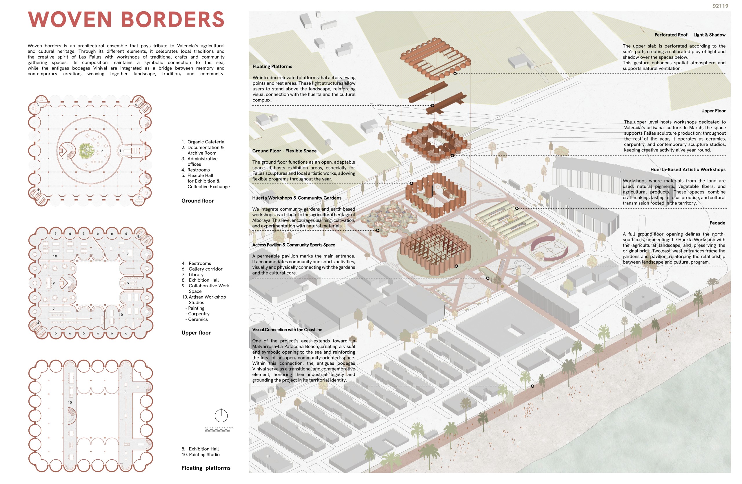 The public space is structured into three sectors aligned along thenorth-south axis, unified by a perimeter circuit that gives rise to different shaded and resting areas. On the western elevation, facing the orchards, vegetation dominates, recognizing existing species while incorporating native plants. Towards the east, facing the see and the city, the space takes on a recreational character and incorporates reflective water features that evoke dialogue with the sea. At the northern end, the bonfire is located, serving as the stage for the ritual act of burning, conceived as a contemplative plaza. Acontinuous platform connects the winery with this space, beneath which a lower level is developed for gatherings andfire ceremonies. Surrounding this core are workshops, a cafe, and exhibition niches that reinterpret the formal language of the old wineries, housing fallas or their remnants.