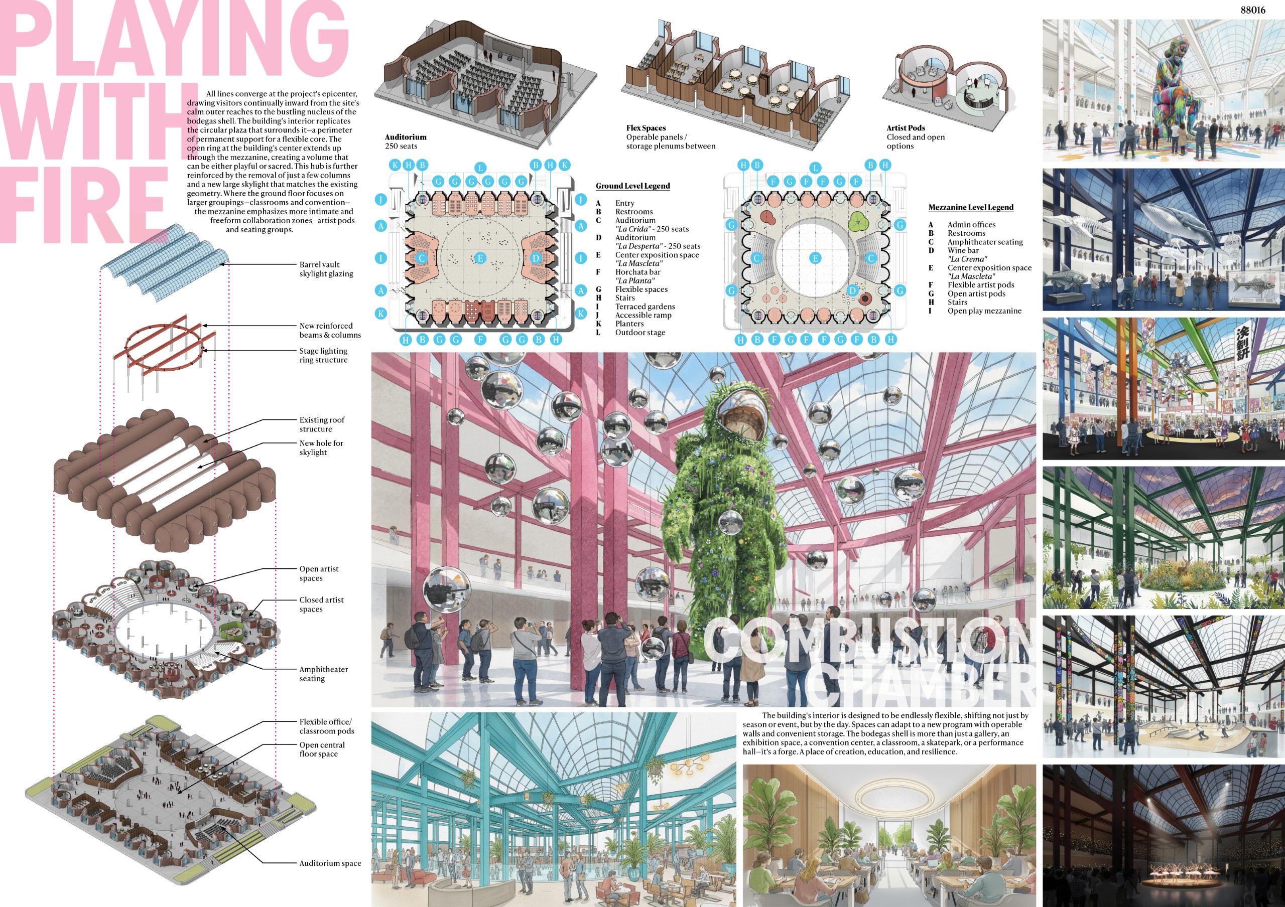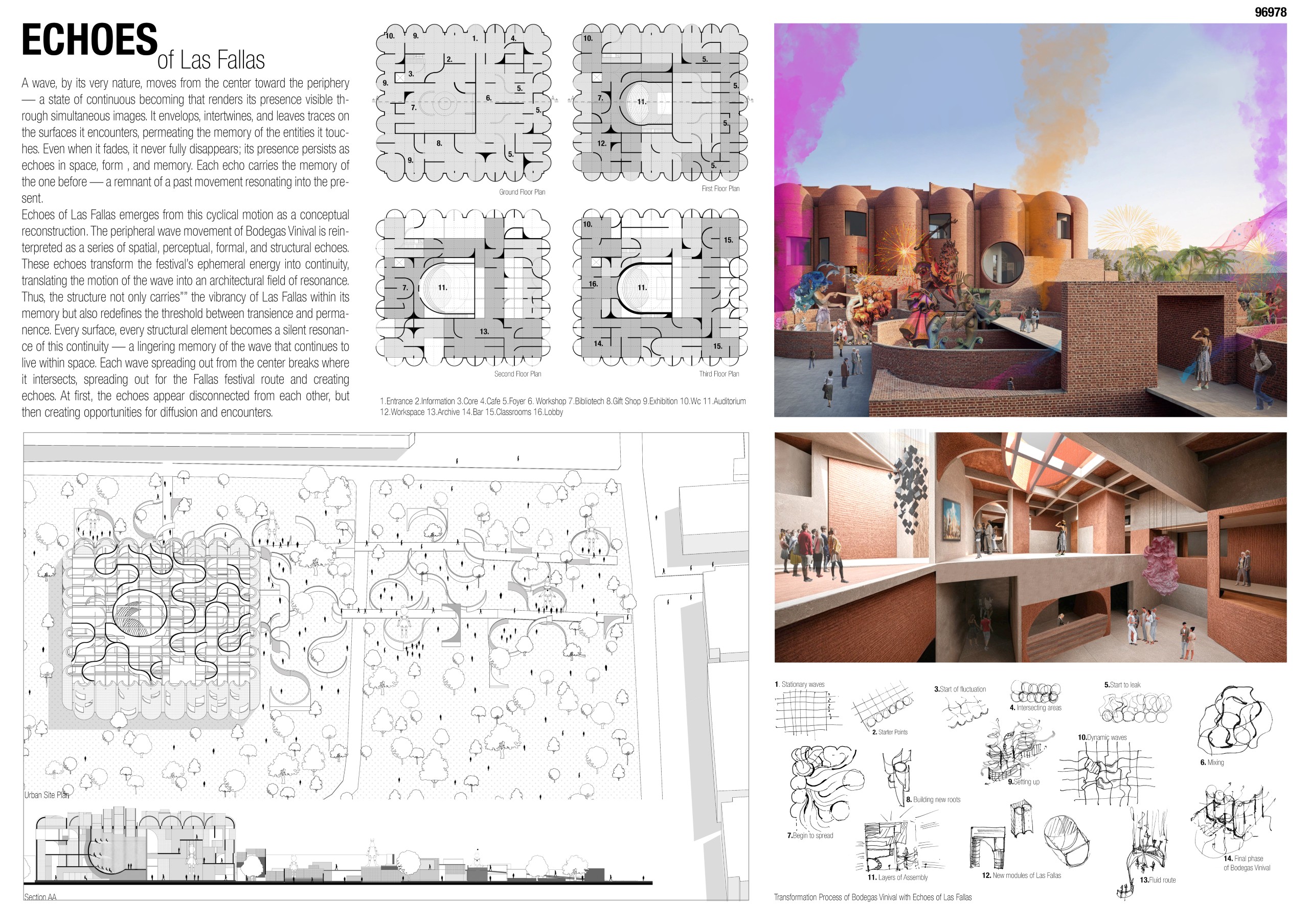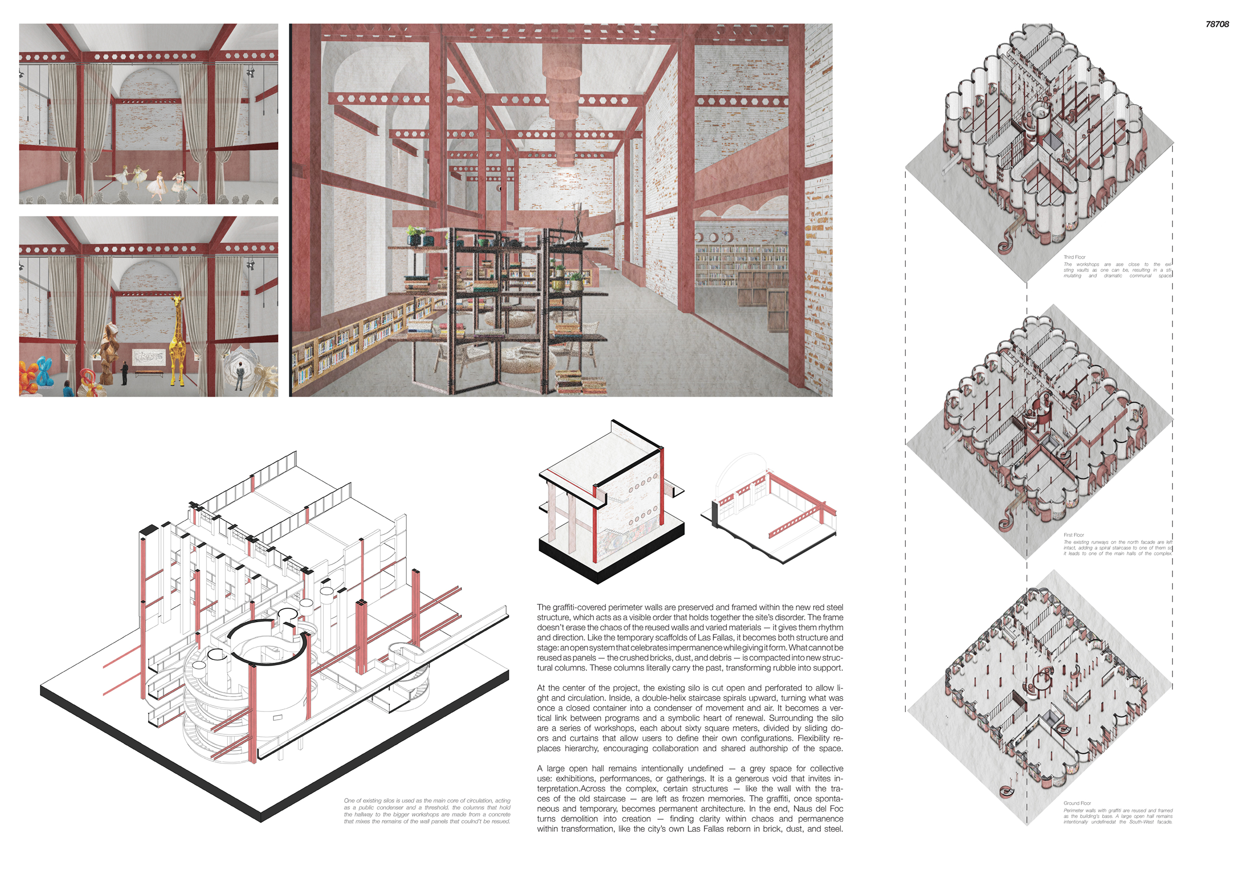 This project offers an architectural reinterpretation of Las Fallas, the ritualistic and cyclical festival of Valencia. Each year, monumental figures are built only to be burned—an act not of erasure, but of transformation. Here, the logic of disappearance as renewal becomes the framework for design, inviting architecture to function not as a fixed object, but as a process of deconstruction, redistribution, and regrowth.