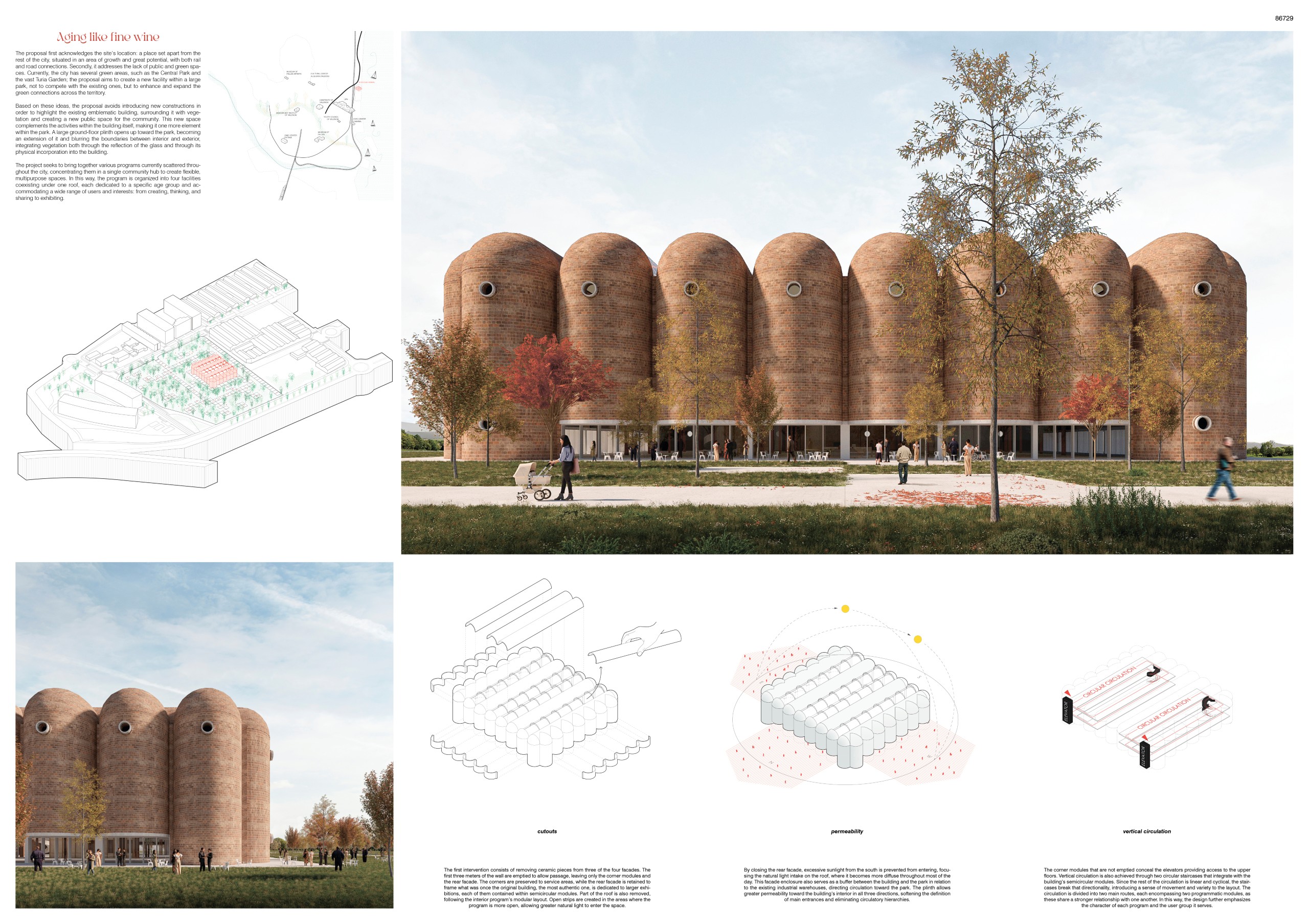 The proposal begins by acknowledging the unique condition of the site: a strategically located yet isolated area positioned for significant urban development growth, supported by strong rail and road connections. At the same time, the city suffers from a lack of accessible public and green spaces, despite the major assets like Central Park and Turia Garden. The project responds to this context by creating a new cultural and community facility embedded within a large park – an intervention that complements rather than competes with the existing green infrastructures while extending the ecological and social continuity across the territory.