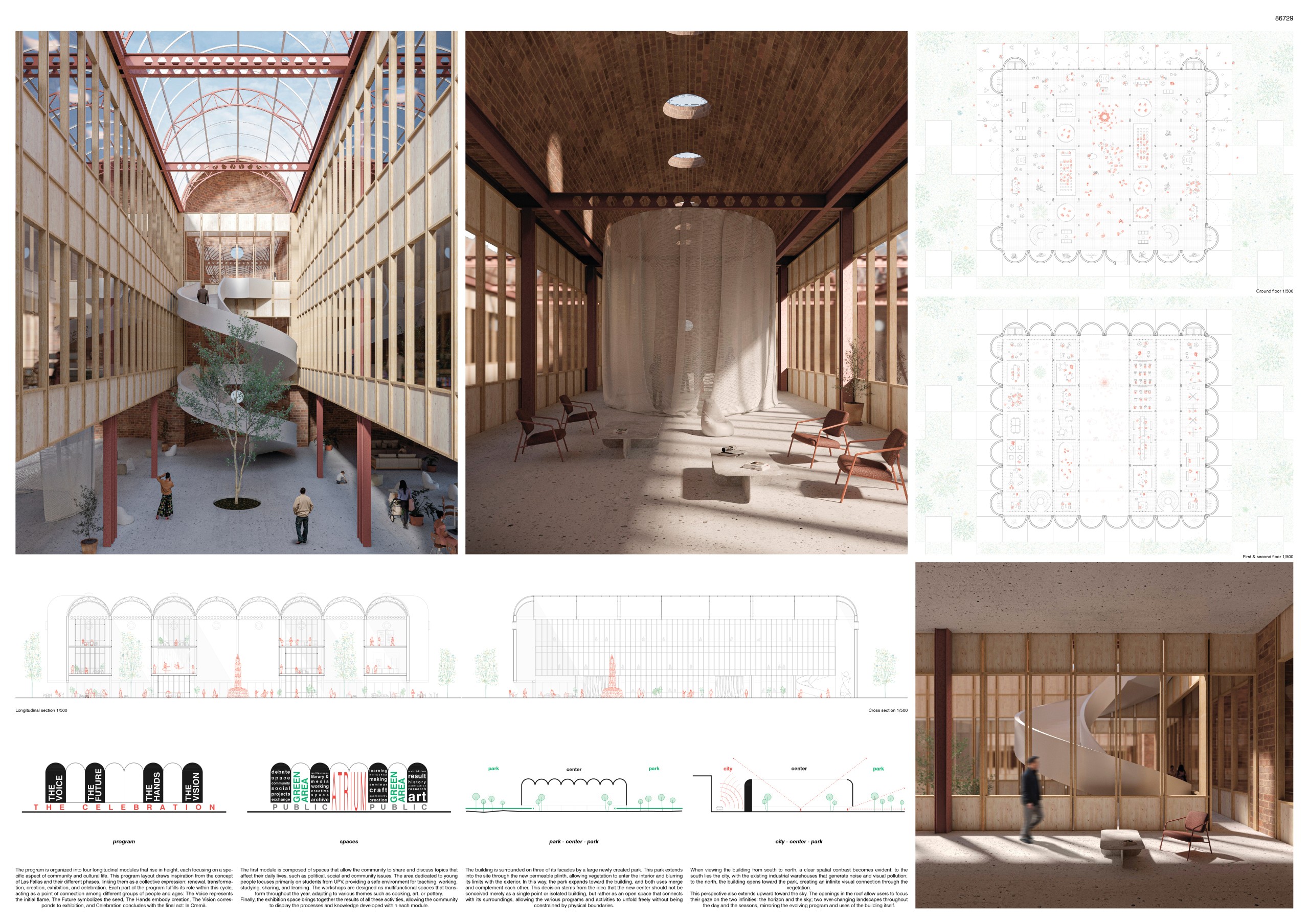 Programmatically, the project consolidates several community-oriented functions currently dispersed throughout the city. Four interconnected modules, each associated with a particular age group and mode of engagement – thinking, creating, sharing and exhibiting – come together under one roof. Each part of the program fulfills its role within this cycle, acting as a point of connection among different groups of people and ages: The Voice represents the initial flame, The Future symbolizes the seed, The Hands embody creation, The Vision corresponds to exhibition, and Celebration concludes with the final act: la Cremà.
