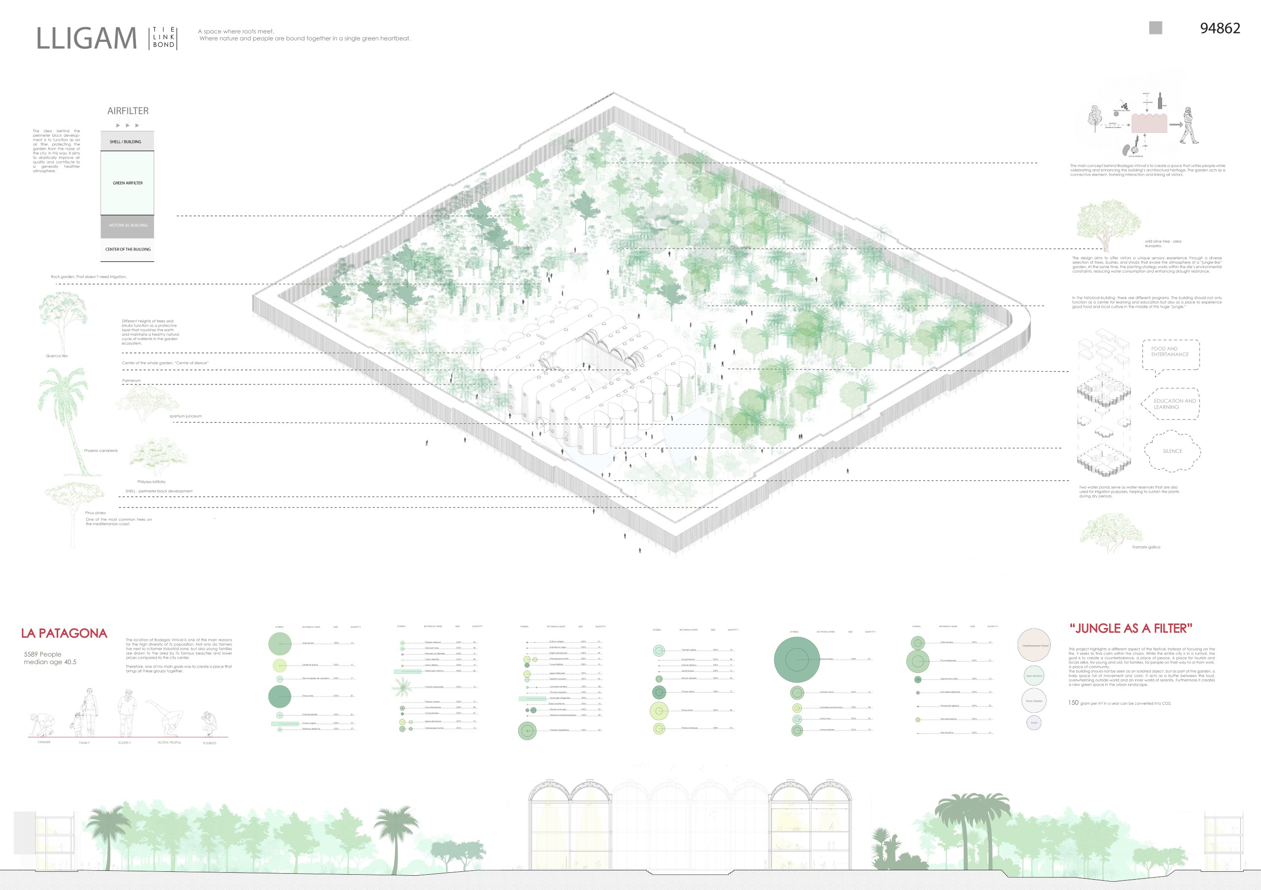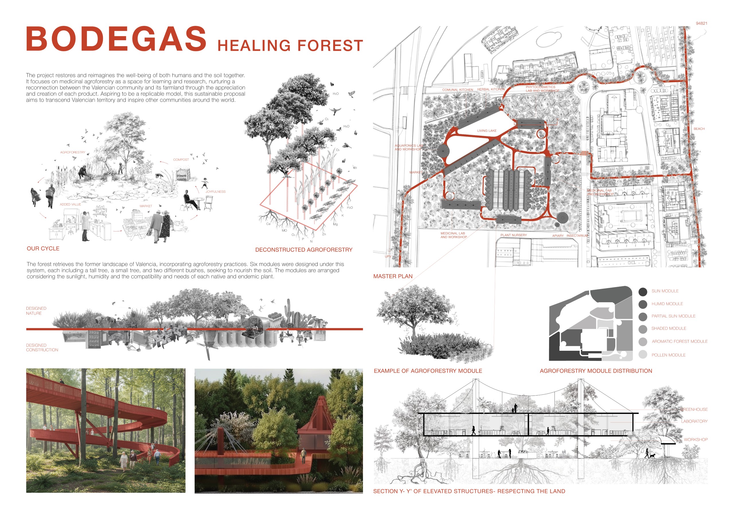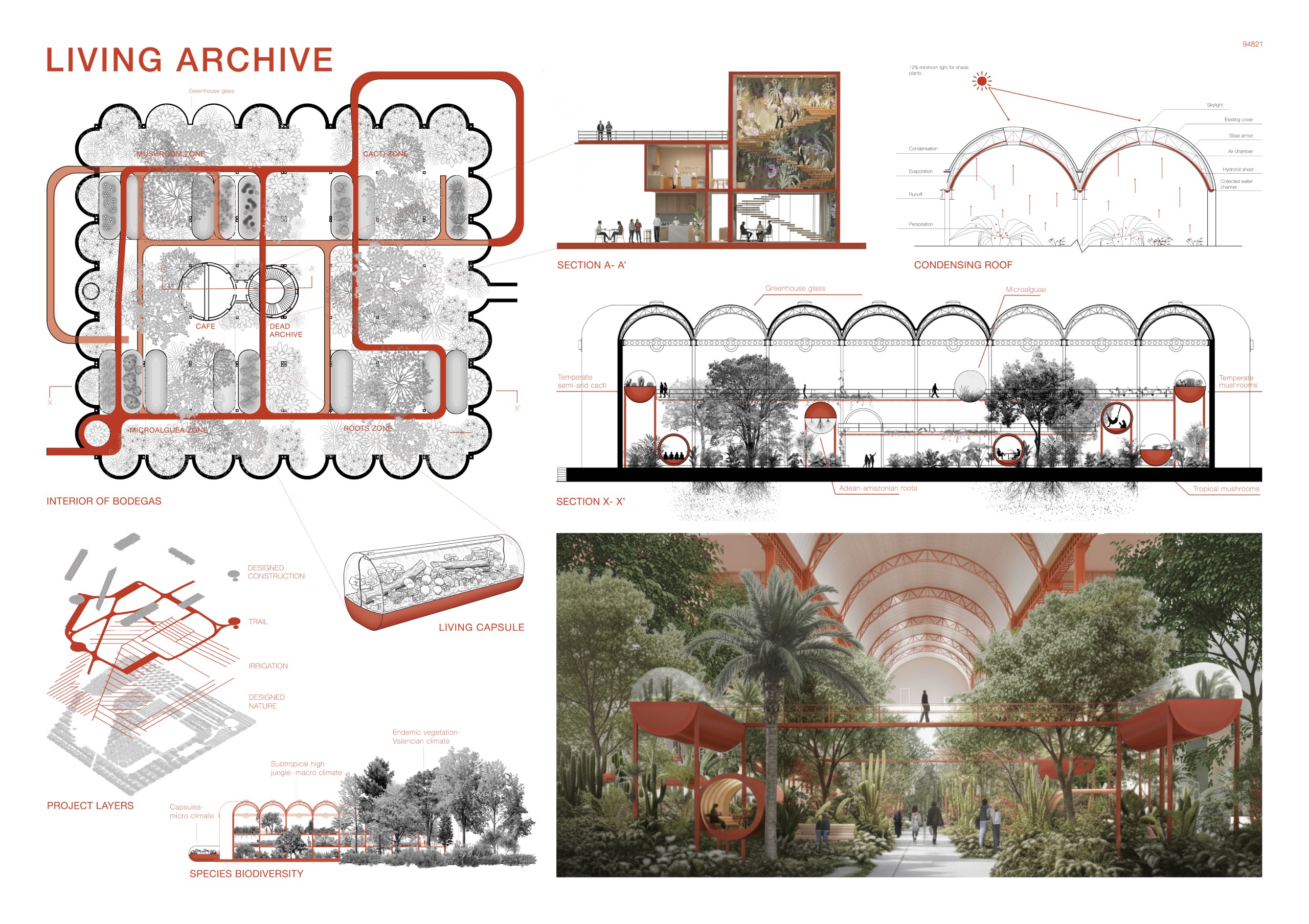 Memory and innovation. Designed under bioclimatic principles, the forest retrieves the former landscape of Valencia, incorporating agroforestry practices. Six modules were designed under this system, each including a tall tree, a small tree, and three different bushes, seeking to nourish the soil. The modules arranged considering the sunlight, humidity and the compatibility and needs of each native and endemic plant. Additionally, different species are found within the bodegas, a subtropical high jungle macroclimate and microclimates isolated in capsules with different living beings, adding biodiversity and room for more investigation.