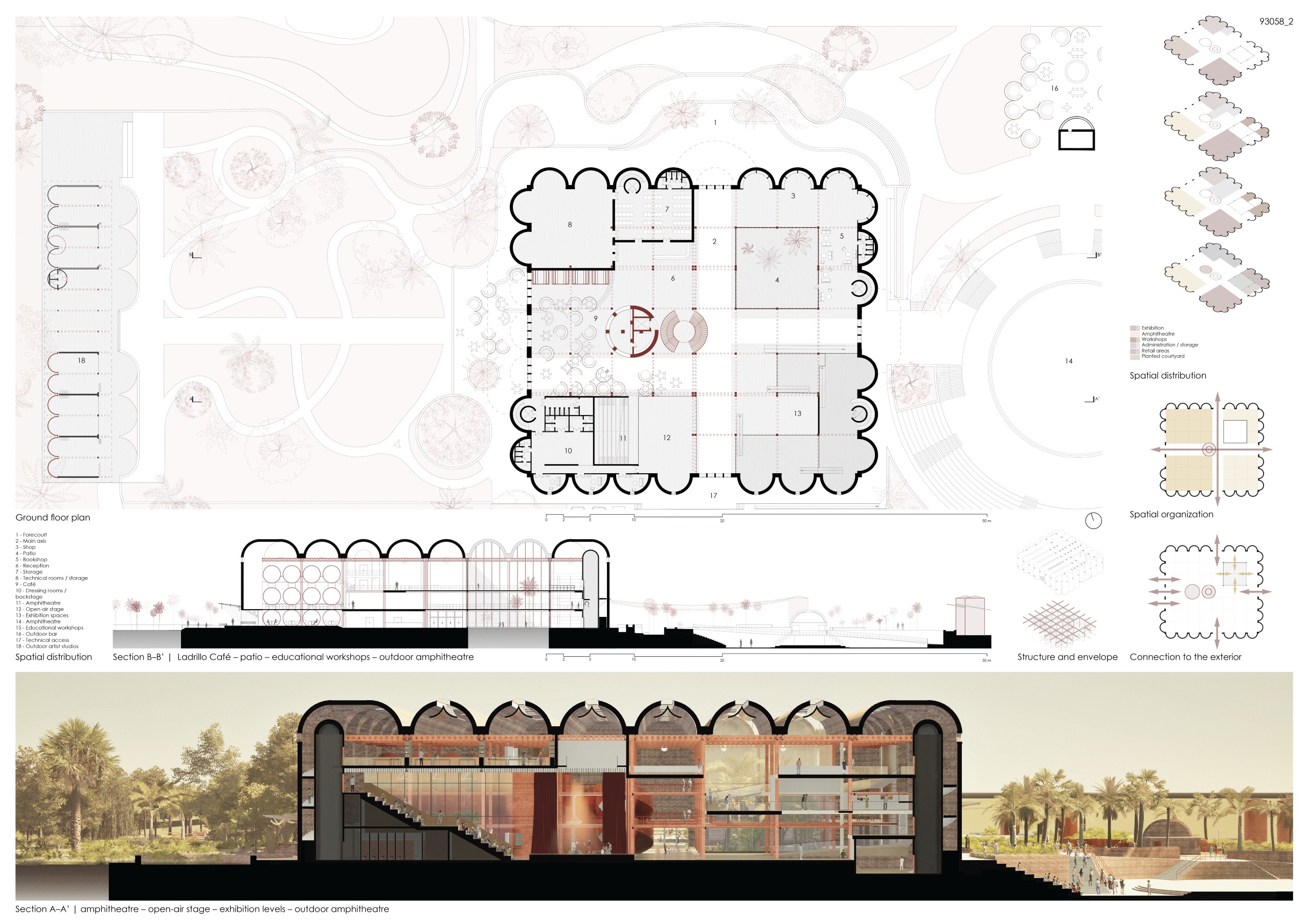 Surrounding the structure, the urban amphitheater follows the topography, gradually rising tocreate a flexible ground for festivals, performances, and daily gatherings. This amphitheaternot only defines the public realm but also softens the monumental presence of the building, bringing it closer to the human scale.