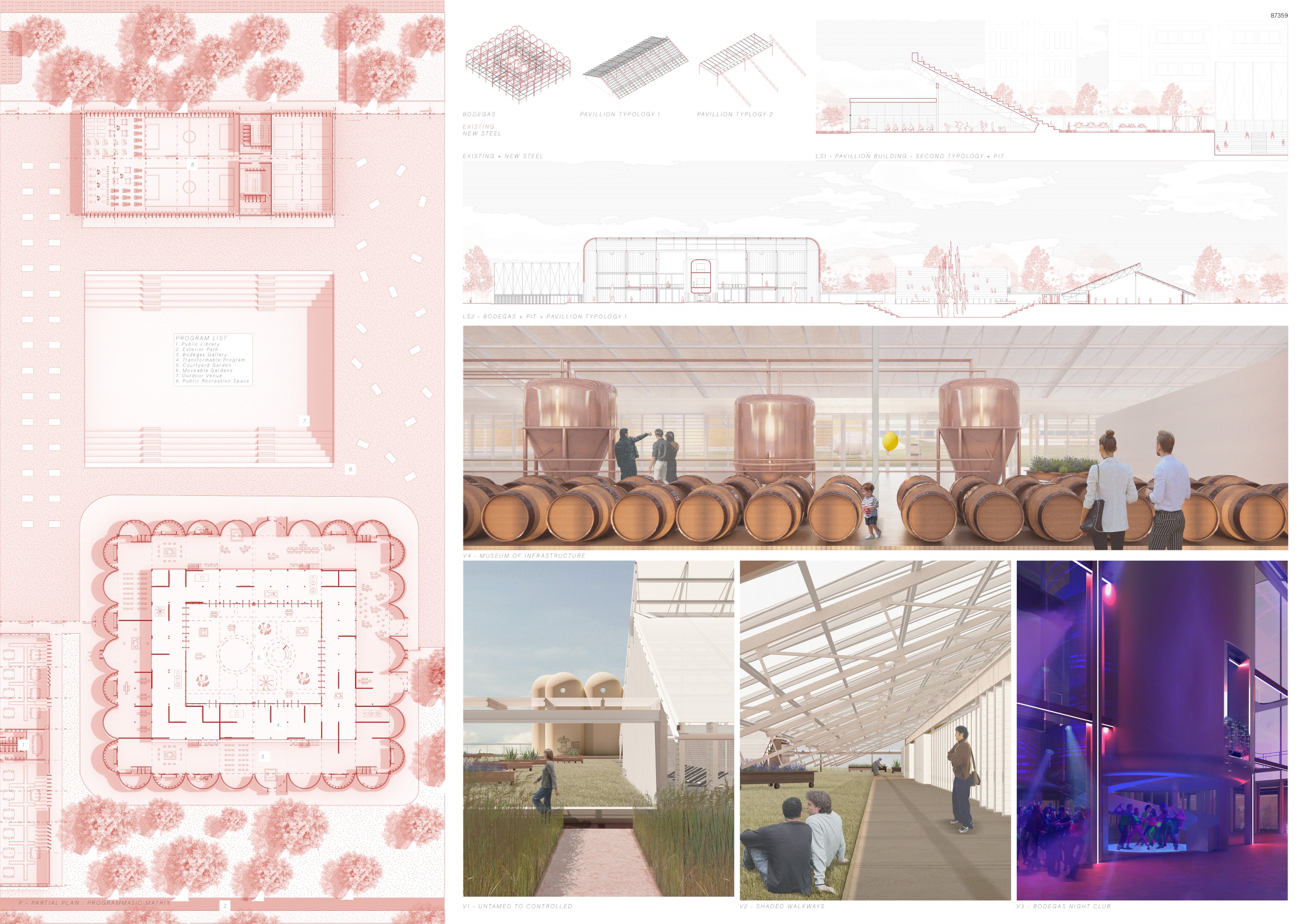 The original Bodegas structure is dismantled into three key elements—roof, wall, and steel frame—each carefully repositioned across the site to serve new spatial and symbolic roles. Roofs become open canopies for gathering and performance;