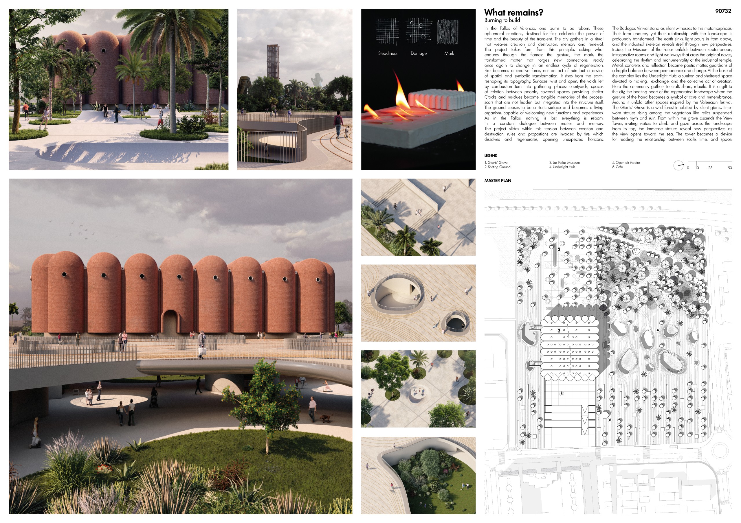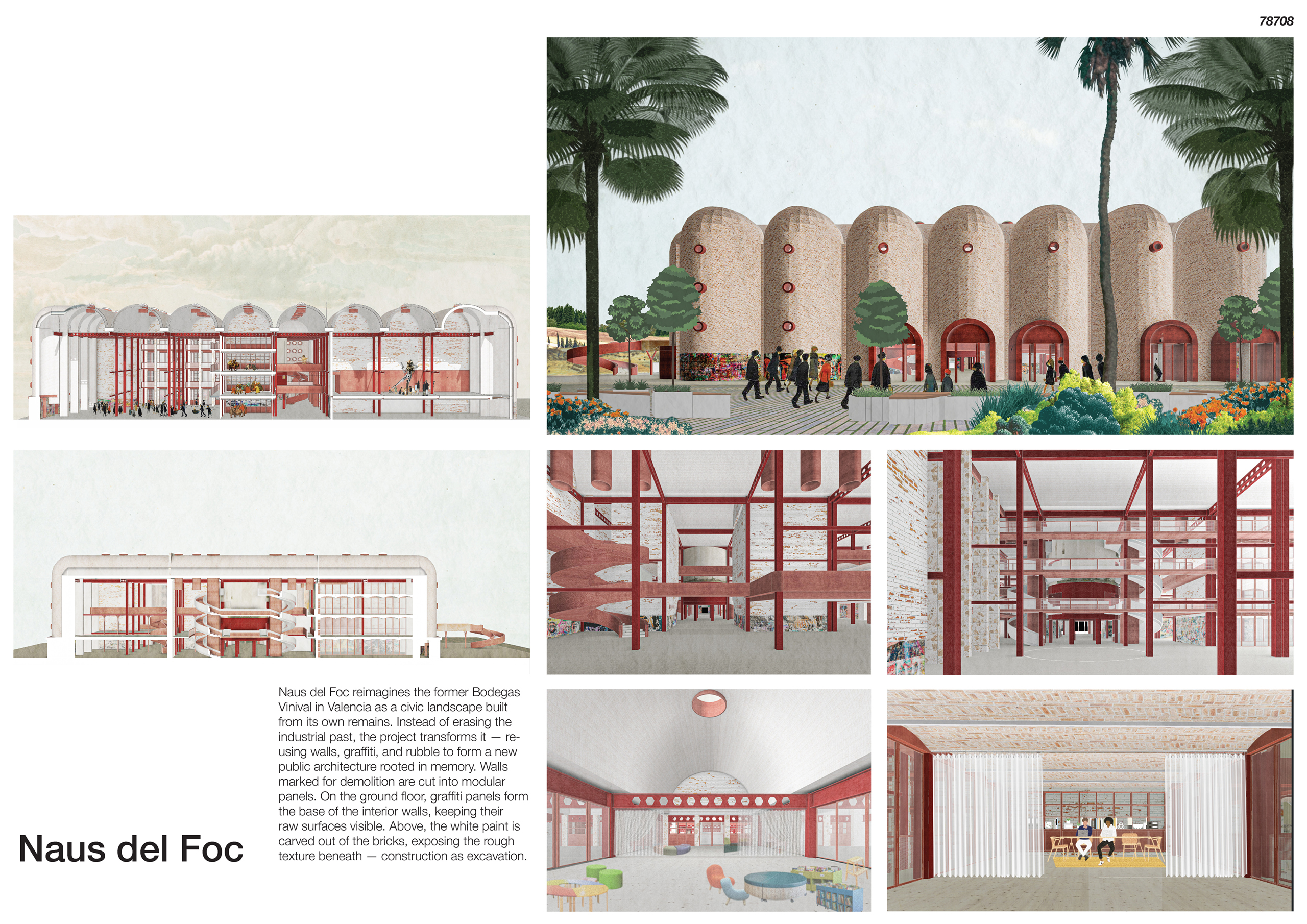 Naus del Foc transforms the former Bodegas Vinival site in Valencia into a civic and cultural landscape built from its own industrial ruins. The project reuses the remains of the complex — walls, graffiti, bricks, and dust — to create a new public architecture rooted in memory. It builds through reuse and transformation, echoing the spirit of Las Fallas, where each cycle of destruction makes space for renewal.