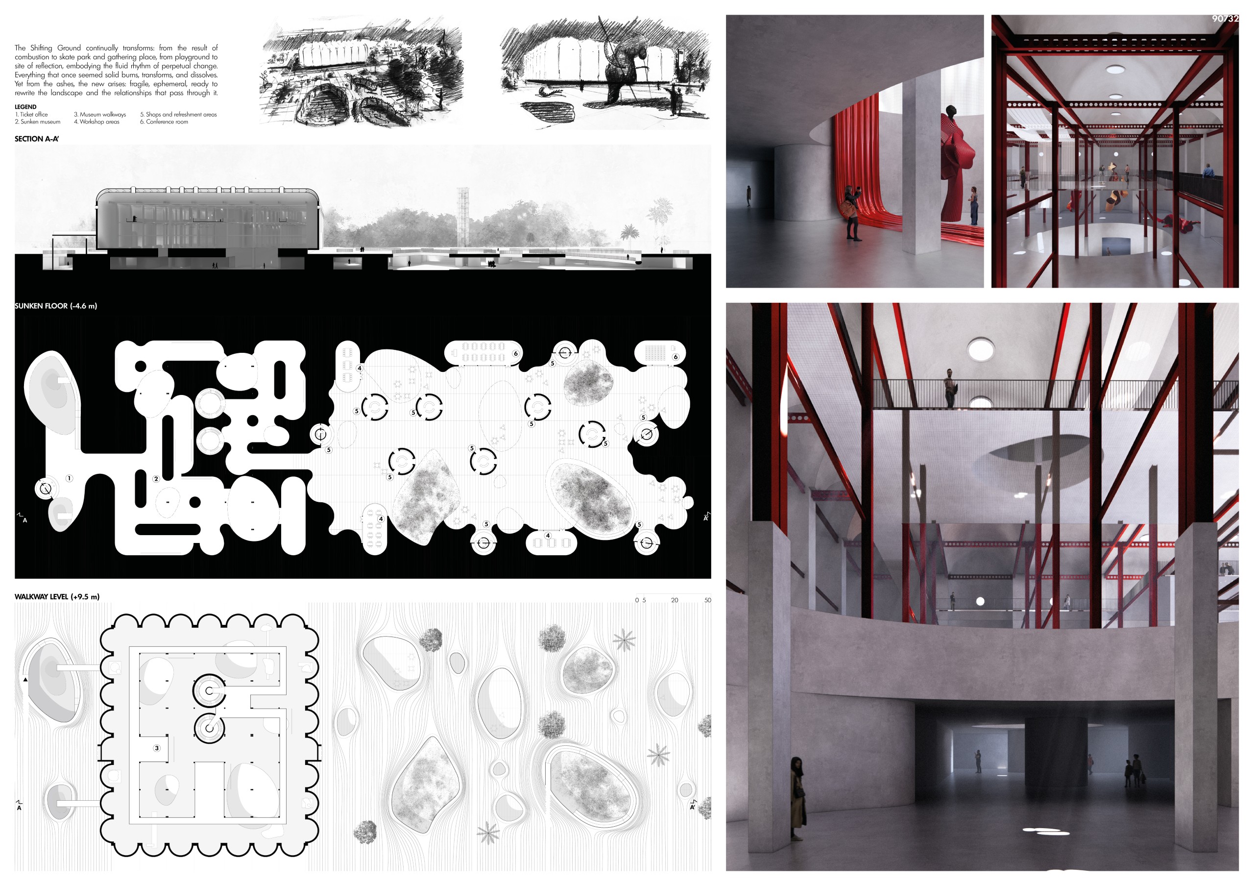 Along the northern façade, a ground excavation defines both a new entrance and an approachsequence. By lowering the terrain, a continuous relationship is established between the urban void and the building. This spatial arrangement allows users to experience the scale of thestructure anew at every level through a layered circulation system.