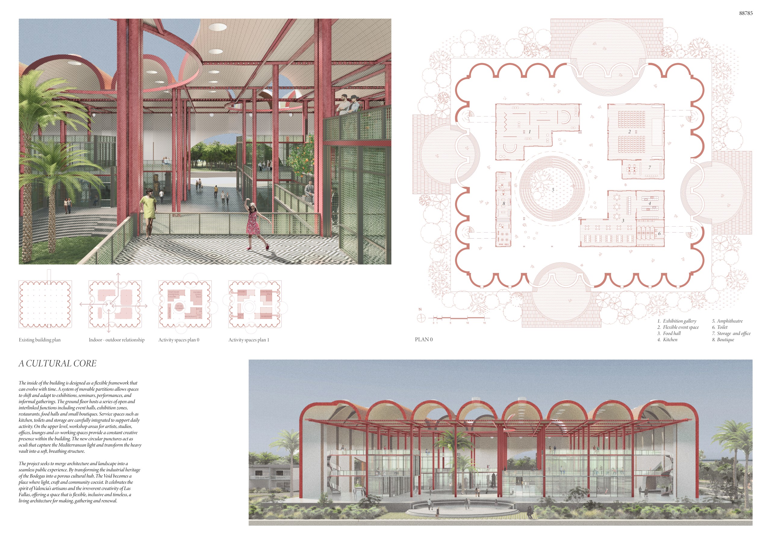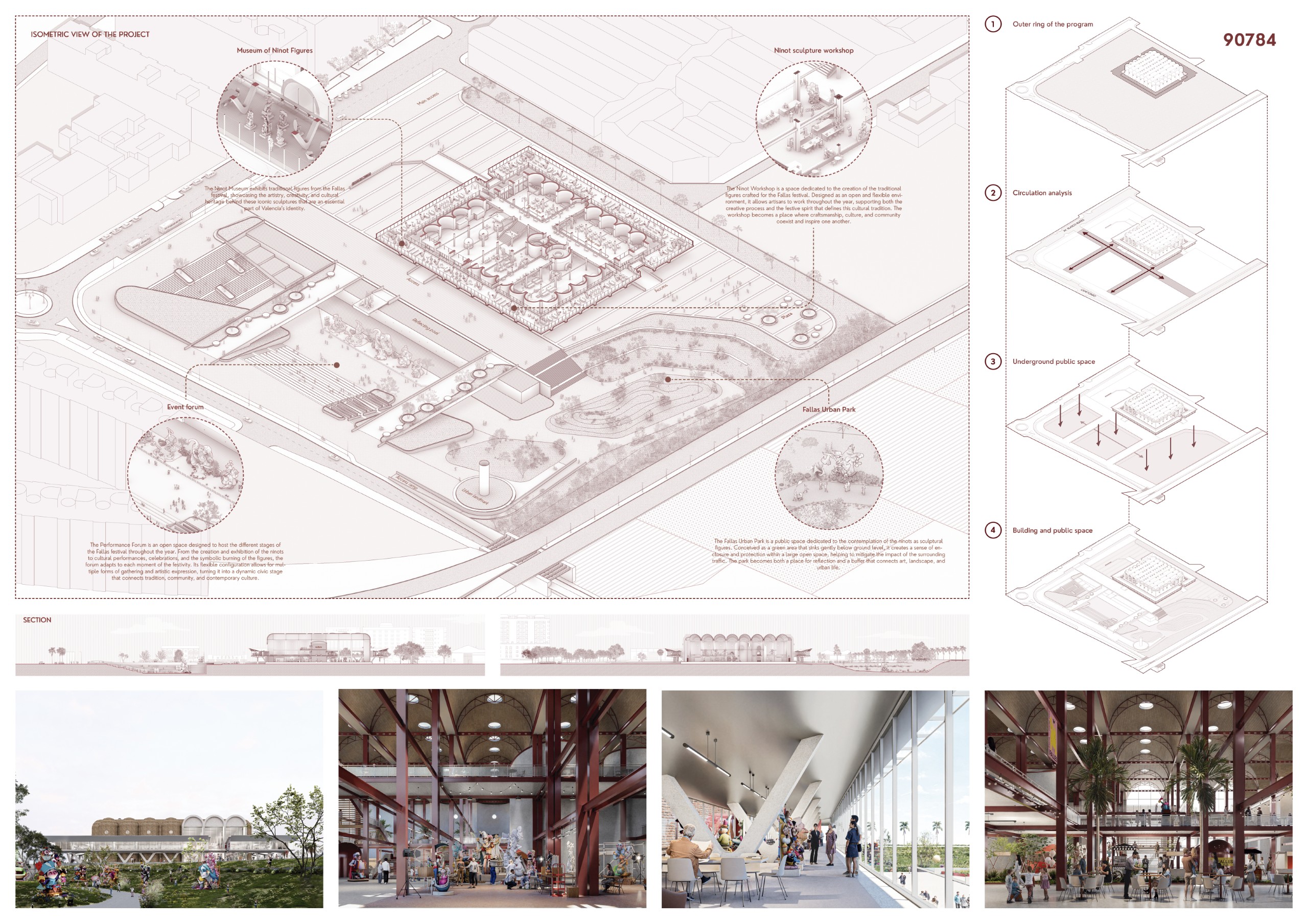 The proposal is based on the dual nature that defines Valencian culture: interior and exterior, creation and celebration. The Fallas embody this duality between the ephemeral and the permanent; between the workshop where the idea is built and the street where the collective experience unfolds. This concept is translated architecturally into a project that organizes productive and public spaces in a continuous sequence, capable of adapting to and coexisting with the pre-existing structure.