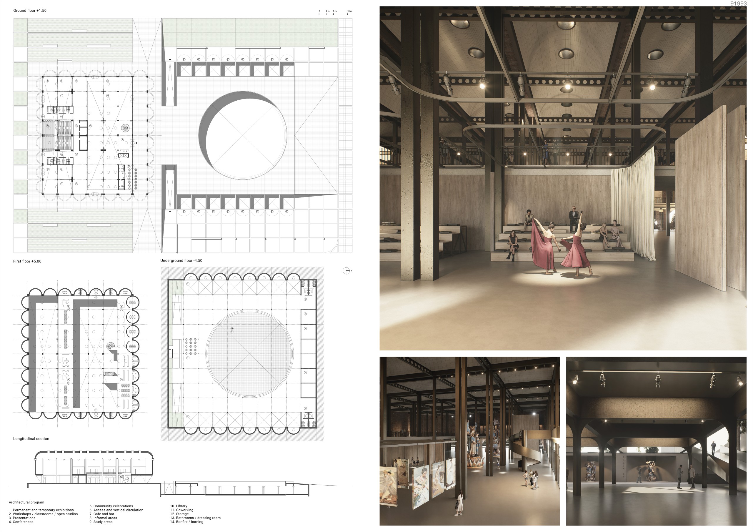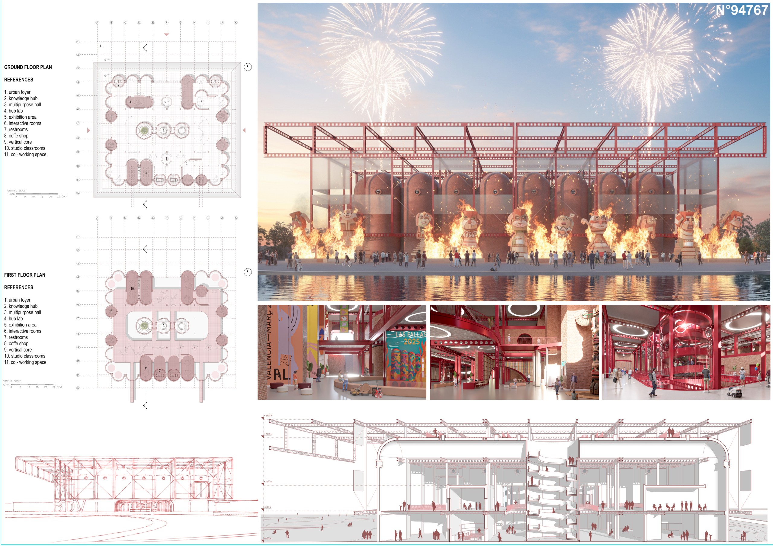 The architectural program is organized along a central axis that preserves the industrial rhythm and spatial quality of the complex. Inside, the main spaces are distributed as follows: an urban market, an information area, workshops for the construction of ninots and other Fallas elements, auditoriums, collaborative and research areas, and a permanent Fallas Museum exhibition. Each of these spaces promotes the continuity between cultural production, learning, and civic participation.