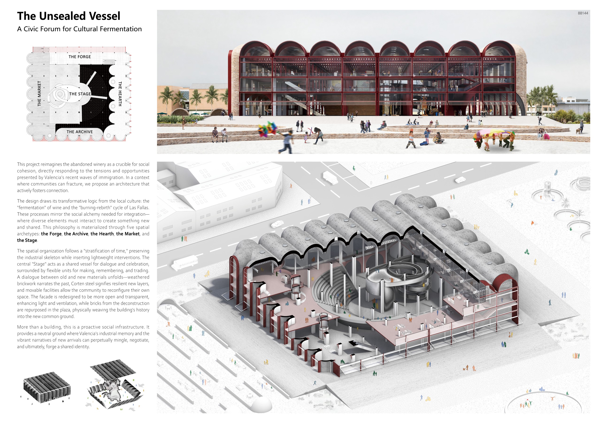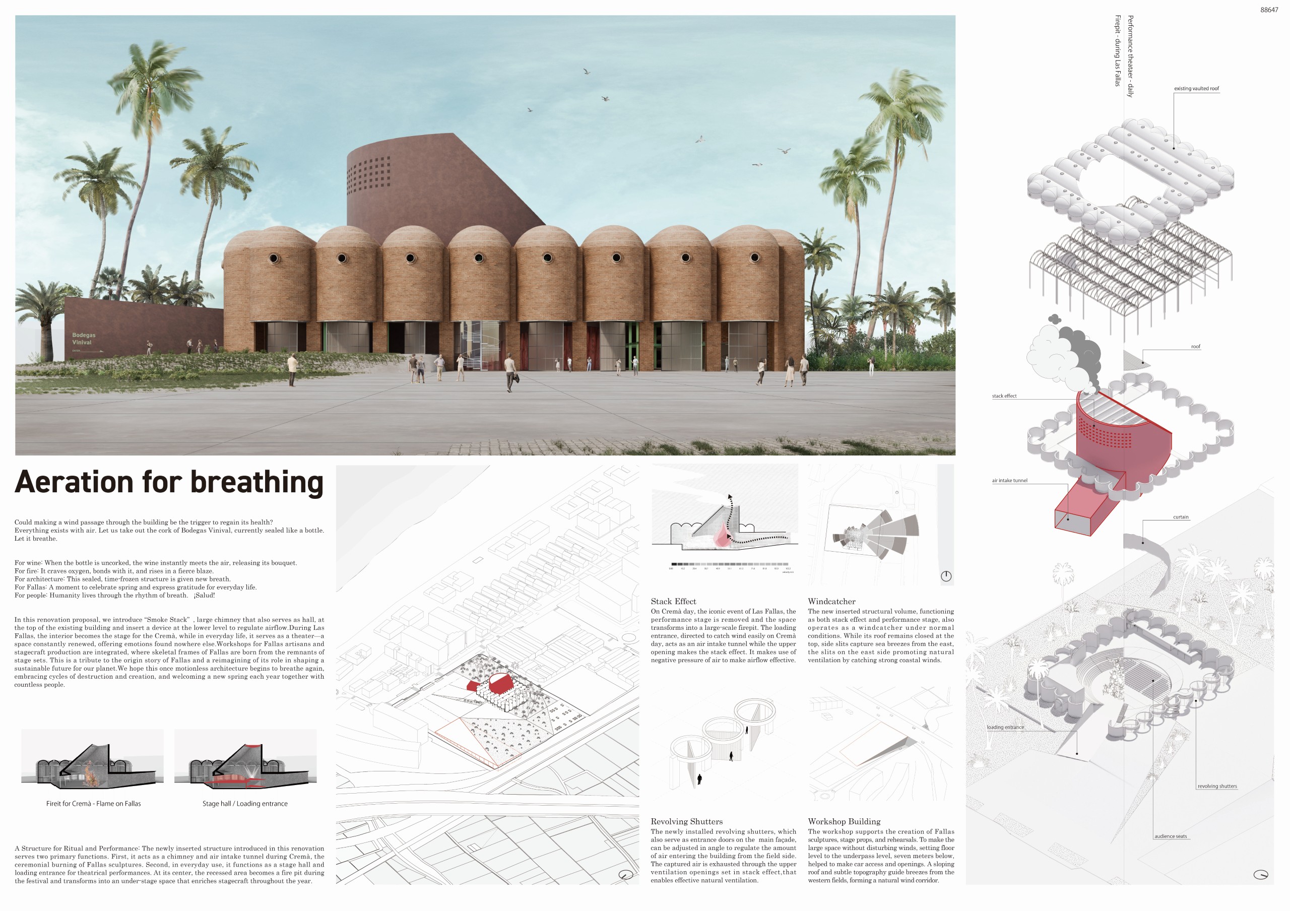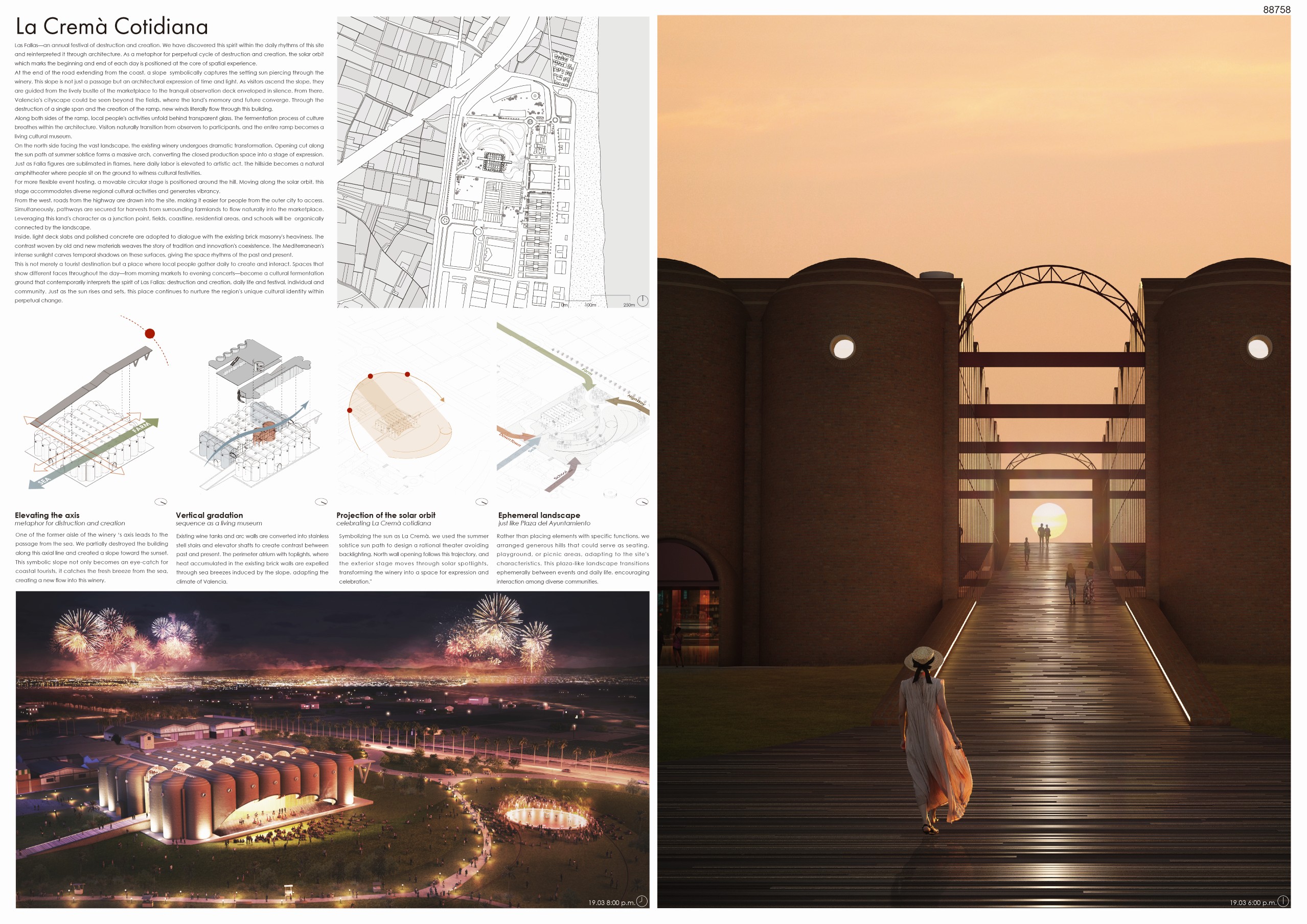 “This proposal stands out for its poetic interpretation of Las Fallas, using the solar-aligned ramp and open-air amphitheatre to create a powerful cultural sequence. It preserves the essence of the Bodegas while opening it to light, landscape and community life.”