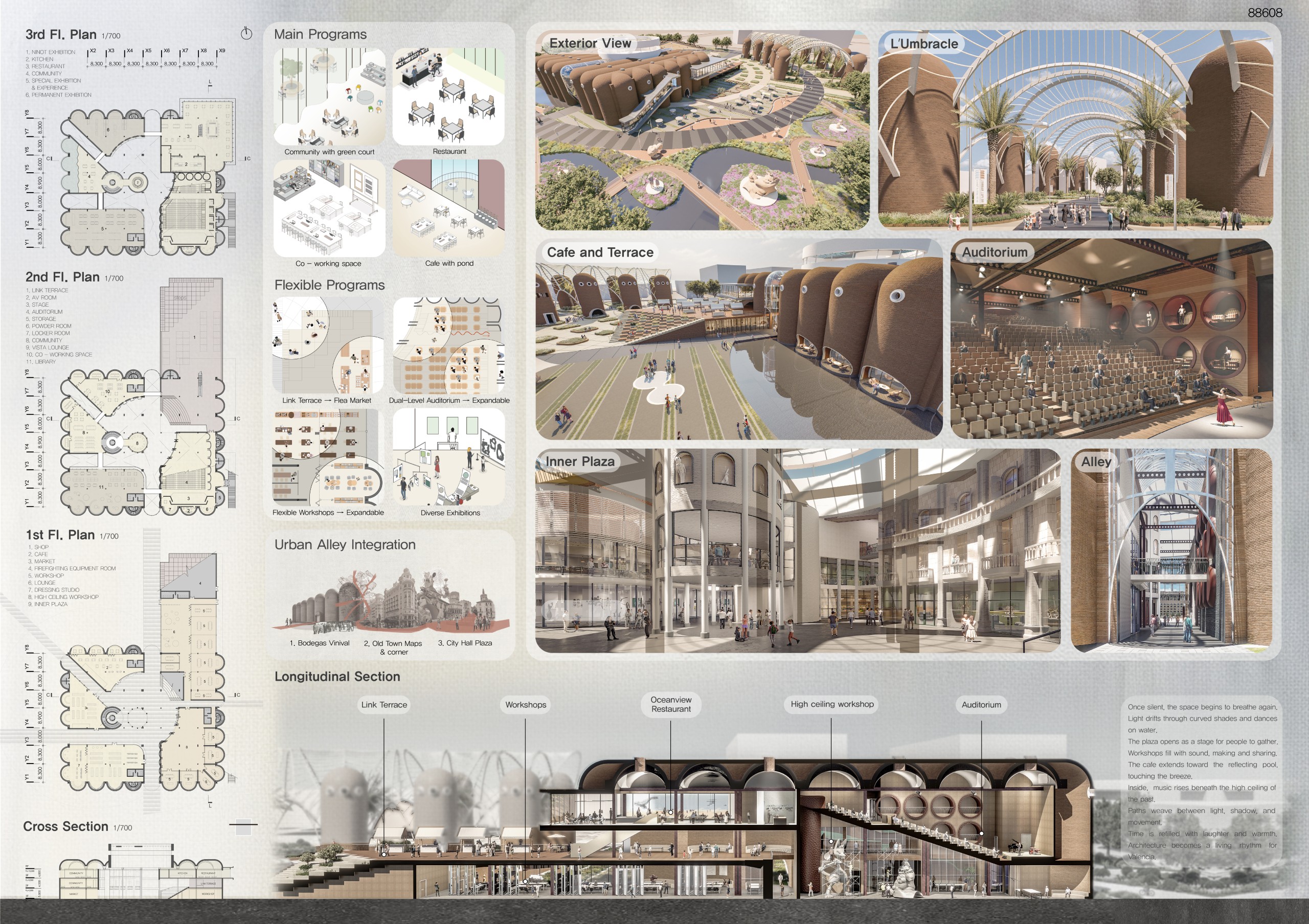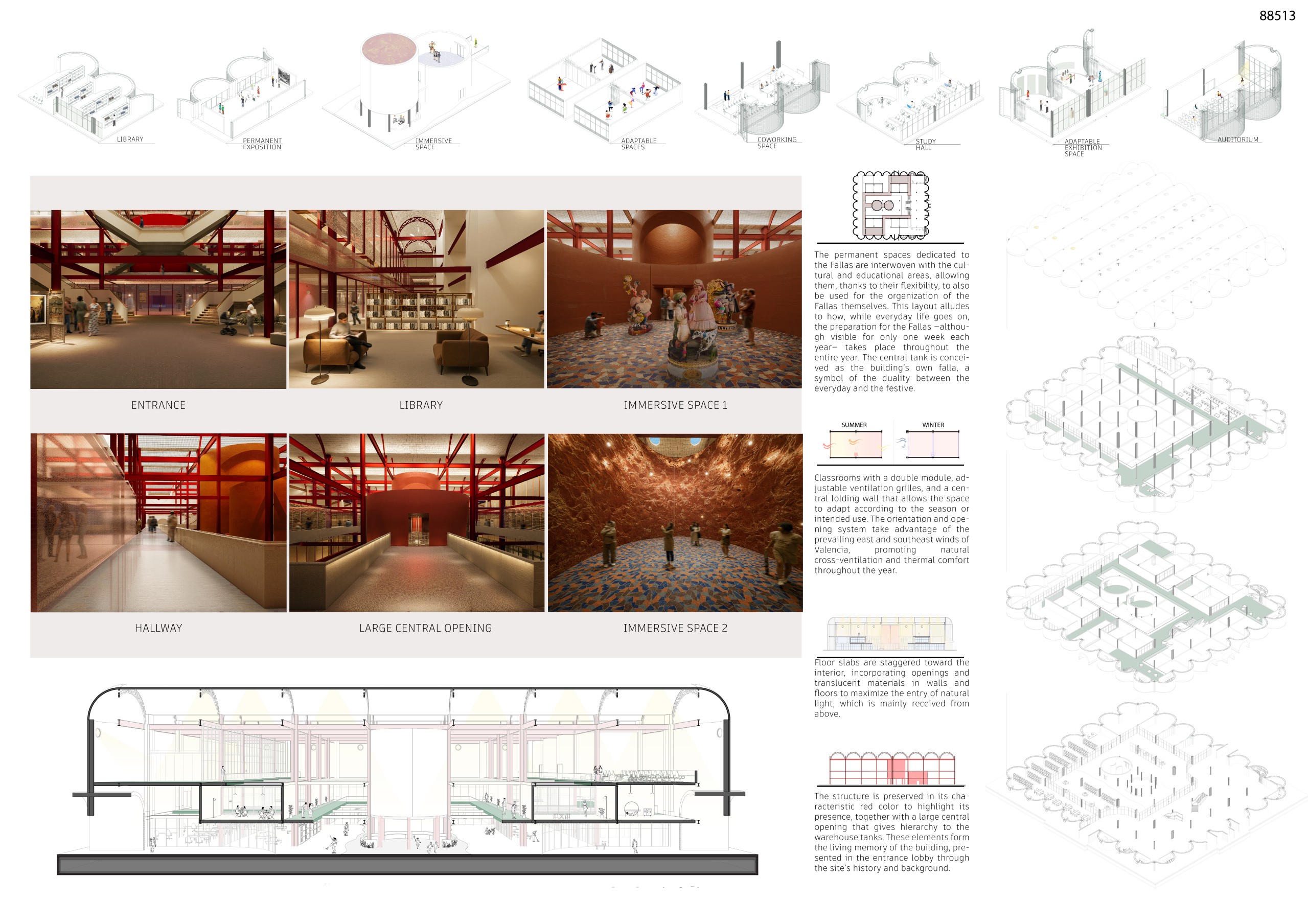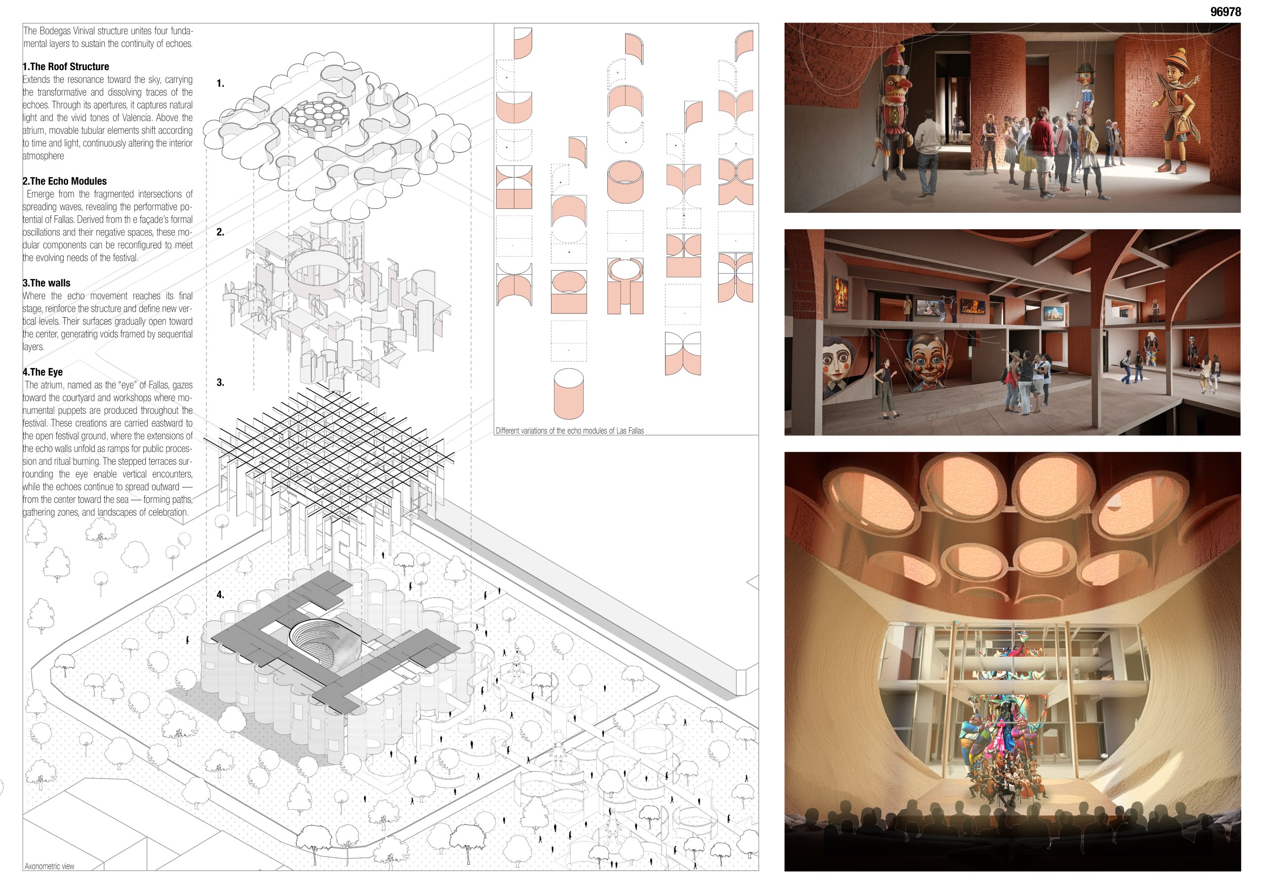 “This proposal stands out for its poetic interpretation of Las Fallas, using the solar-aligned ramp and open-air amphitheatre to create a powerful cultural sequence. It preserves the essence of the Bodegas while opening it to light, landscape and community life.”