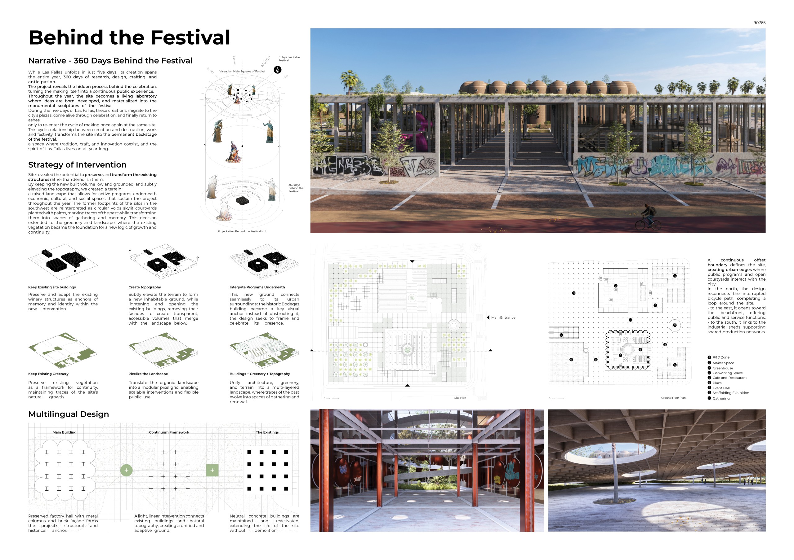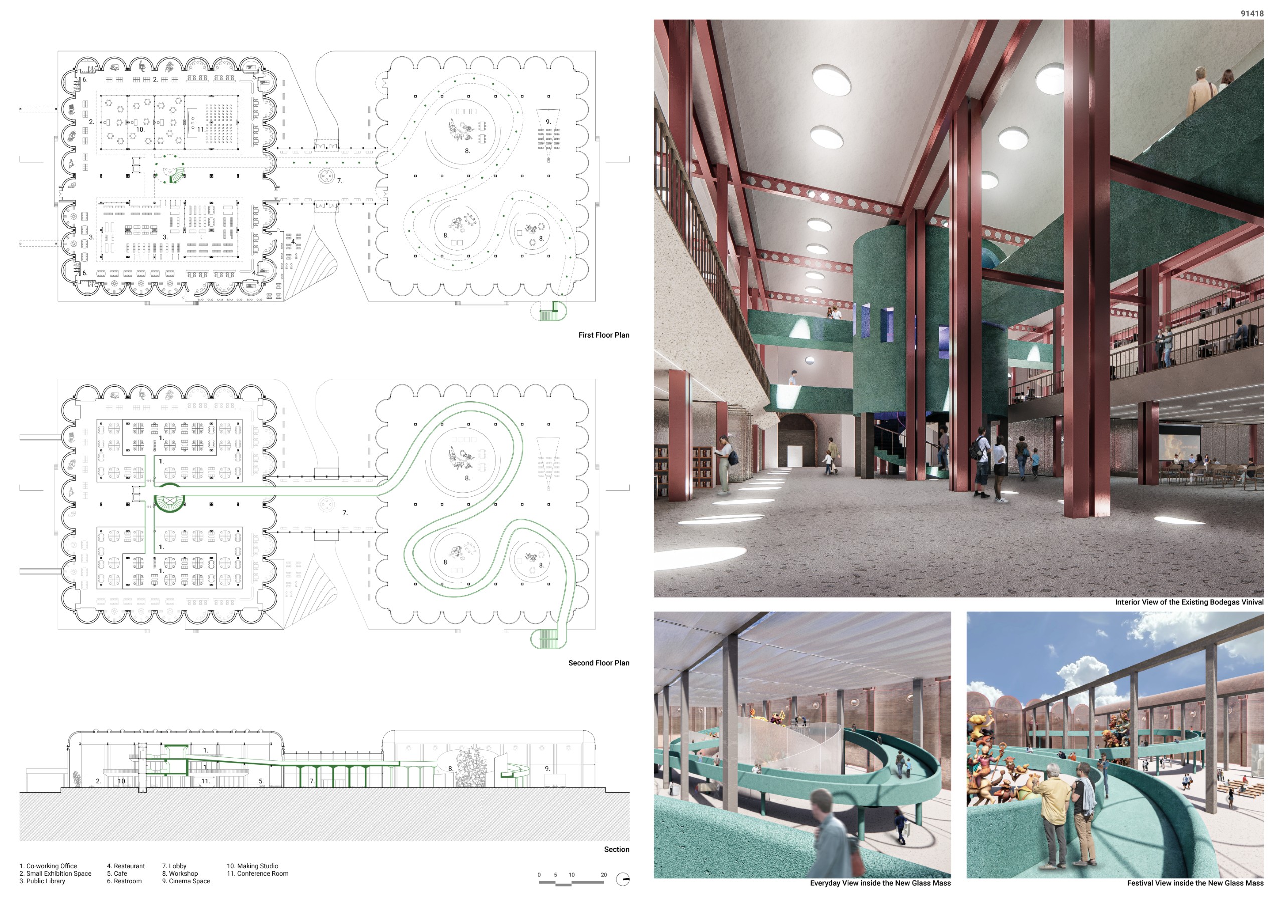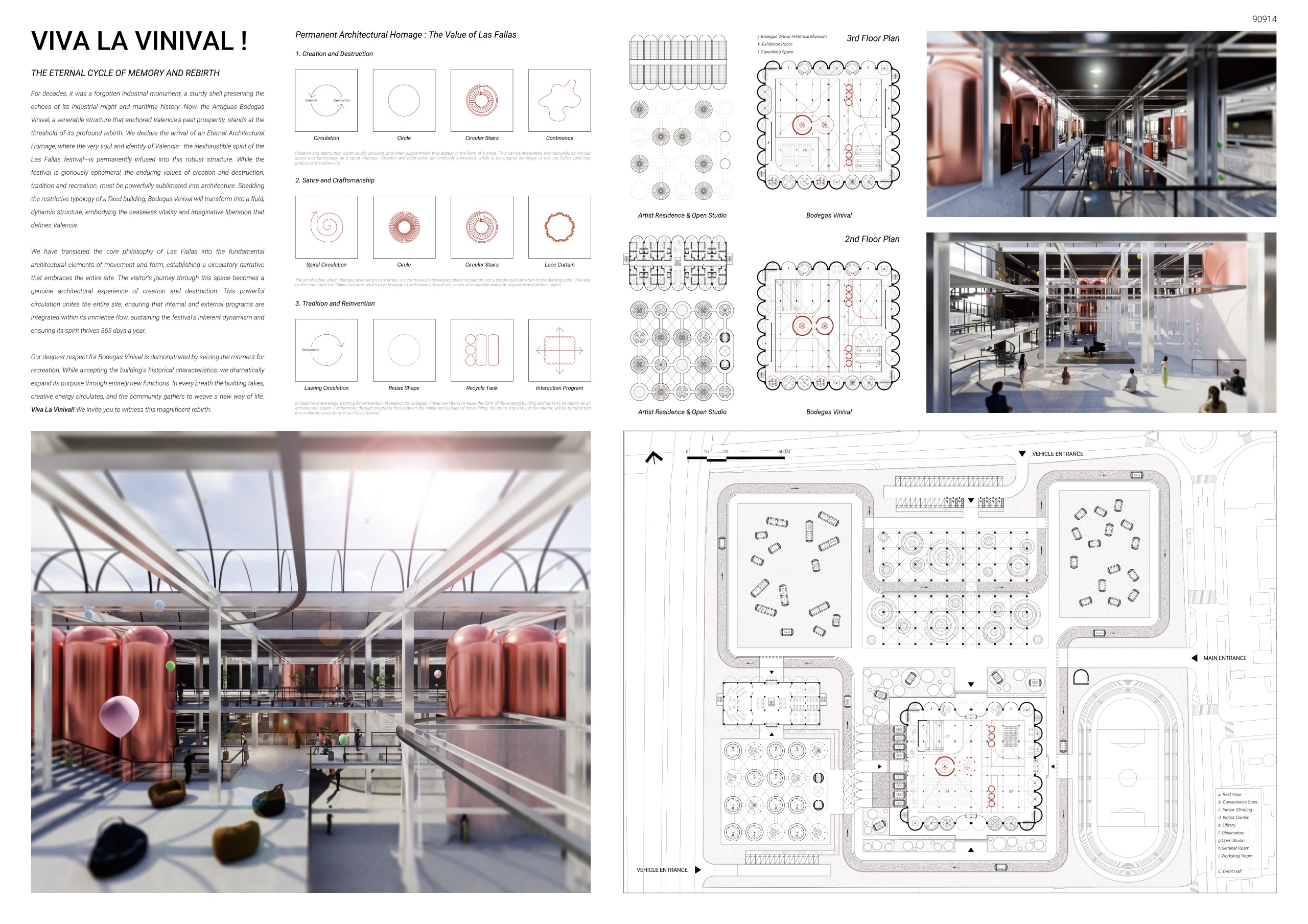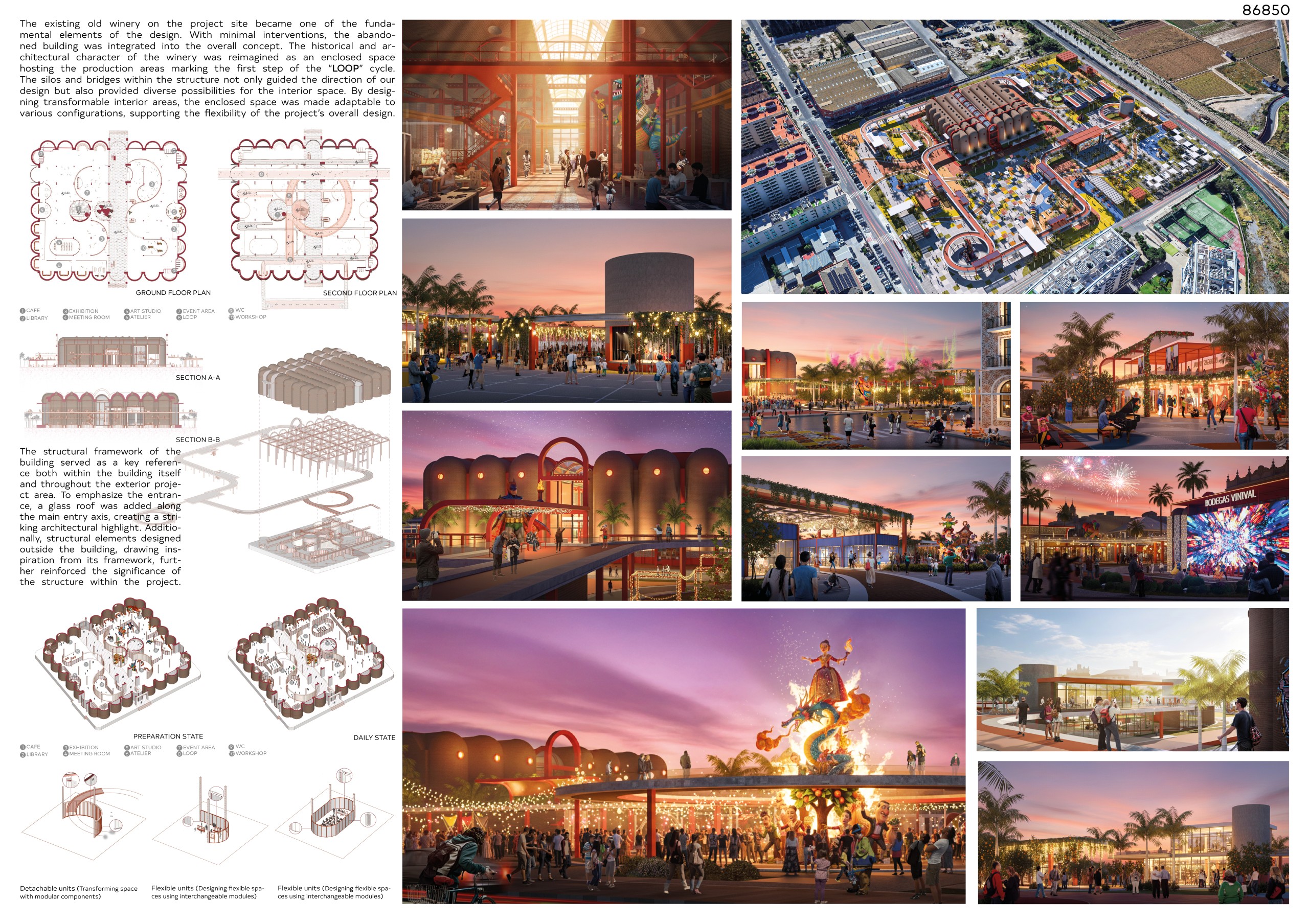 The design adopts the continuous cycle of renewal inherent in Las Fallas, the process of creation, destruction, and recreation, as a fundamental concept. This cycle is then experienced by users as an architectural “LOOP” motif. Through this approach, the dormant Bodegas Vinival has been transformed into a dynamic and lively urban island returned to the city.
