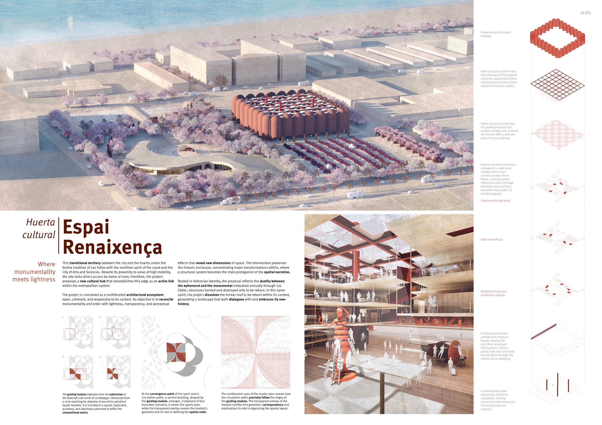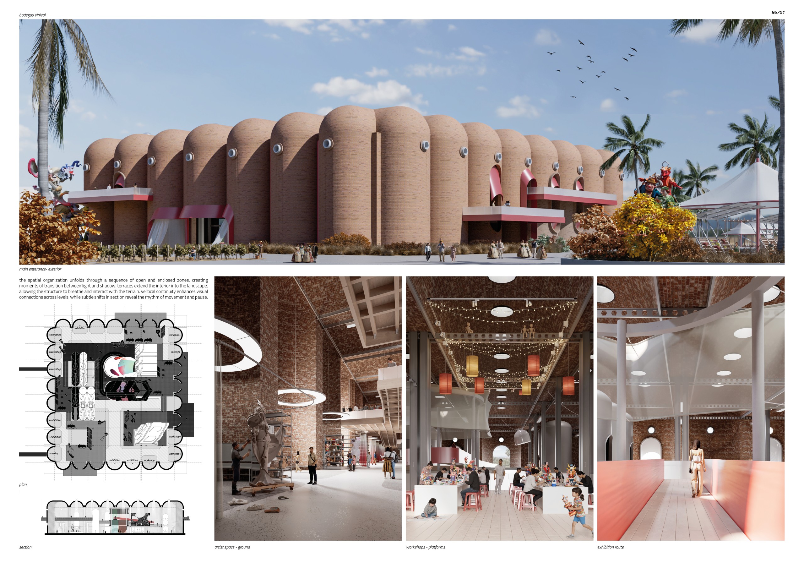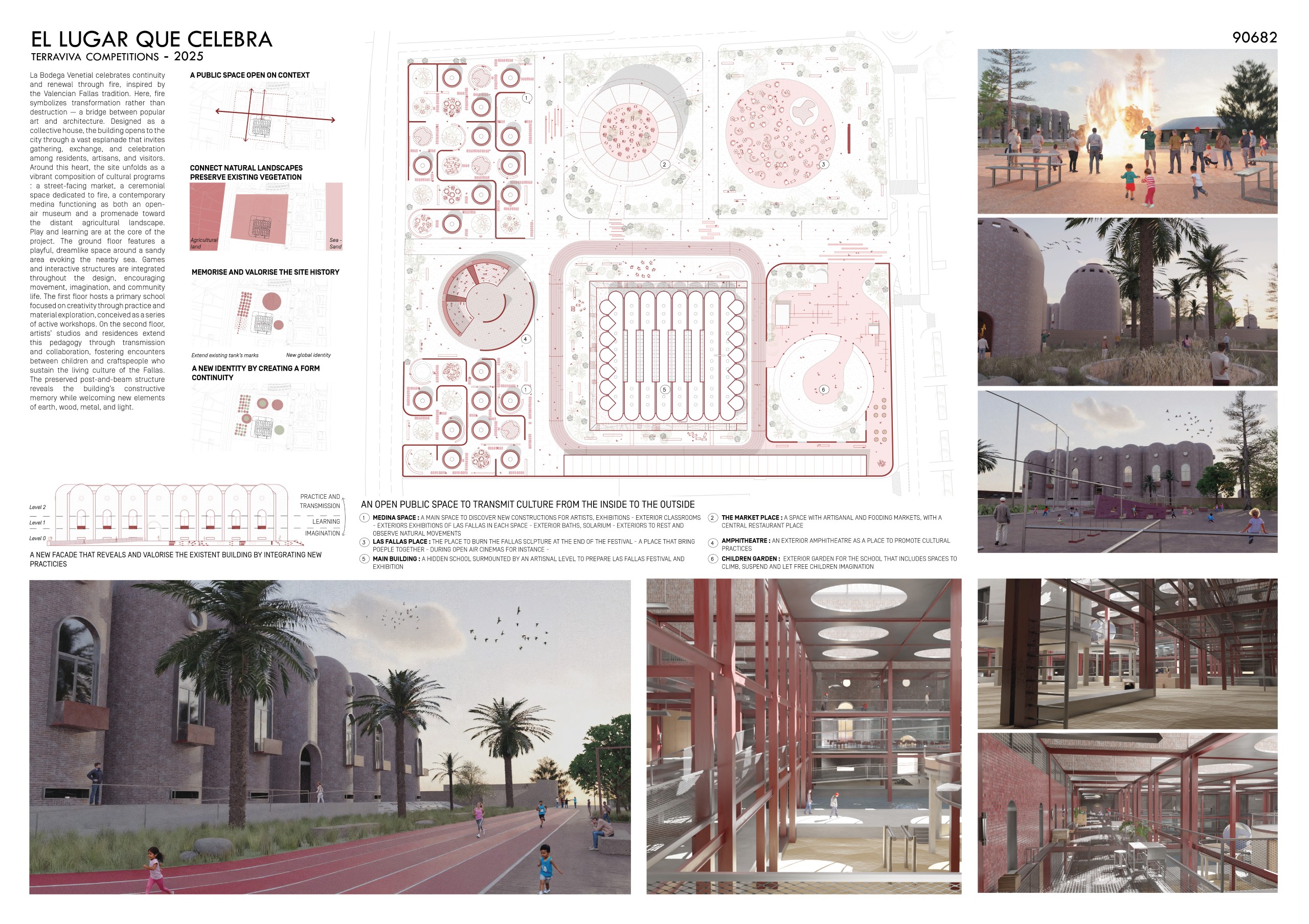 Set within the vibrant coastal landscape of Alboraya, just outside Valencia, the competition invited architects, designers and creatives to reimagine the historic mid-century wine complex as a cultural space shaped by the spirit of Las Fallas. Participants were asked to breathe new life into this former industrial landmark through architectural and landscape interventions that celebrate memory, craftsmanship and reinvention. Whether through bold spatial transformations or subtle reinterpretations of the complex’s structural rhythm, the challenge called for a visionary proposal capable of turning the Bodegas into a dynamic environment for community gathering, creativity and cultural expression. The resulting transformation aimed to establish the site as a living centre for exhibitions, performances, workshops and everyday activity, honouring Valencia’s traditions while opening the doors to new cultural experiences and year-round public use.