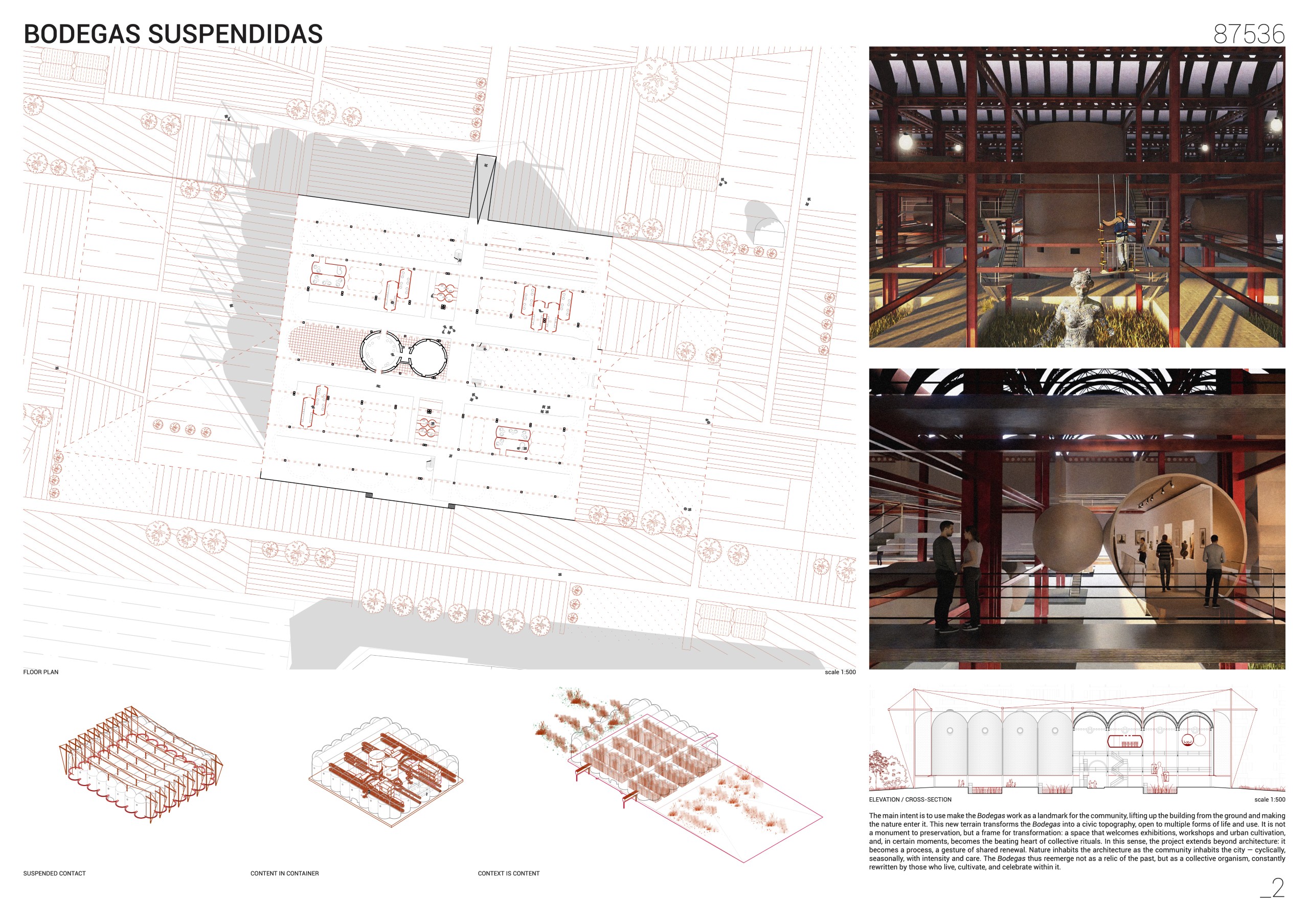 The project begins with the separation between architecture and ground: the emptying and lifting of the masonry shell, encircled and held by a system of cables and tension rods, allows this “third landscape” to inhabit the Bodegas, establishing a direct relationship between inside and outside, between architecture and territory. Inside, the existing containers are reinterpreted as exhibition, workshop, meeting and service spaces. The system of lifting and lowering, together with the periodic alignment of the machines with the existing walkways, creates a fluid and dynamic use, allowing different functions depending on the time of day or season, and enabling, when all machines are lifted, the complete use of the base level for large collective events and festivities, such as Las Fallas.