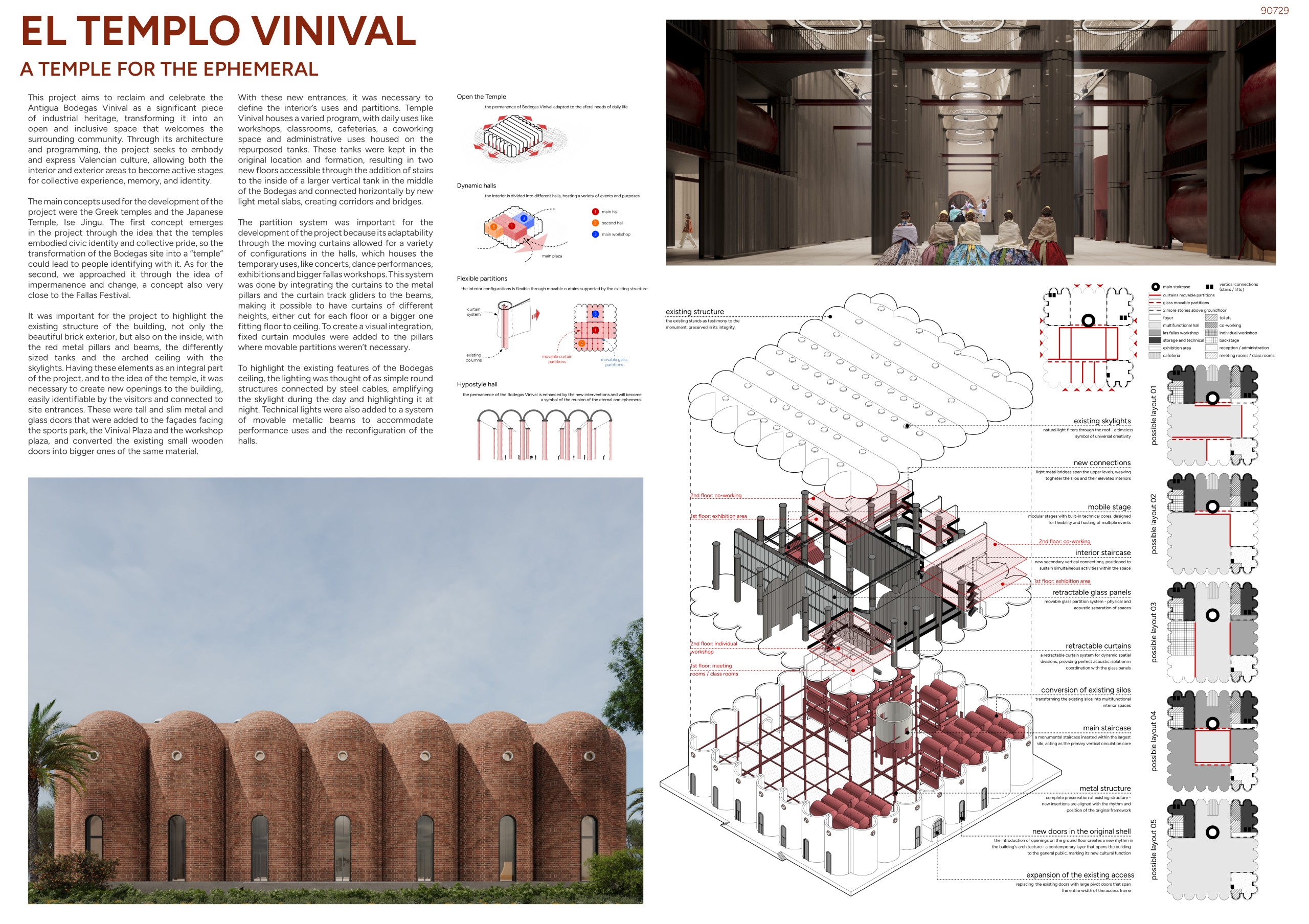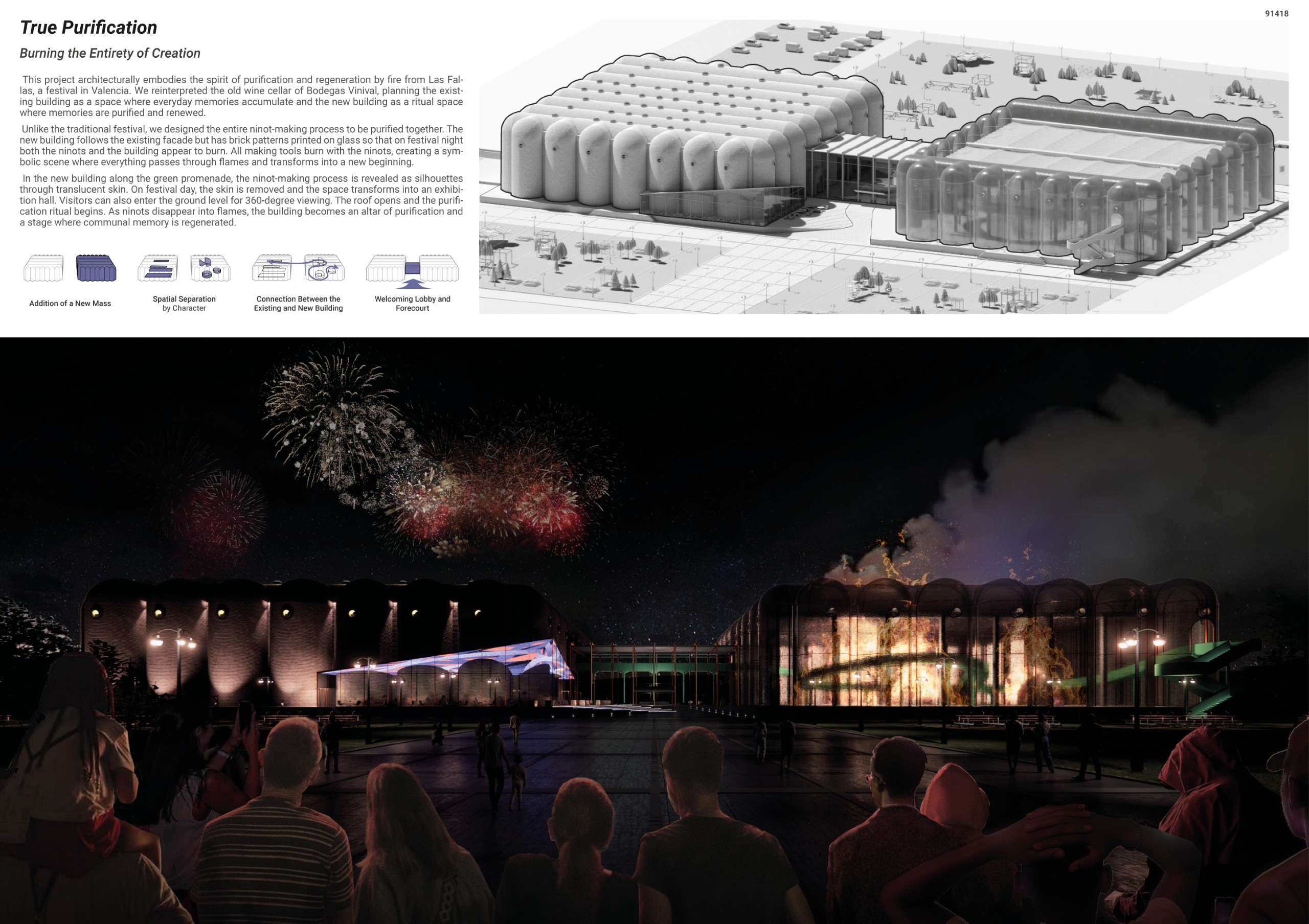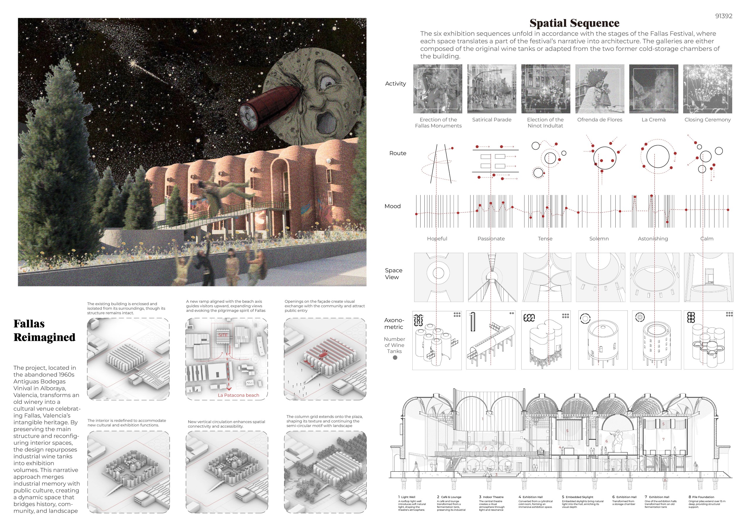 At the core of the project is the fusion of the passionate and vibrant spirit that forms the basis of the Las Fallas tradition—starting with the burning of old wood by carpenters and evolving into a grand festival intertwined with sculptural art—and the powerful industrial architecture of Bodegas Vinival, which symbolizes Valencia’s rich winemaking heritage.