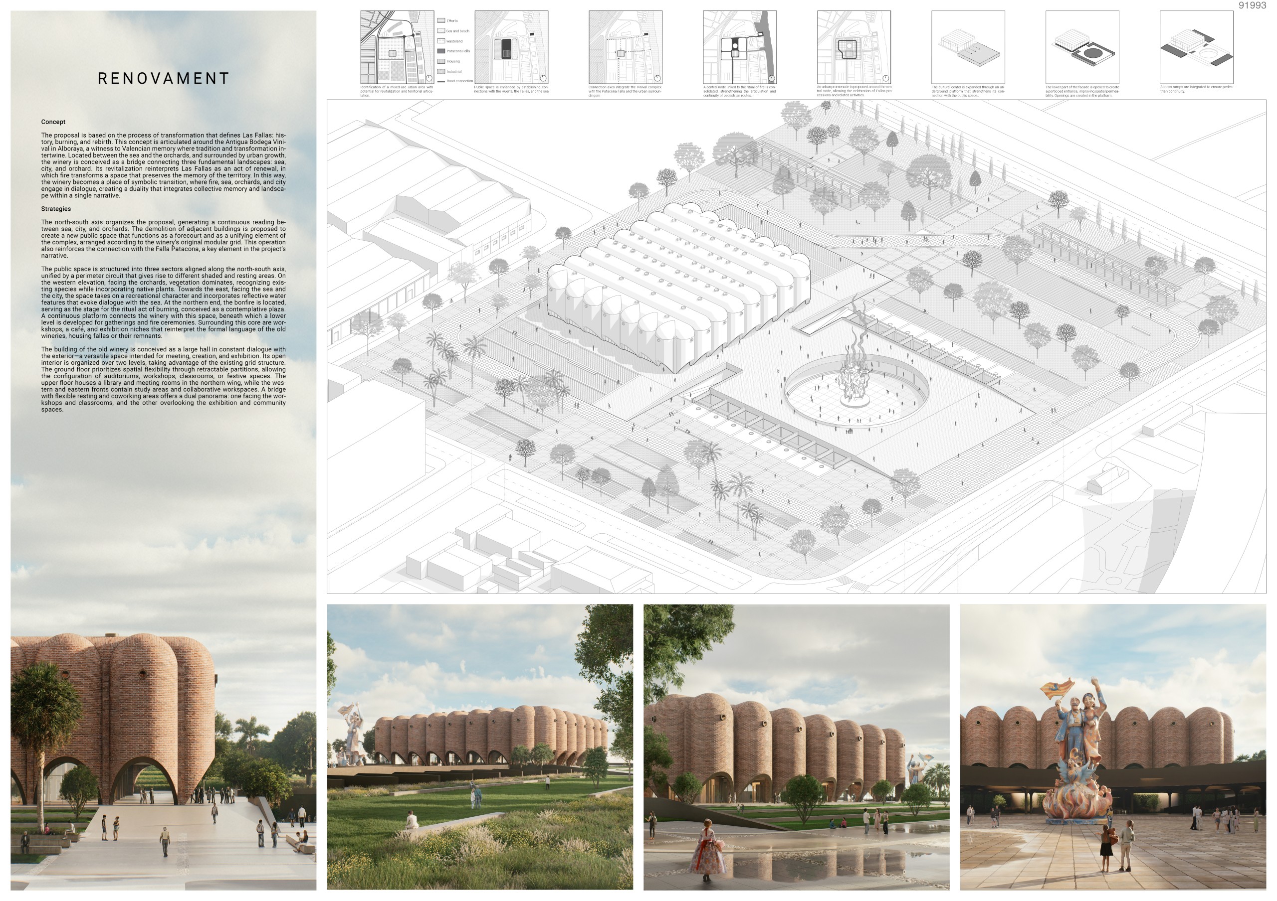 Alboraya, a witness to Valencian memory where tradition and transformation intertwine. Located between the seaa n d the orchards, and urroundedb y urban growth, the winery is conceived as a bridge connecting three fundamental landscapes: sea, city, and orchard. Its revitalization reinterprets Las Fallas as an act of renewal, in which fire transforms a space that preserves the memory of the territory. In this way, the winery becomes a place of symbolic transition, where fire, sea, orchards, and city engage in dialogue, creatinga duality that integrates collective memory and landscape within a single narrative.