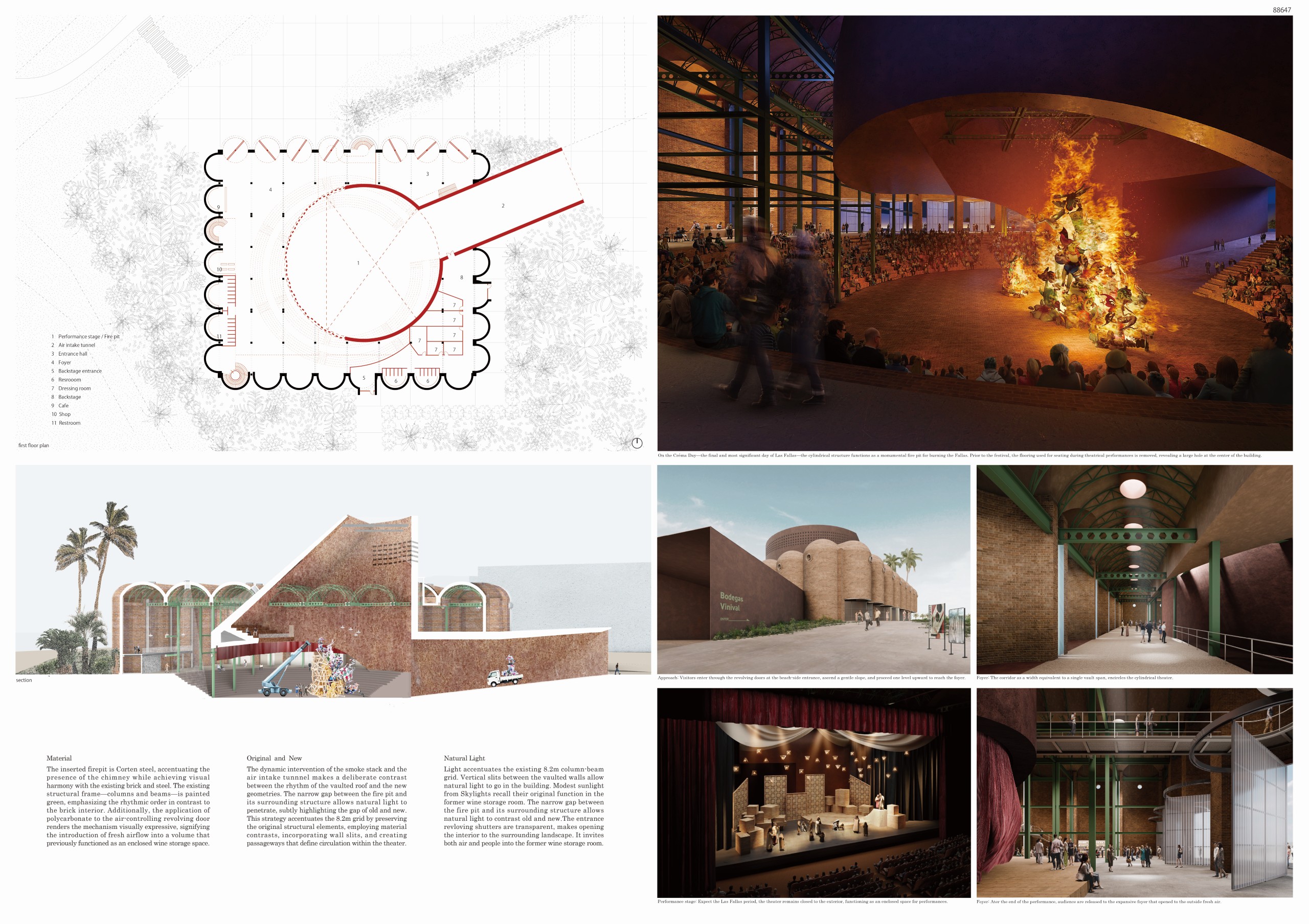 On the north side facing the vast landscape, the existing winery undergoes dramatic transformation. Opening cut along the sun path at summer solstice forms a massive arch, converting the closed production space into a stage of expression. Just as Falla figures are sublimated in flames, here daily labor is elevated to artistic act. The hillside becomes a natural amphitheater where people sit on the ground to witness cultural festivities.