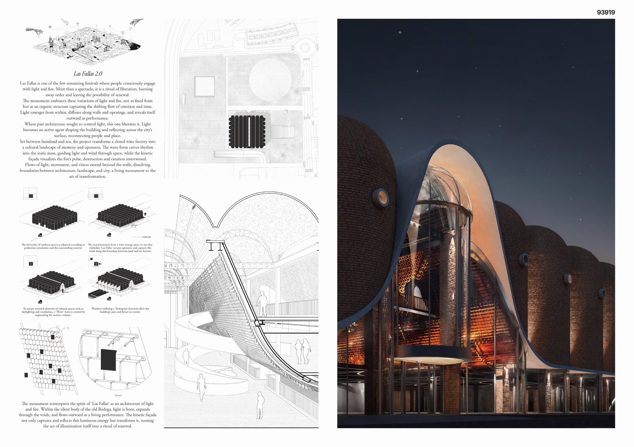 The wave that cuts through the building gives rhythm and dynamism to the static mass, channeling the flow of light and wind. Light entering the interior diffuses along walls and gaps, creating, like the flames of Las Fallas, a rhythm of creation and destruction that is momentary yet powerful.