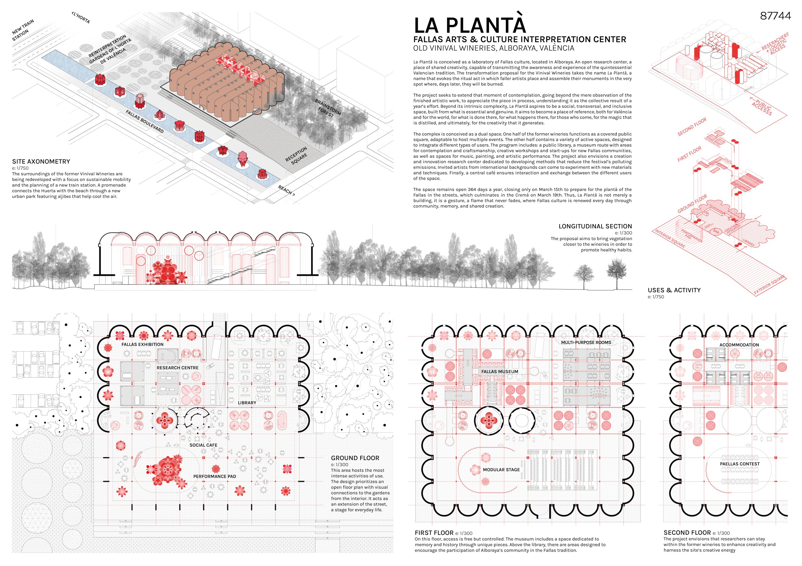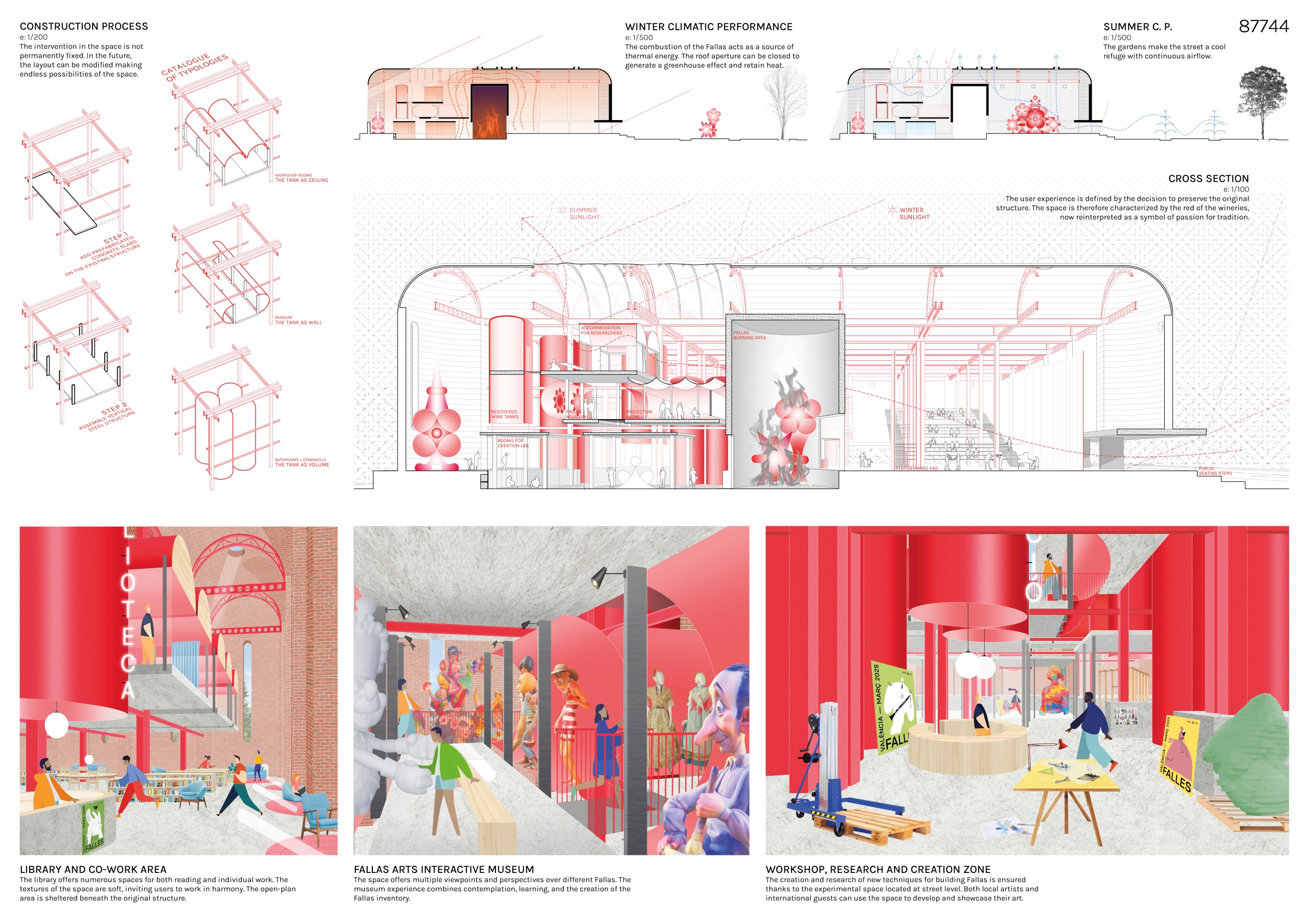 The user experience is shaped by the decision to preserve the original structure and wine tanks, whose distinctive red tones are reinterpreted as a symbol of respect for tradition. Open 364 days a year-closing only on March 15th to prepare for the plant, which culminates in the crema on March 19th-La Plantä stands as a lasting gesture, a flame that never fades. More than a building, it is a living cultural organism where the ephemeral art of the Fallas finds a permanent home for experimentation, sustainability, and the continuous renewal of Valencian identity through community, memory, and shared creation.