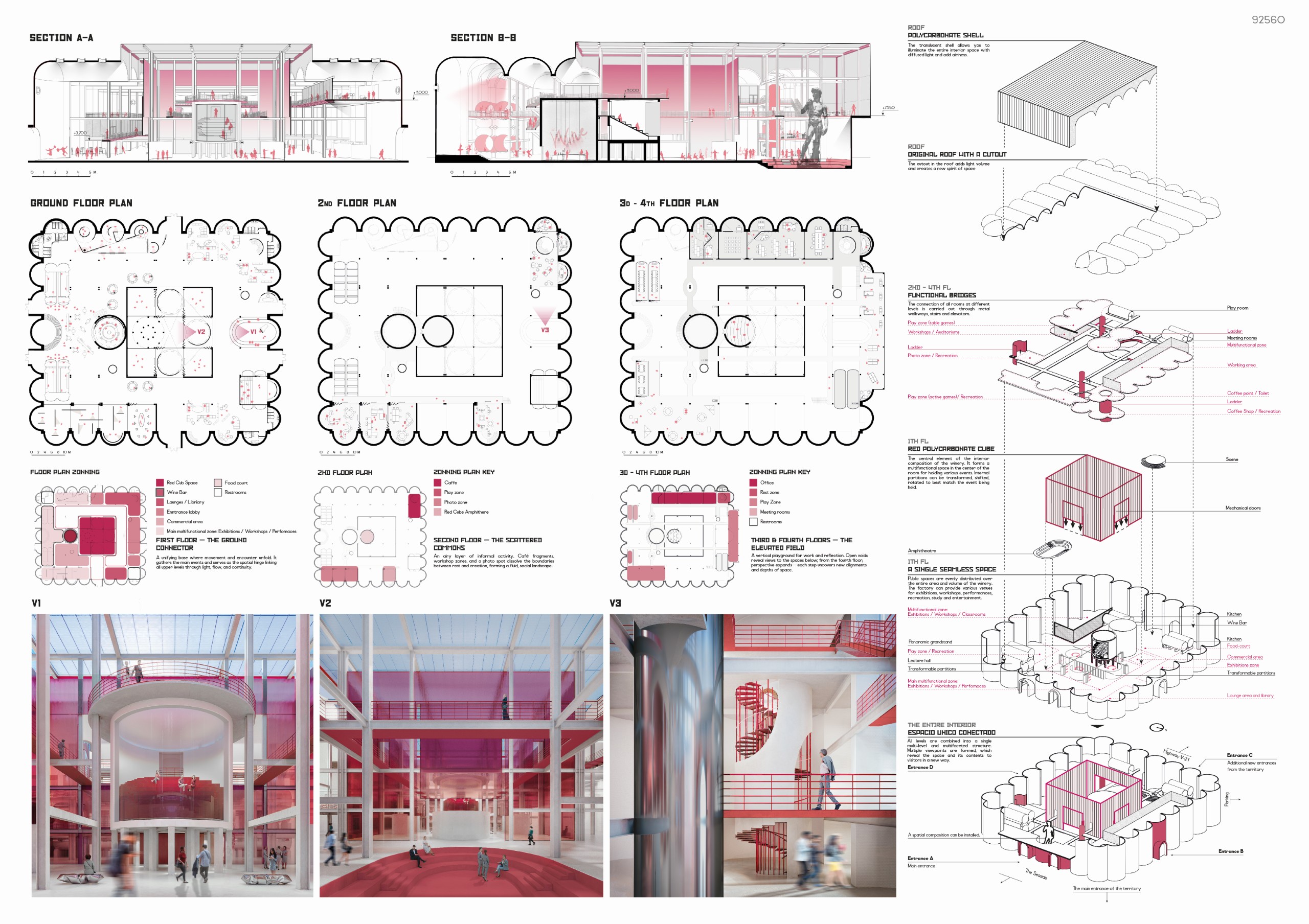Maintaining its industrial identity, the building is reinterpreted through permeable surfacesand open circulation. Sunlight filters into the interior, creating a fluid connection betweeninside and outside. The floor configuration, organized around a linear vertical circulation axiswith amphitheater-like elements, allows users to perceive the building’s monumental scaleand spatial rhythm throughout their movement.